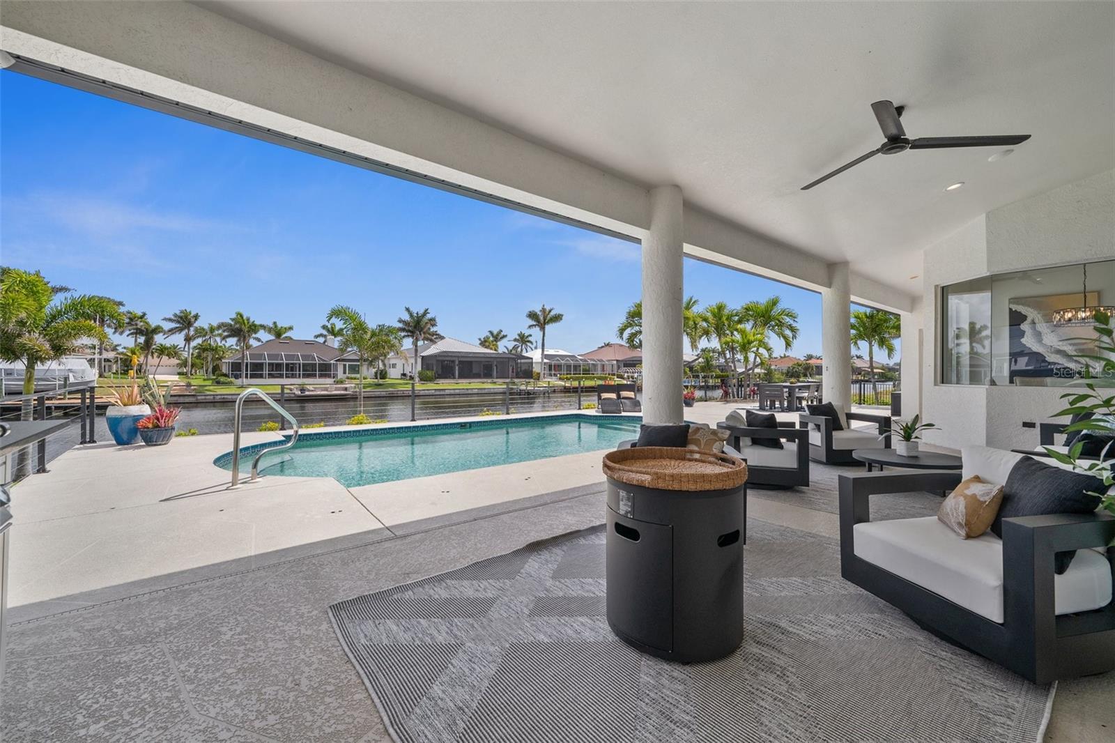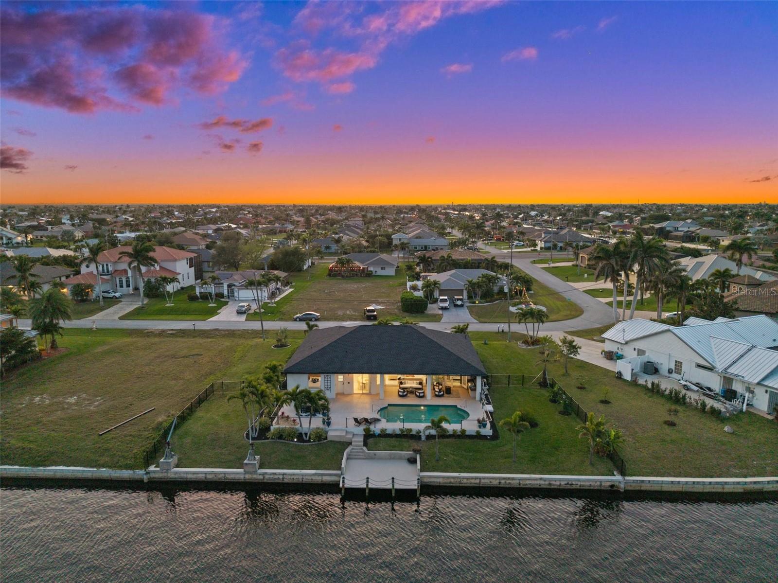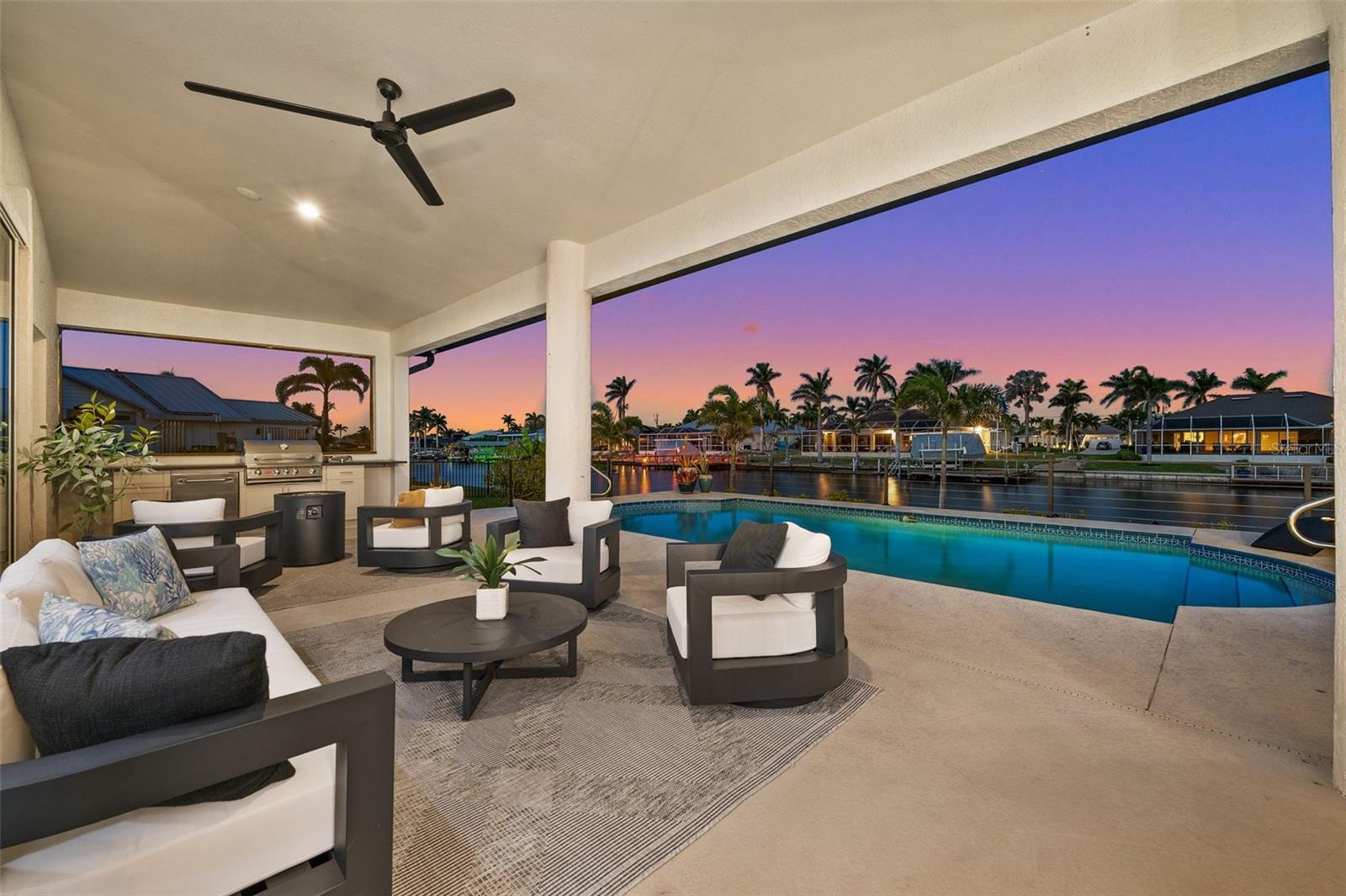 Under contract-accepting backup offers. PRICED TO SELL! Live the ultimate Southwest Florida lifestyle in this beautifully updated FURNISHED Gulf-access pool home located just minutes from Cape Harbour's shops, restaurants, and marina. Situated on an oversized, fenced triple lot with 120 FEET OF GULF ACCESS WATERFRONT, this 3-bedroom, 3-bath home with a private OFICE offers wide canal views and plenty of room to relax and entertain. The open-concept layout features high ceilings, new porcelain tile flooring throughout, and pocketing sliders in the great room for seamless indoor-outdoor living. The island kitchen is updated, modern and coastal, with quartz countertops, stainless appliances, a breakfast bar, upgraded lighting, and a new tile backsplash. The spacious primary suite includes French doors to the lanai, a walk-in closet, and a fully remodeled en suite bath with dual sinks, a freestanding soaking tub, and a glass-enclosed shower. Two guest bedrooms, a dedicated office, a full guest bath, and a pool bath provide comfort and flexibility for family or visitors. Outside, enjoy a large covered lanai, brand-new outdoor kitchen with built-in grill and beverage fridge, and an expansive pool deck surrounding the sparkling pool. Recent upgrades include whole-house re-piping, a new electrical panel, new water heater, new dishwasher, remodeled bathrooms, updated lighting and fixtures, fresh interior and garage paint, and new landscaping. A circular driveway and lush tropical setting enhance the curb appeal. With quick access to open water and NO FLOODING during Ian, Helene, or Milton, this is a true Cape Coral waterfront retreat. ROOF 2023 AC 2025 POOL HEATER 2025