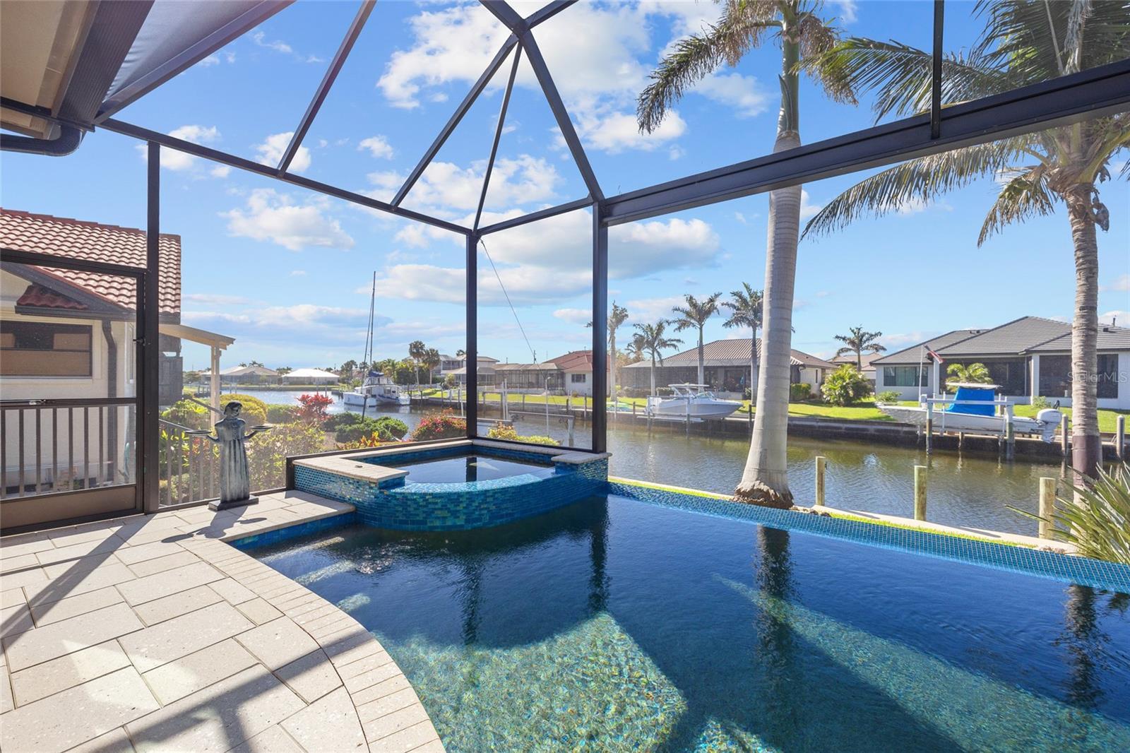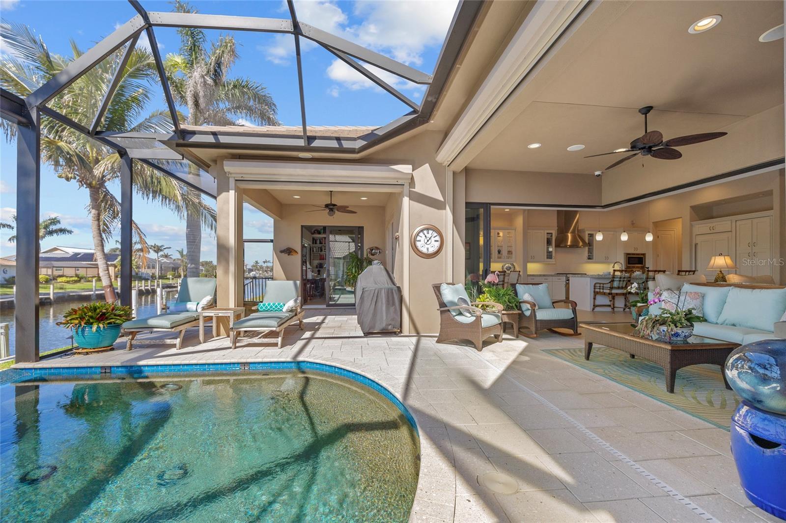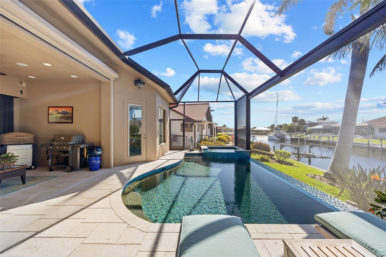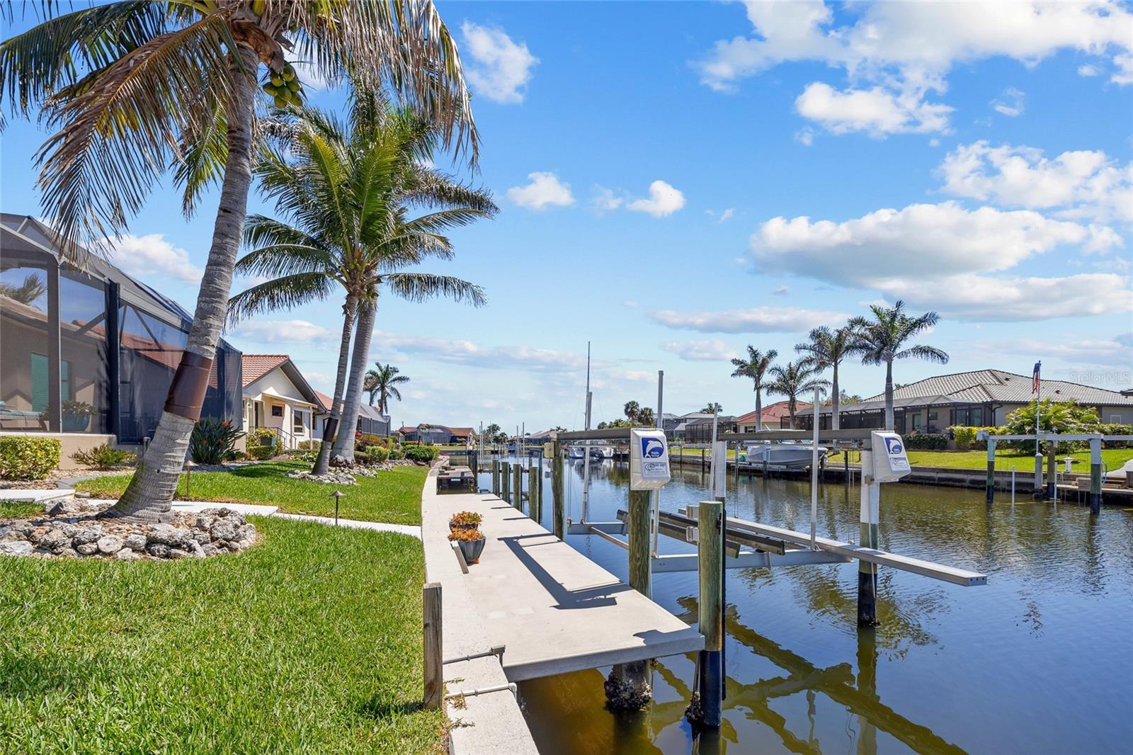 Punta Gorda Isles! Stunning 3 bedroom plus office, 3 bath, 3-car garage waterfront pool home built by prestigious PGI Builders with quick sailboat access to Charlotte Harbor leading to the Gulf of Mexico via Ponce Inlet! For the boating enthusiast, this south facing lanai home features a remote-operated boat lift currently set for a 10,000 lb. boat with power available for up to 20,000 lbs. plus electric and water dockside. Custom built to withstand 200 mph winds and offers PGT impact windows and motorized Storm Smart hurricane shades ensuring peace of mind. Step inside to an elegant open floor plan rich in every detail including coffered and tray ceilings, abundant can lights with dimmer switches for customizable ambiance, crown molding, 8’ doors, motorized shades and high-quality porcelain tile throughout. The great room features separate bar and zero-corner slider to lanai seamlessly blending indoor and outdoor living space. The kitchen is a chef's delight, equipped with a propane gas stove, built-in refrigerator, soft-close cabinets, pull-out drawers, discreet under-cabinet outlets, center island with breakfast bar and large pantry with hidden entrance next to refrigerator. The primary suite features an abundance of natural light, dual custom walk-in closets and a luxurious ensuite with dual vanities, soaking tub, walk-in shower and Toto smart toilet. Split floor plan provides privacy for all. The outdoor entertaining area offers covered lanai, sparkling heated PebbleTec pool and spa with fountain and waterfall features plus panoramic screen to enjoy unobstructed water views. A 500 gallon in-ground propane tank powers Generac whole house generator, pool and spa heater, outdoor grill, and stovetop. Additional special features include custom closet systems in all bedrooms, an overabundance of storage space, state of the art security system with four exterior cameras, surround sound audio/visual setup with ceiling speakers throughout, Kinetico water filtration system, front door retractable screens, automatic irrigation system to water potted plants on lanai and cabana, plus lush tropical landscaping and automatic exterior landscape lighting system surround the home providing amazing curb appeal. Nestled on a quiet cul-de-sac street in a popular golf and boating community, this home is just minutes from St. Andrews South Golf Club, the Yacht Club, Fishermen's Village, and the historic downtown area of Punta Gorda. Enjoy access to arts, community events, entertainment, world-class fishing, boating, fine dining, and beautiful parks, as well as easy access to the SWFL gulf beaches. Don't miss your chance to own this waterside treasure! Schedule your private showing today!
