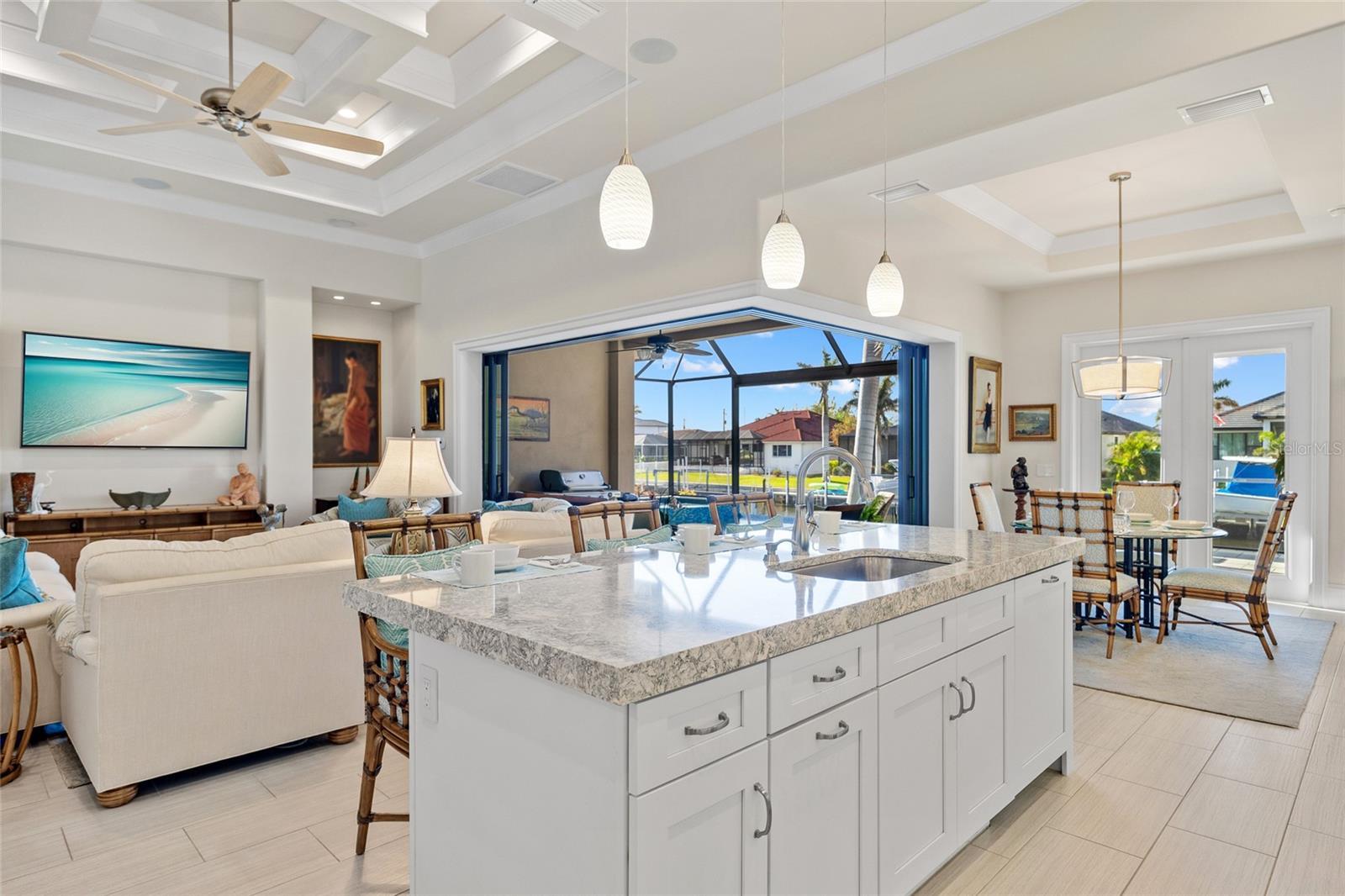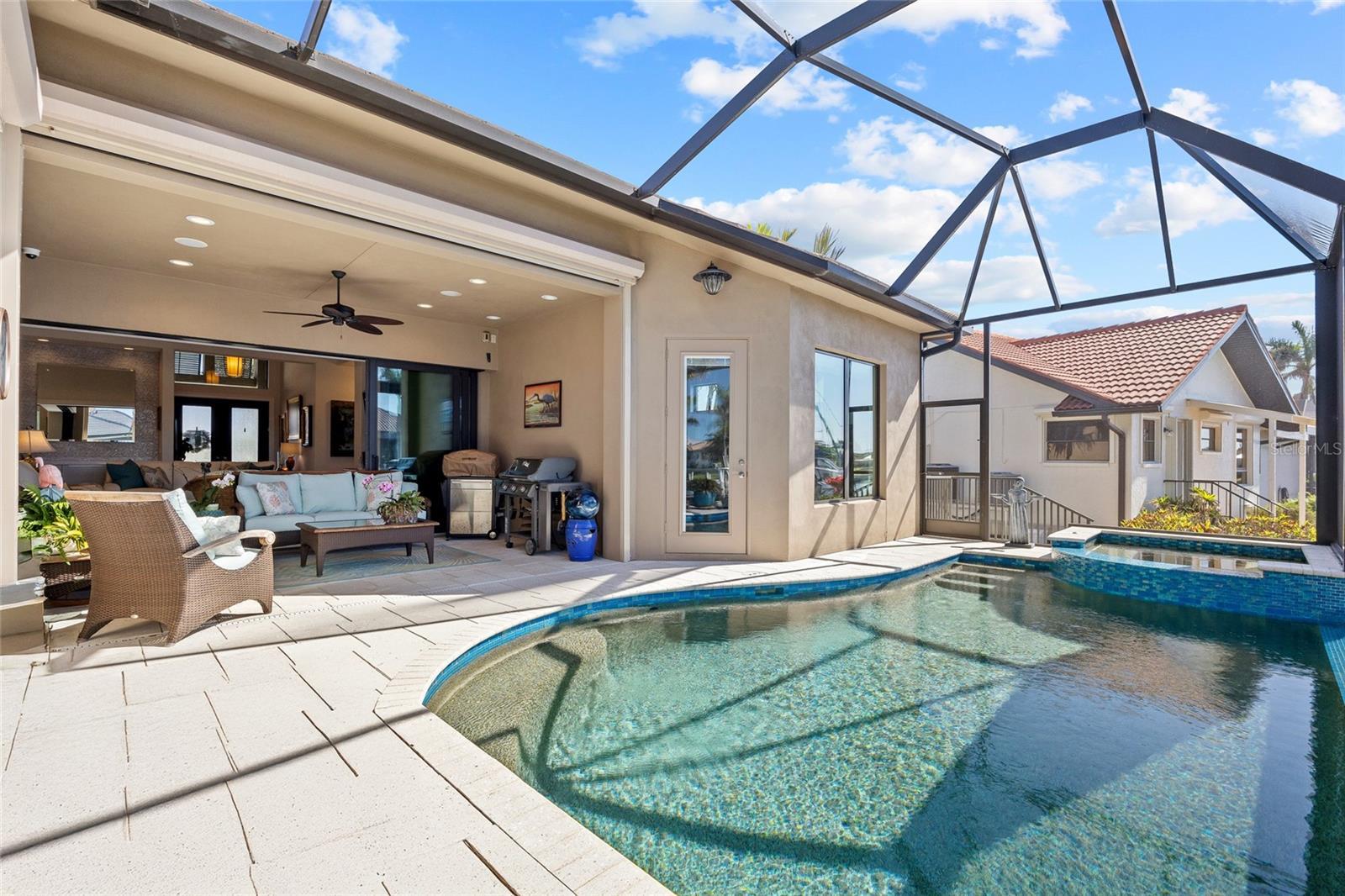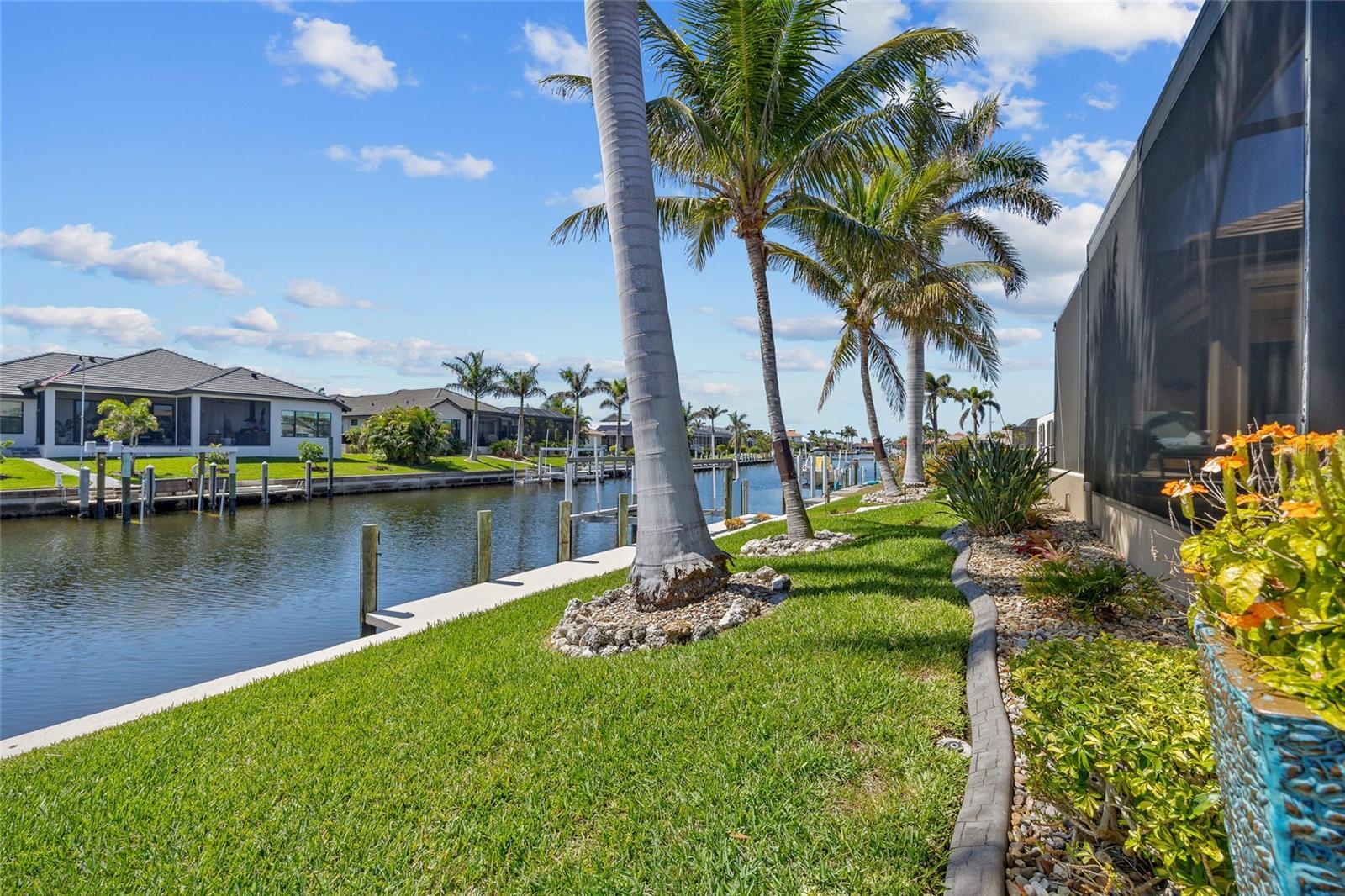 Punta Gorda Isles! Stunning 3 bedroom plus office, 3 bath, 3-car garage waterfront pool home built by prestigious PGI Builders with quick sailboat access to Charlotte Harbor leading to the Gulf of Mexico via Ponce Inlet! For the boating enthusiast, this south facing lanai home features a remote-operated boat lift currently set for a 10,000 lb. boat with power available for up to 20,000 lbs. plus electric and water dockside. Custom built to withstand 200 mph winds and offers PGT impact windows and motorized Storm Smart hurricane shades ensuring peace of mind. Step inside to an elegant open floor plan rich in every detail including coffered and tray ceilings, abundant can lights with dimmer switches for customizable ambiance, crown molding, 8’ doors, motorized shades and high-quality porcelain tile throughout. The great room features separate bar and zero-corner slider to lanai seamlessly blending indoor and outdoor living space. The kitchen is a chef's delight, equipped with a propane gas stove, built-in refrigerator, soft-close cabinets, pull-out drawers, discreet under-cabinet outlets, center island with breakfast bar and large pantry with hidden entrance next to refrigerator. The primary suite features an abundance of natural light, dual custom walk-in closets and a luxurious ensuite with dual vanities, soaking tub, walk-in shower and Toto smart toilet. Split floor plan provides privacy for all. The outdoor entertaining area offers covered lanai, sparkling heated PebbleTec pool and spa with fountain and waterfall features plus panoramic screen to enjoy unobstructed water views. A 500 gallon in-ground propane tank powers Generac whole house generator, pool and spa heater, outdoor grill, and stovetop. Additional special features include custom closet systems in all bedrooms, an overabundance of storage space, state of the art security system with four exterior cameras, surround sound audio/visual setup with ceiling speakers throughout, Kinetico water filtration system, front door retractable screens, automatic irrigation system to water potted plants on lanai and cabana, plus lush tropical landscaping and automatic exterior landscape lighting system surround the home providing amazing curb appeal. Nestled on a quiet cul-de-sac street in a popular golf and boating community, this home is just minutes from St. Andrews South Golf Club, the Yacht Club, Fishermen's Village, and the historic downtown area of Punta Gorda. Enjoy access to arts, community events, entertainment, world-class fishing, boating, fine dining, and beautiful parks, as well as easy access to the SWFL gulf beaches. Don't miss your chance to own this waterside treasure! Schedule your private showing today!