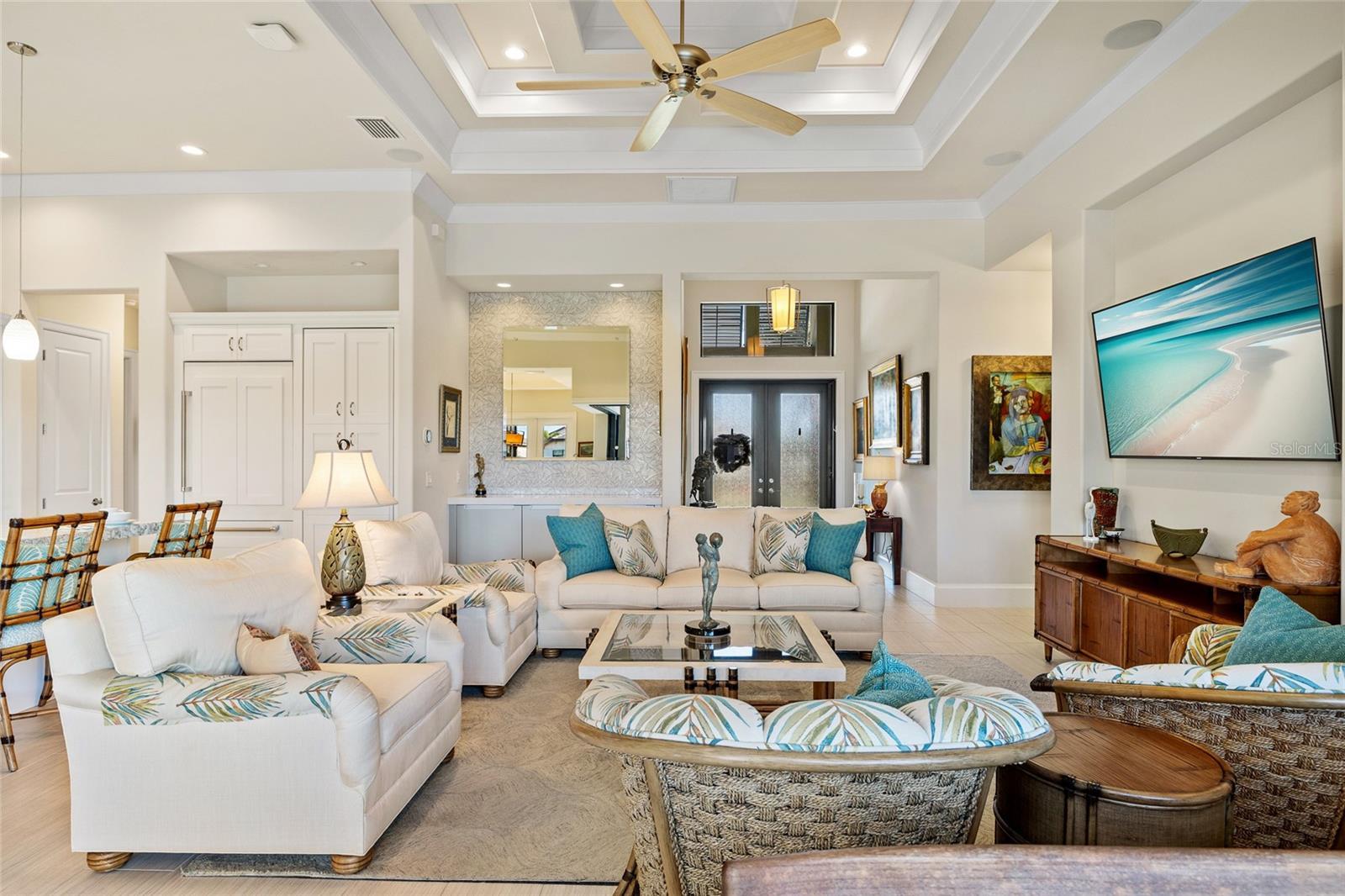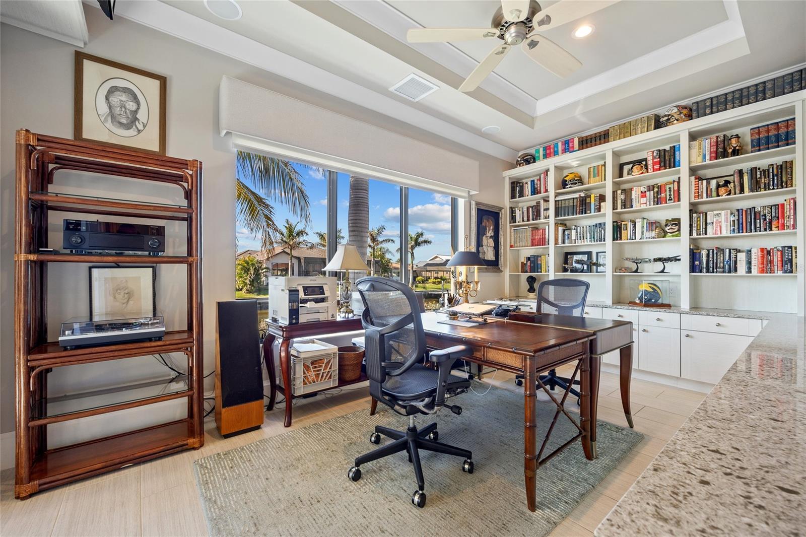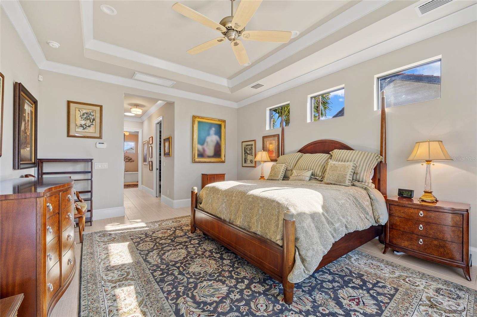 - Ceiling Fans(s), Coffered Ceiling(s), High Ceilings, Living Room/Dining Room Combo, Open Floorplan, Solid Wood Cabinets, Split Bedroom, Stone Counters, Tray Ceiling(s), Vaulted Ceiling(s), Walk-In Closet(s), Window Treatments