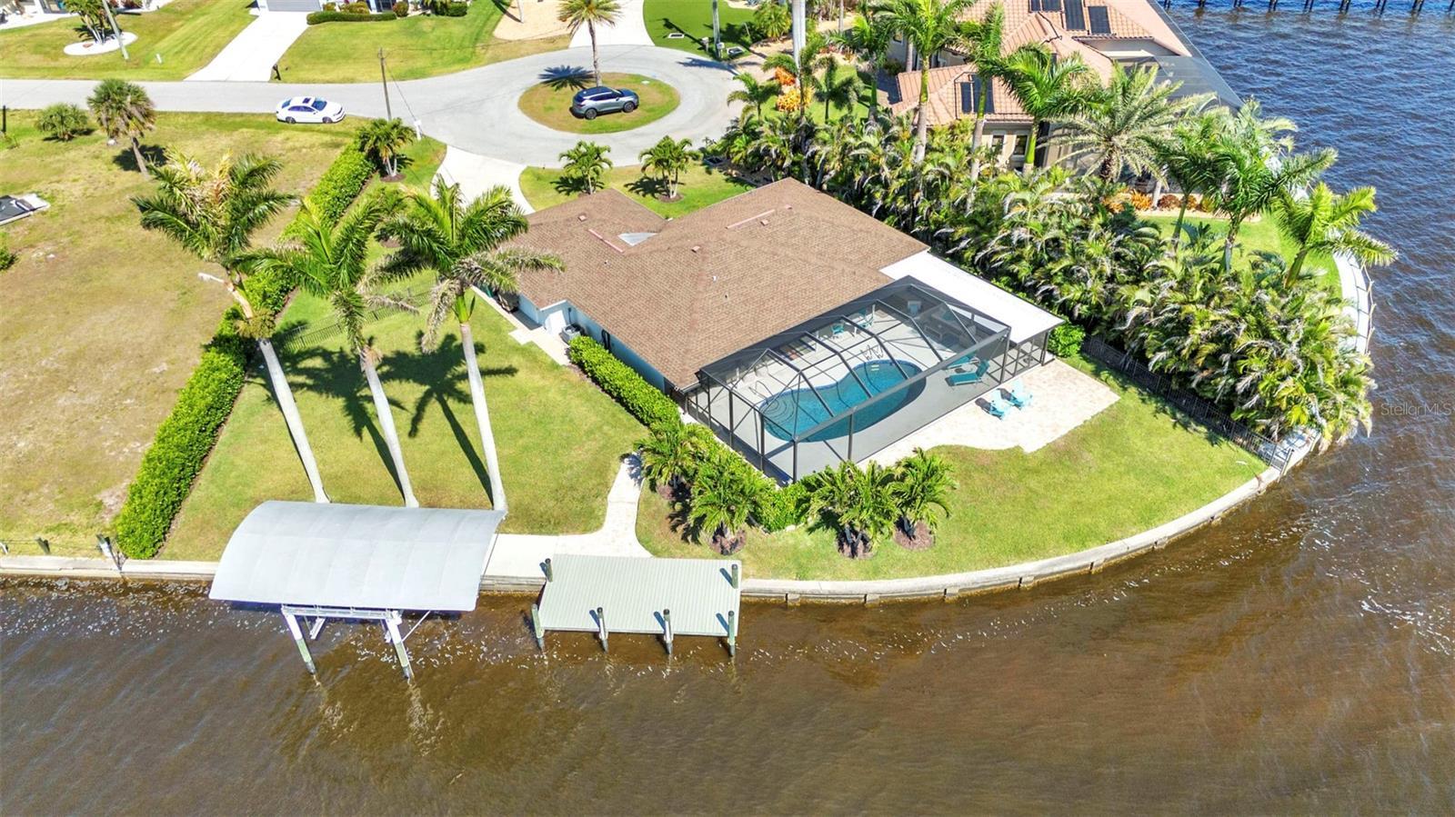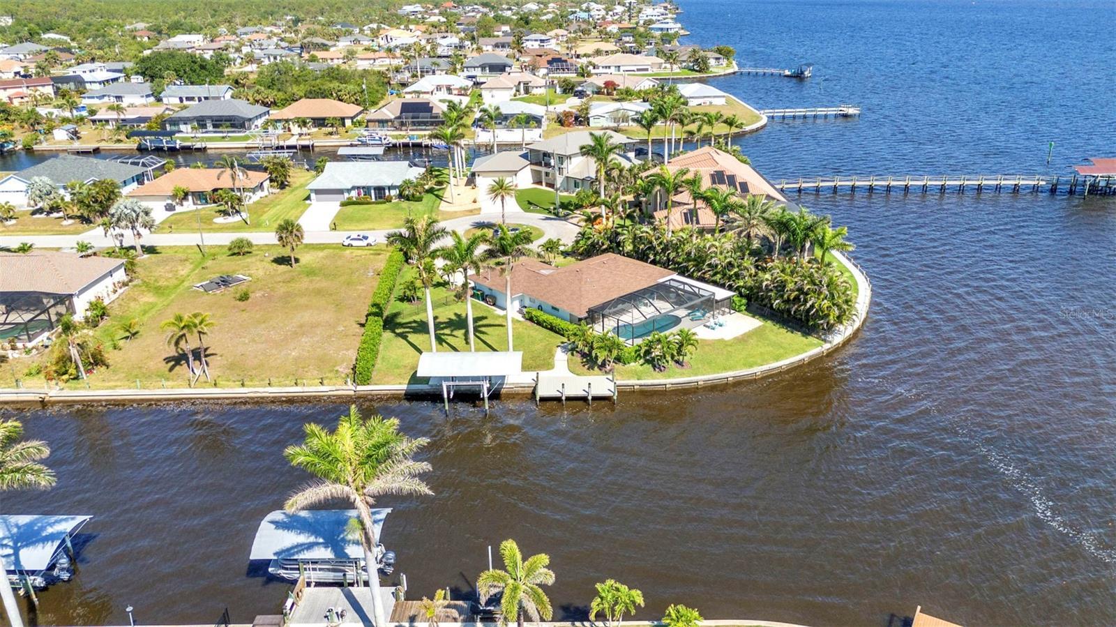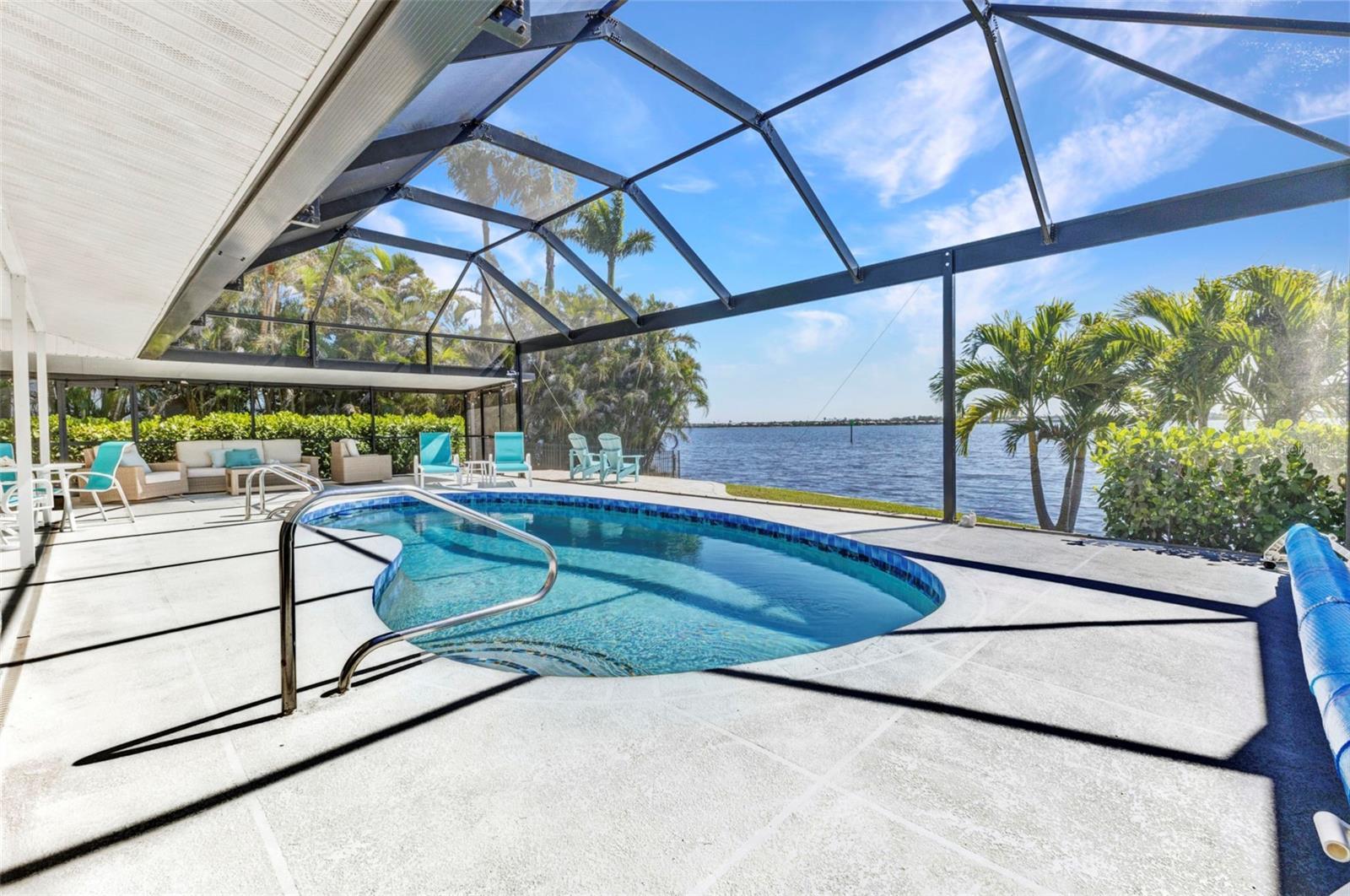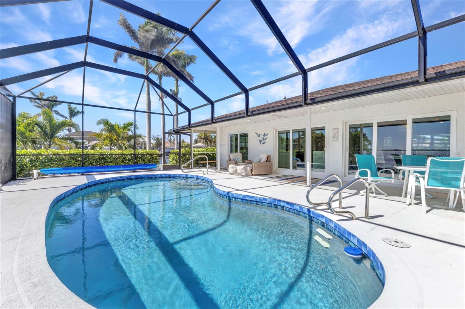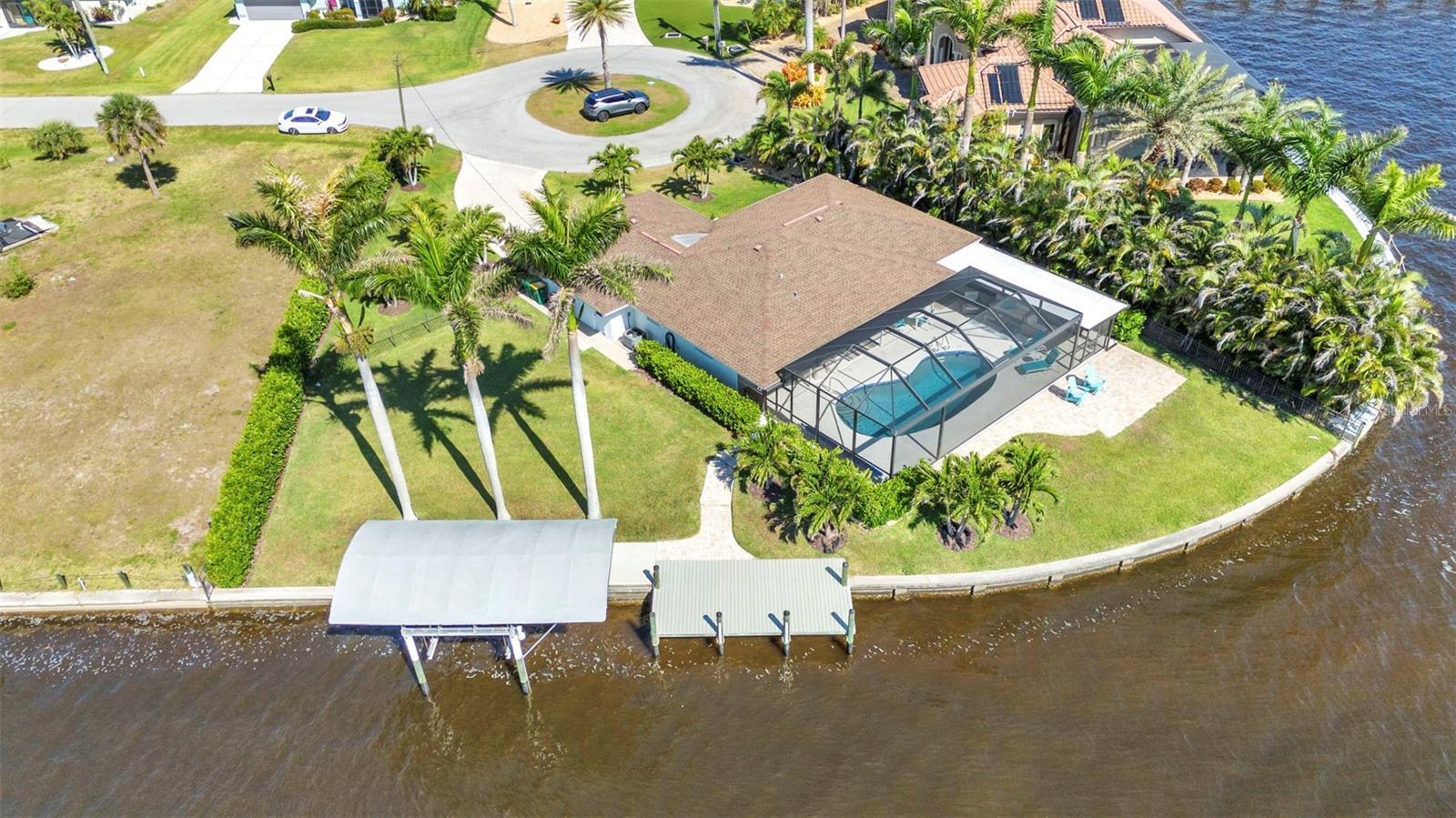 Jaw-Dropping Myakka River Views from This Oversized Tip Lot in Gulf Cove! Perfectly positioned on an oversized tip lot with 160 feet of concrete seawall, this remodeled 2-bedroom, 2-bath waterfront home with 12,000 lb. boat lift offers some of the most spectacular, unobstructed views of the Myakka River you’ll find in Gulf Cove. Whether it's sunrise reflections or glowing sunsets, the backdrop is pure magic. Located at the end of a quiet cul-de-sac, this bright and beautiful home was renovated just two years ago with timeless finishes and thoughtful upgrades throughout. The open split floor plan features elegant 28" porcelain tile flooring, a soft white palette, and a seamless flow between indoor and outdoor living spaces. The kitchen is a showpiece, designed with both beauty and functionality in mind. You'll find a waterfall island with storage, sleek stone countertops, soft-close solid wood cabinetry with pull-out drawers, top-of-the-line stainless appliances, a farmhouse sink and a pantry with additional pull-outs for easy organization. Just off the dining area, a built-in beverage station with a wine fridge and matching cabinetry adds a perfect touch for entertaining. The spacious ensuite primary offers sliding doors to the lanai, a walk-in closet, dual sinks, and a large tiled walk-in shower. On the opposite side of the home, the guest bedroom also features sliding doors to the lanai, along with a nearby full bath, ideal for visitors seeking privacy and comfort. Two sets of sliding doors from the main living space lead to the expansive paver lanai, where a heated pool, a recently resurfaced deck, and a panoramic screen create a resort-style space to relax and take in those incredible views. Whether you're savoring your morning coffee in the gentle breeze or enjoying a glass of wine as the sky turns gold at sunset, the lanai becomes your front-row seat to the beauty and tranquility of waterfront living. Just beyond the screen enclosure, a paver walkway and Trex deck guide you to your covered 12,000 lb. boat lift, ready for spontaneous boat days and sunset cruises. Lush tropical landscaping wraps the home in beauty and privacy, making it feel like a true retreat. Additional highlights include custom blinds & shutters, impact-resistant windows and doors, an oversized two-car garage with a laundry area, utility sink and a retractable screen to let in light and fresh air. This home remained dry during recent storms and is ready for new memories to be made. Furnishings are negotiable outside of the contract, making your move-in even easier. Conveniently located near shopping, dining, entertainment, and some of Southwest Florida’s most beautiful beaches, this home is perfect for anyone who seeks luxury, sophistication and breathtaking views. Don’t miss out on the opportunity to own this exquisite piece of paradise!