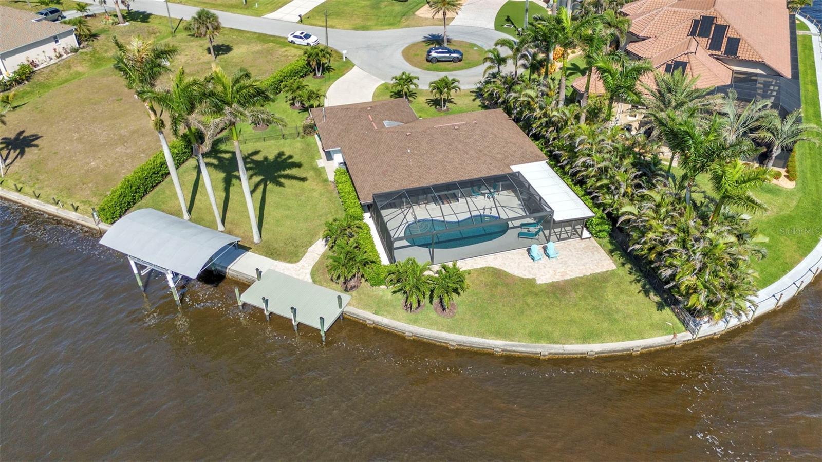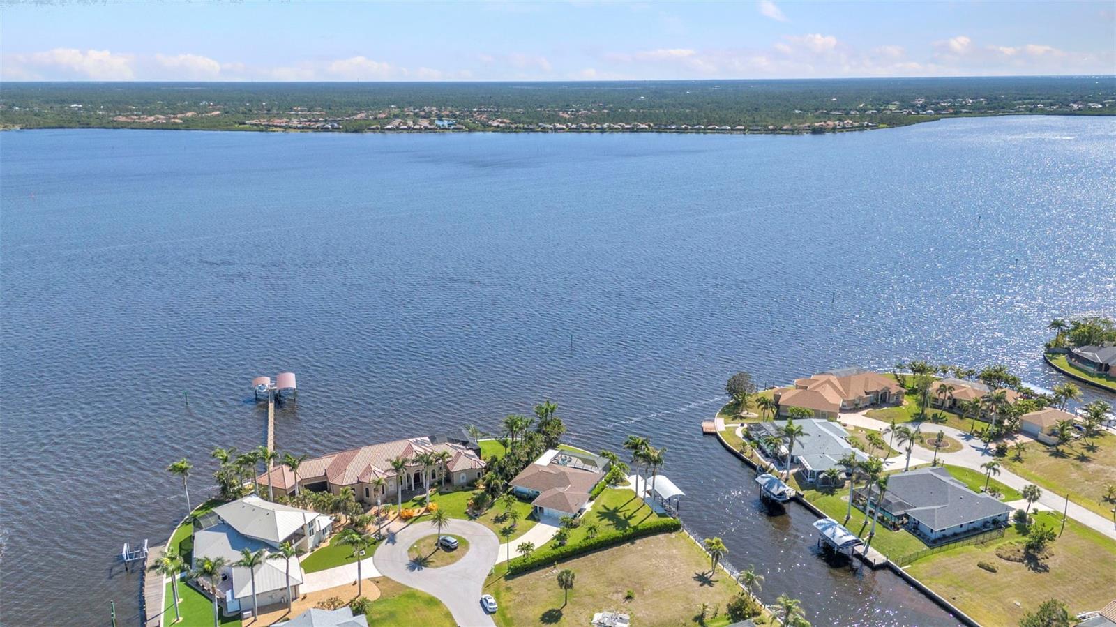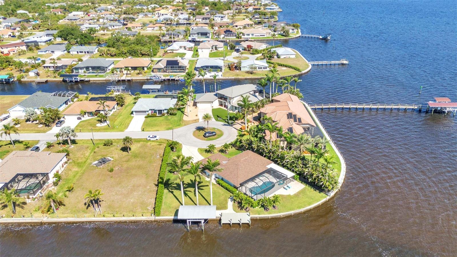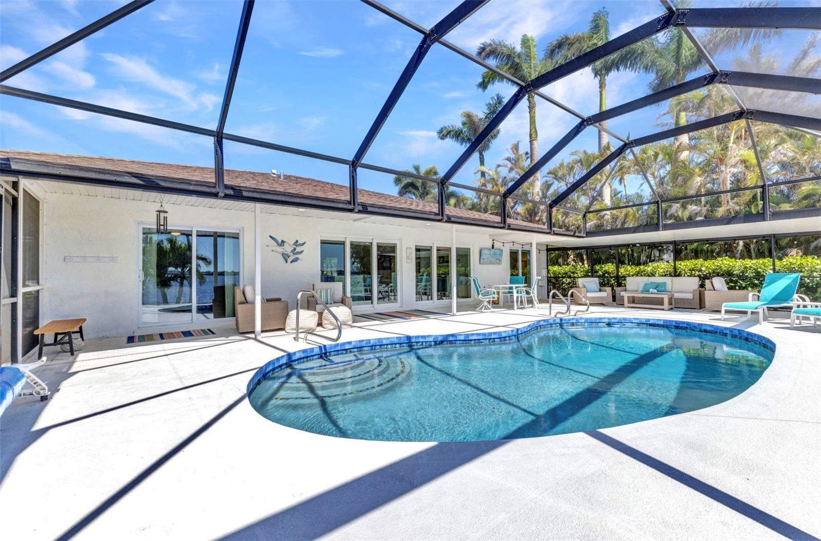 Jaw-Dropping Myakka River Views from This Oversized Tip Lot in Gulf Cove! Perfectly positioned on an oversized tip lot with 160 feet of concrete seawall, this remodeled 2-bedroom, 2-bath waterfront home with 12,000 lb. boat lift offers some of the most spectacular, unobstructed views of the Myakka River you’ll find in Gulf Cove. Whether it's sunrise reflections or glowing sunsets, the backdrop is pure magic. Located at the end of a quiet cul-de-sac, this bright and beautiful home was renovated just two years ago with timeless finishes and thoughtful upgrades throughout. The open split floor plan features elegant 28" porcelain tile flooring, a soft white palette, and a seamless flow between indoor and outdoor living spaces. The kitchen is a showpiece, designed with both beauty and functionality in mind. You'll find a waterfall island with storage, sleek stone countertops, soft-close solid wood cabinetry with pull-out drawers, top-of-the-line stainless appliances, a farmhouse sink and a pantry with additional pull-outs for easy organization. Just off the dining area, a built-in beverage station with a wine fridge and matching cabinetry adds a perfect touch for entertaining. The spacious ensuite primary offers sliding doors to the lanai, a walk-in closet, dual sinks, and a large tiled walk-in shower. On the opposite side of the home, the guest bedroom also features sliding doors to the lanai, along with a nearby full bath, ideal for visitors seeking privacy and comfort. Two sets of sliding doors from the main living space lead to the expansive paver lanai, where a heated pool, a recently resurfaced deck, and a panoramic screen create a resort-style space to relax and take in those incredible views. Whether you're savoring your morning coffee in the gentle breeze or enjoying a glass of wine as the sky turns gold at sunset, the lanai becomes your front-row seat to the beauty and tranquility of waterfront living. Just beyond the screen enclosure, a paver walkway and Trex deck guide you to your covered 12,000 lb. boat lift, ready for spontaneous boat days and sunset cruises. Lush tropical landscaping wraps the home in beauty and privacy, making it feel like a true retreat. Additional highlights include custom blinds & shutters, impact-resistant windows and doors, an oversized two-car garage with a laundry area, utility sink and a retractable screen to let in light and fresh air. This home remained dry during recent storms and is ready for new memories to be made. Furnishings are negotiable outside of the contract, making your move-in even easier. Conveniently located near shopping, dining, entertainment, and some of Southwest Florida’s most beautiful beaches, this home is perfect for anyone who seeks luxury, sophistication and breathtaking views. Don’t miss out on the opportunity to own this exquisite piece of paradise!