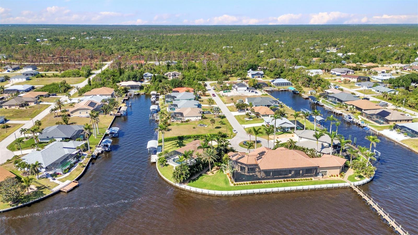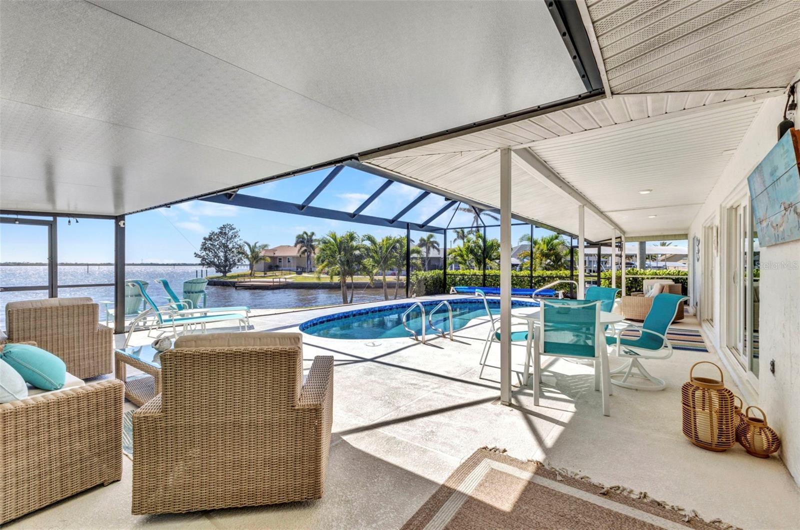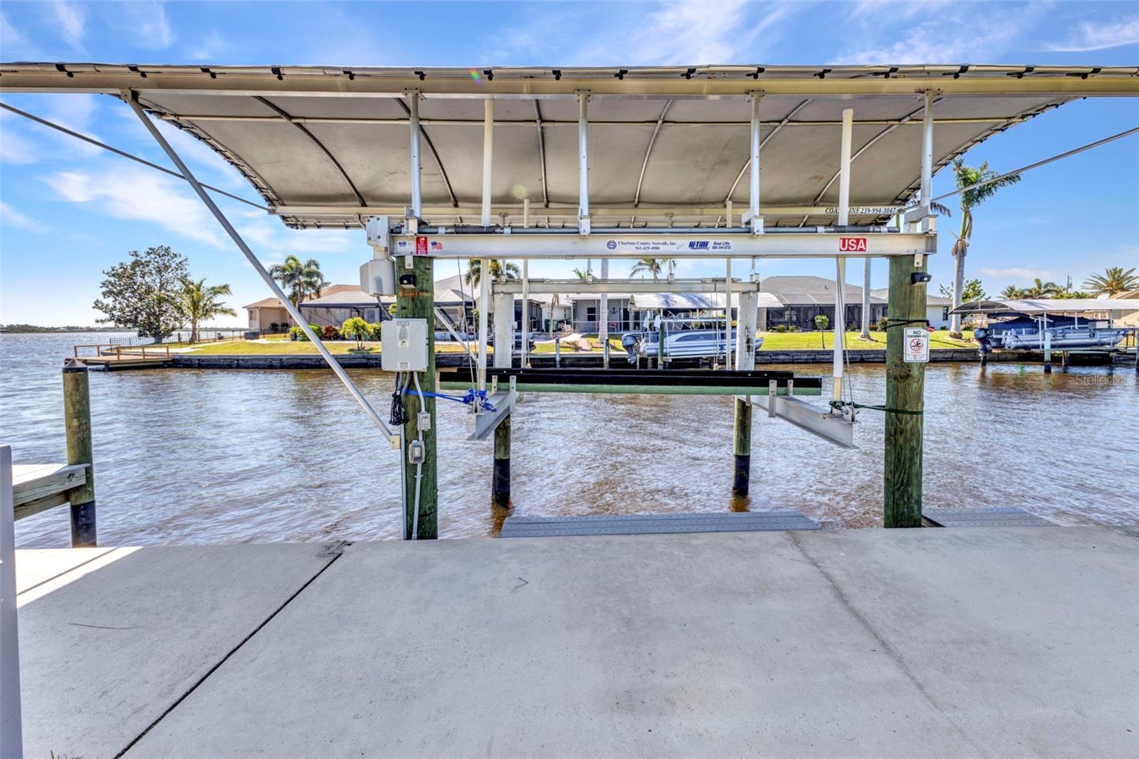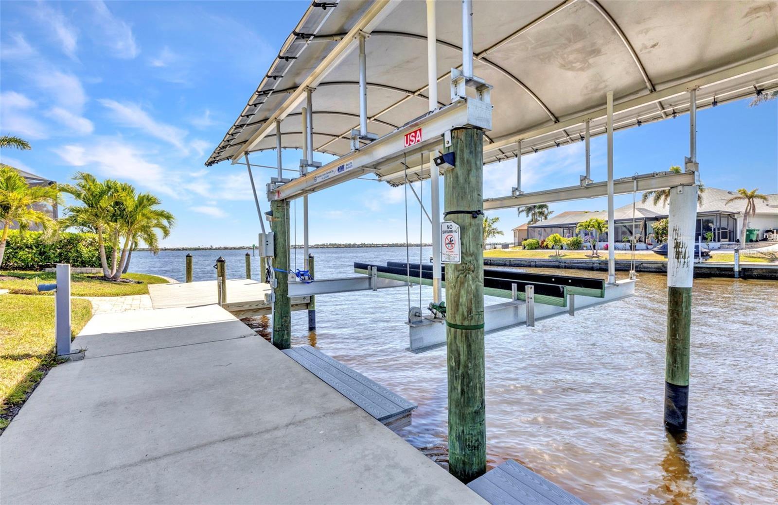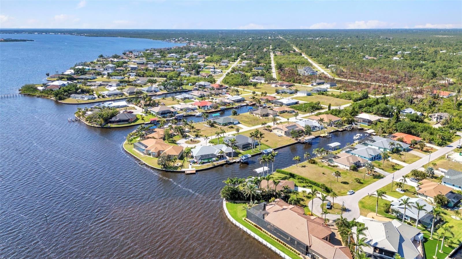 Jaw-Dropping Myakka River Views from This Oversized Tip Lot in Gulf Cove! Perfectly positioned on an oversized tip lot with 160 feet of concrete seawall, this remodeled 2-bedroom, 2-bath waterfront home with 12,000 lb. boat lift offers some of the most spectacular, unobstructed views of the Myakka River you’ll find in Gulf Cove. Whether it's sunrise reflections or glowing sunsets, the backdrop is pure magic. Located at the end of a quiet cul-de-sac, this bright and beautiful home was renovated just two years ago with timeless finishes and thoughtful upgrades throughout. The open split floor plan features elegant 28" porcelain tile flooring, a soft white palette, and a seamless flow between indoor and outdoor living spaces. The kitchen is a showpiece, designed with both beauty and functionality in mind. You'll find a waterfall island with storage, sleek stone countertops, soft-close solid wood cabinetry with pull-out drawers, top-of-the-line stainless appliances, a farmhouse sink and a pantry with additional pull-outs for easy organization. Just off the dining area, a built-in beverage station with a wine fridge and matching cabinetry adds a perfect touch for entertaining. The spacious ensuite primary offers sliding doors to the lanai, a walk-in closet, dual sinks, and a large tiled walk-in shower. On the opposite side of the home, the guest bedroom also features sliding doors to the lanai, along with a nearby full bath, ideal for visitors seeking privacy and comfort. Two sets of sliding doors from the main living space lead to the expansive paver lanai, where a heated pool, a recently resurfaced deck, and a panoramic screen create a resort-style space to relax and take in those incredible views. Whether you're savoring your morning coffee in the gentle breeze or enjoying a glass of wine as the sky turns gold at sunset, the lanai becomes your front-row seat to the beauty and tranquility of waterfront living. Just beyond the screen enclosure, a paver walkway and Trex deck guide you to your covered 12,000 lb. boat lift, ready for spontaneous boat days and sunset cruises. Lush tropical landscaping wraps the home in beauty and privacy, making it feel like a true retreat. Additional highlights include custom blinds & shutters, impact-resistant windows and doors, an oversized two-car garage with a laundry area, utility sink and a retractable screen to let in light and fresh air. This home remained dry during recent storms and is ready for new memories to be made. Furnishings are negotiable outside of the contract, making your move-in even easier. Conveniently located near shopping, dining, entertainment, and some of Southwest Florida’s most beautiful beaches, this home is perfect for anyone who seeks luxury, sophistication and breathtaking views. Don’t miss out on the opportunity to own this exquisite piece of paradise!