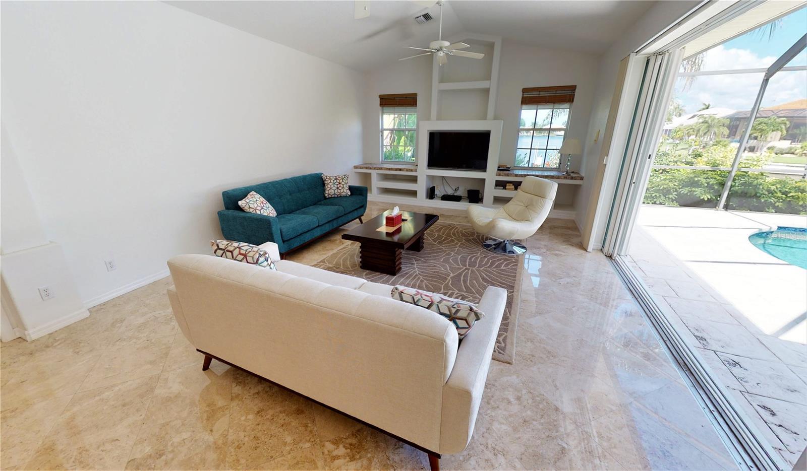 CUSTOM WATERFRONT, FURNISHED, POOL HOME IN PUNTA GORDA ISLES: Situated on an oversized corner lot with lush tropical landscaping, this stunning custom-built home offers a serene waterfront setting with a basin view of intersecting canals and quick boating access to Charlotte Harbor and the Gulf via Buckley’s Pass. Designed with indoor-outdoor living in mind, this residence is a showstopper for both entertaining and relaxing in classic Florida style. From the moment you arrive, you’ll be captivated by the beautifully manicured surroundings, including a private side garden with a paver patio and space for a fire pit—perfect for evening gatherings. Step through the grand entry to discover soaring ceilings, a bright open split floorplan, and granite tile throughout the main living spaces. The formal living room welcomes you with an elegant in-wall propane fireplace and pocket sliders that open fully to the expansive lanai and pool area. Nearby, the formal dining room features a full wall of custom cabinetry with a granite-topped buffet and glass shelving, ideal for hosting dinner parties. A chef’s dream, the kitchen is both functional and stylish with pickled wood cabinetry, granite countertops and backsplash, under-cabinet lighting, and high-end appliances including a Bosch induction cooktop, KitchenAid built-in wall oven and microwave, counter-depth refrigerator, wine fridge, and prep island. The built-in desk, breakfast bar, and cozy breakfast nook with zero-corner sliders make this space both versatile and welcoming. The adjacent family room continues the open feel with a wall of built-in shelving and pocket sliders leading to the pool. Step outside to the resort style spacious lanai featuring a resurfaced pool and spillover spa, summer kitchen with granite counters, downdraft grill, and refrigerator…ready for any gathering. Sunset cocktails? Pool party? You've got the perfect setup. The owner's suite is a tranquil retreat with a lighted tray ceiling, newer plush carpet, French doors to the lanai, dual walk-in closets, and a spa-inspired ensuite bath featuring separate vanities, a soaking tub, a large tiled walk-in shower, and a private atrium garden view. Need a home office or flex space? You’ll find it here Den (currently used as a bedroom) with double pocket doors and hardwood floors is located near the entry, while two guest bedrooms downstairs share a full bath. Bedroom 2 overlooks the private garden, and Bedroom 3 features hardwood floors, French doors to a private porch, and canal views—currently used as an office. Upstairs, a large ensuite bedroom 4 or bonus room includes a full bath, walk-in closet, and French doors opening to a private balcony overlooking the canal and backyard. Additional features include a well-equipped laundry room with built-in sink and two storage closets, a 3-car garage with workbench, central vac, and newer HVAC, as well as accordion and roll-down storm shutters for full protection. Waterfront upgrades include a 2018 seawall replacement, 30-foot concrete dock with pilings, 10,000 lb boat lift and room to dock two boats—perfect for boaters seeking convenience, functionality and direct access to Charlotte Harbor and Gulf. This home blends elegance, comfort, and upscale coastal living into one unforgettable package. You won’t find another like it....see why this Punta Gorda Isles stunner is easy to love and even easier to live in. ***PLEASE CLICK 3D INTERACTIVE VIRTUAL TOUR LINK***