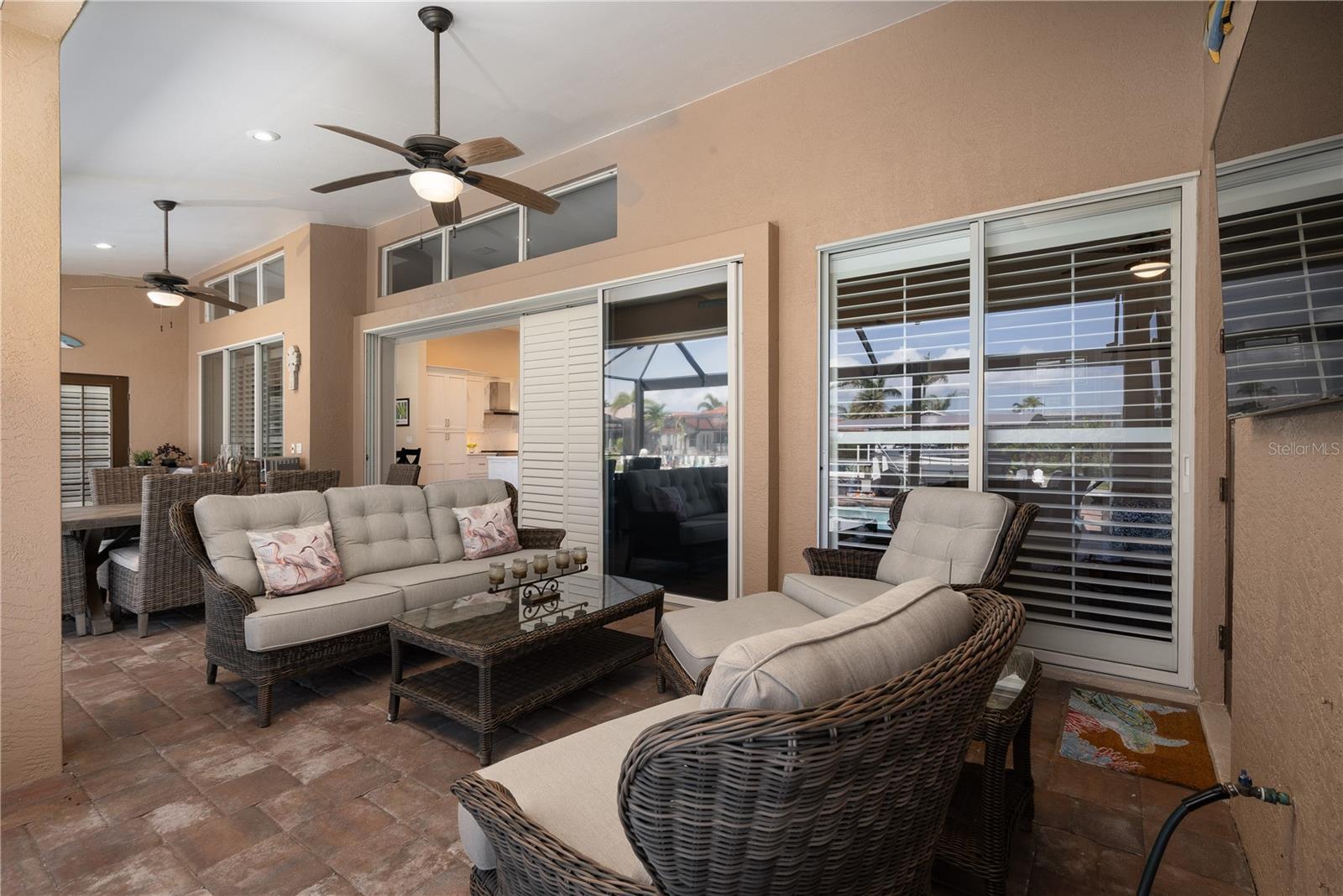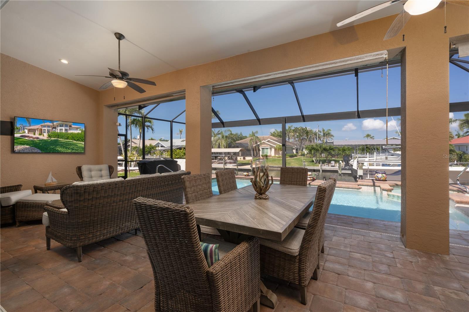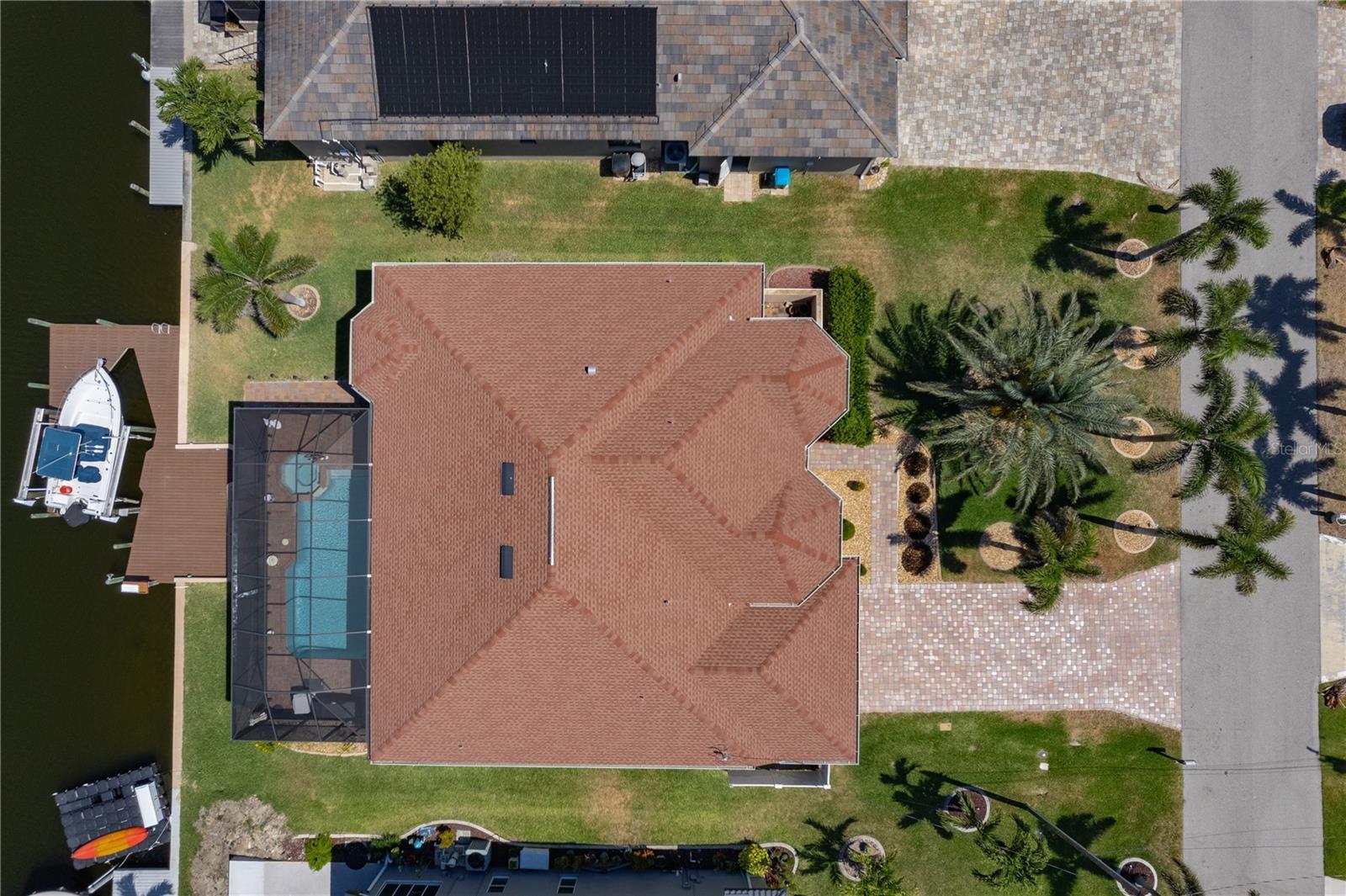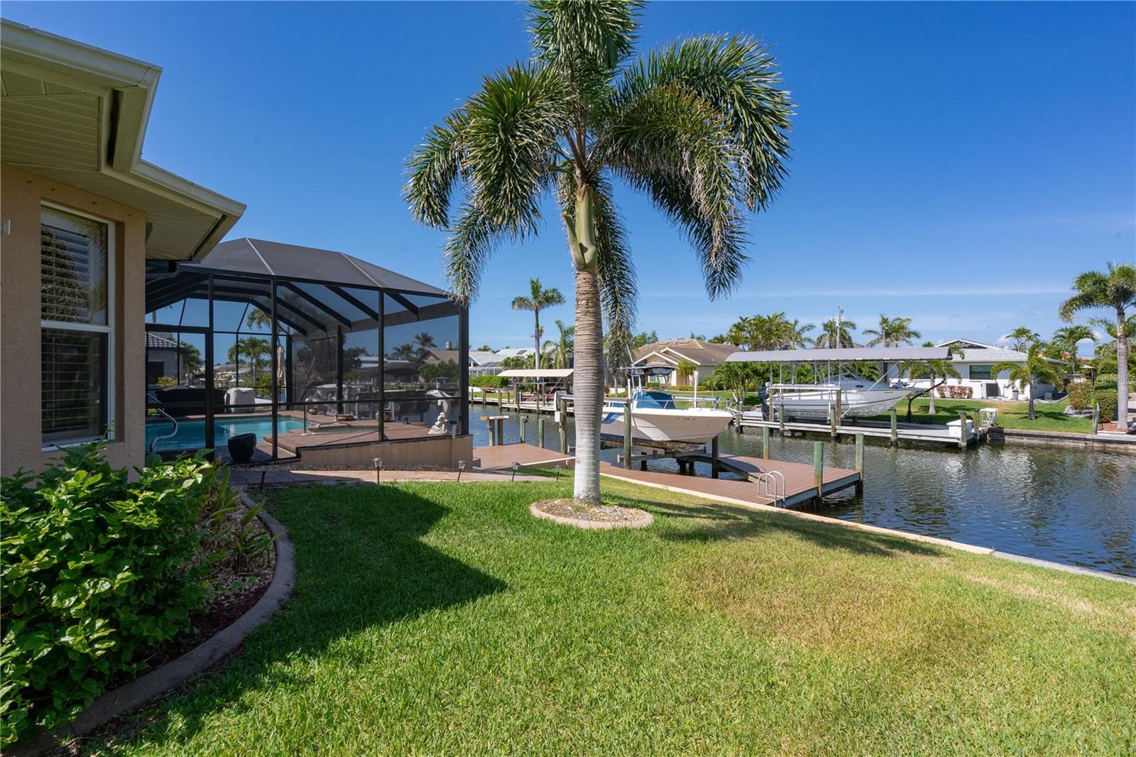 Welcome to your waterfront oasis with Gulf access and no bridges, offering the perfect blend of luxury, functionality, and outdoor living. This 3-bedroom plus den, 3-bath home is nestled on a wide canal and boasts a private boat dock and lift, making it a dream for boaters. Enjoy unforgettable sunsets from your beautiful saltwater pool and spa, all enclosed within a screened lanai for year-round enjoyment. Step inside and be captivated by the open-concept layout and rich wood laminate floors that flow throughout the home (bathrooms feature tile). The split-bedroom floor plan with volume ceilings creates privacy and openness all at once, perfect for both entertaining and everyday living. Plantation shutters throughout the home add timeless elegance and light control. The heart of the home is a spacious kitchen designed for both style and performance. Featuring cabinetry with crown molding, Quartz countertops, a large cook island with seating, and a high-end gas range, it’s a culinary dream. There’s even a dedicated bar area with glass cabinets and a beverage refrigerator, ideal for entertaining. The primary suite is a true retreat with a walk-in closet, a spa-inspired bathroom featuring a deep soaking tub, an expansive Quartz vanity, and a frameless glass walk-in shower. Two additional bedrooms, three full baths, and a flexible den with ample space for guests, hobbies, or a home office. Additional updates include a new roof (2018), AC unit (2019), and appliances (2021). What truly sets this home apart is the rare 500-gallon propane tank that fuels the gas range and is available for other uses as desired—adding convenience and value. Step out to the covered patio with paver flooring and ceiling fans, the perfect setting for poolside dining or relaxing while taking in tranquil sunset views over the canal. Whether you're boating, entertaining, or simply enjoying the serenity of waterfront living, this home offers the ultimate Florida lifestyle.