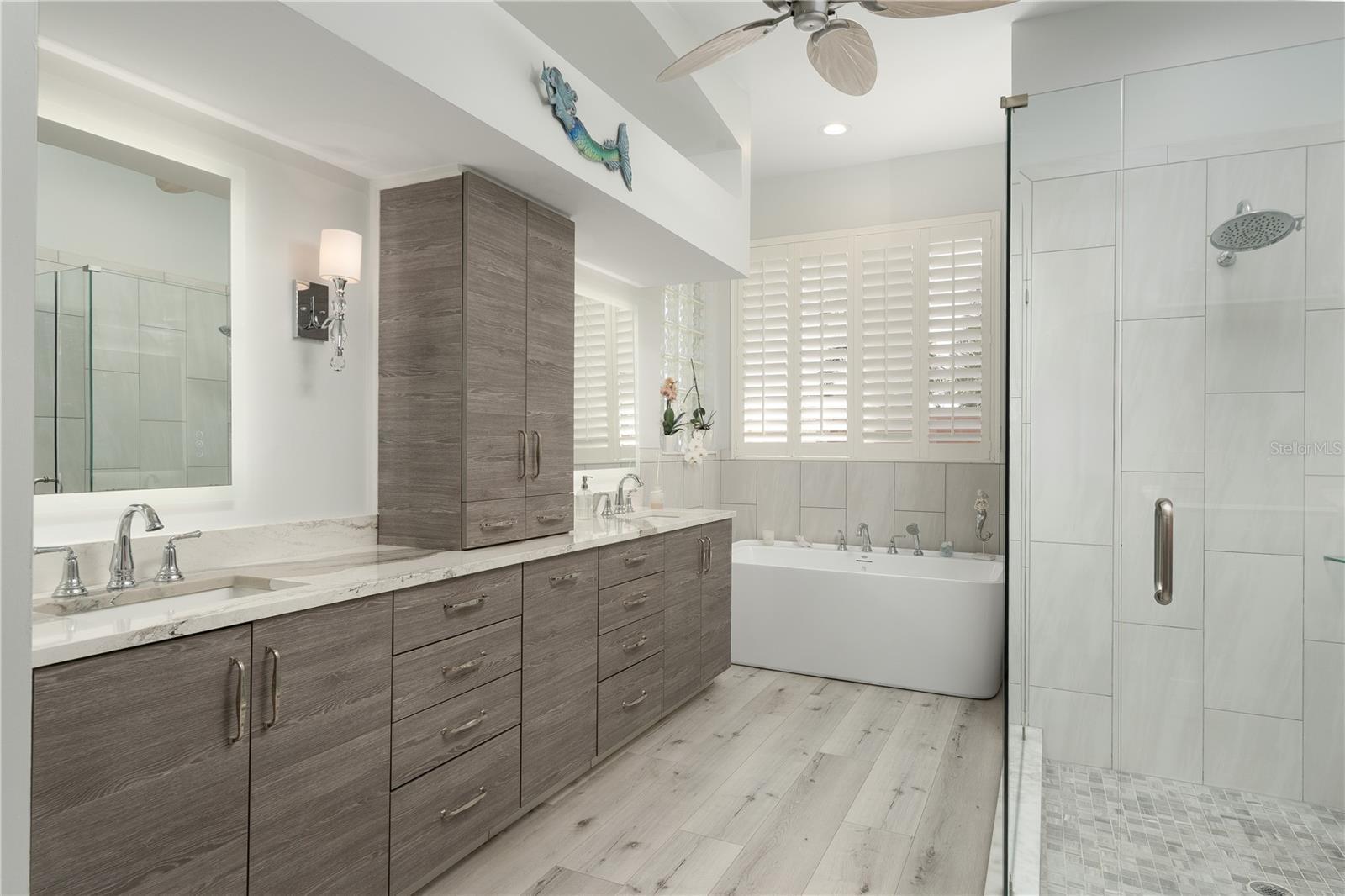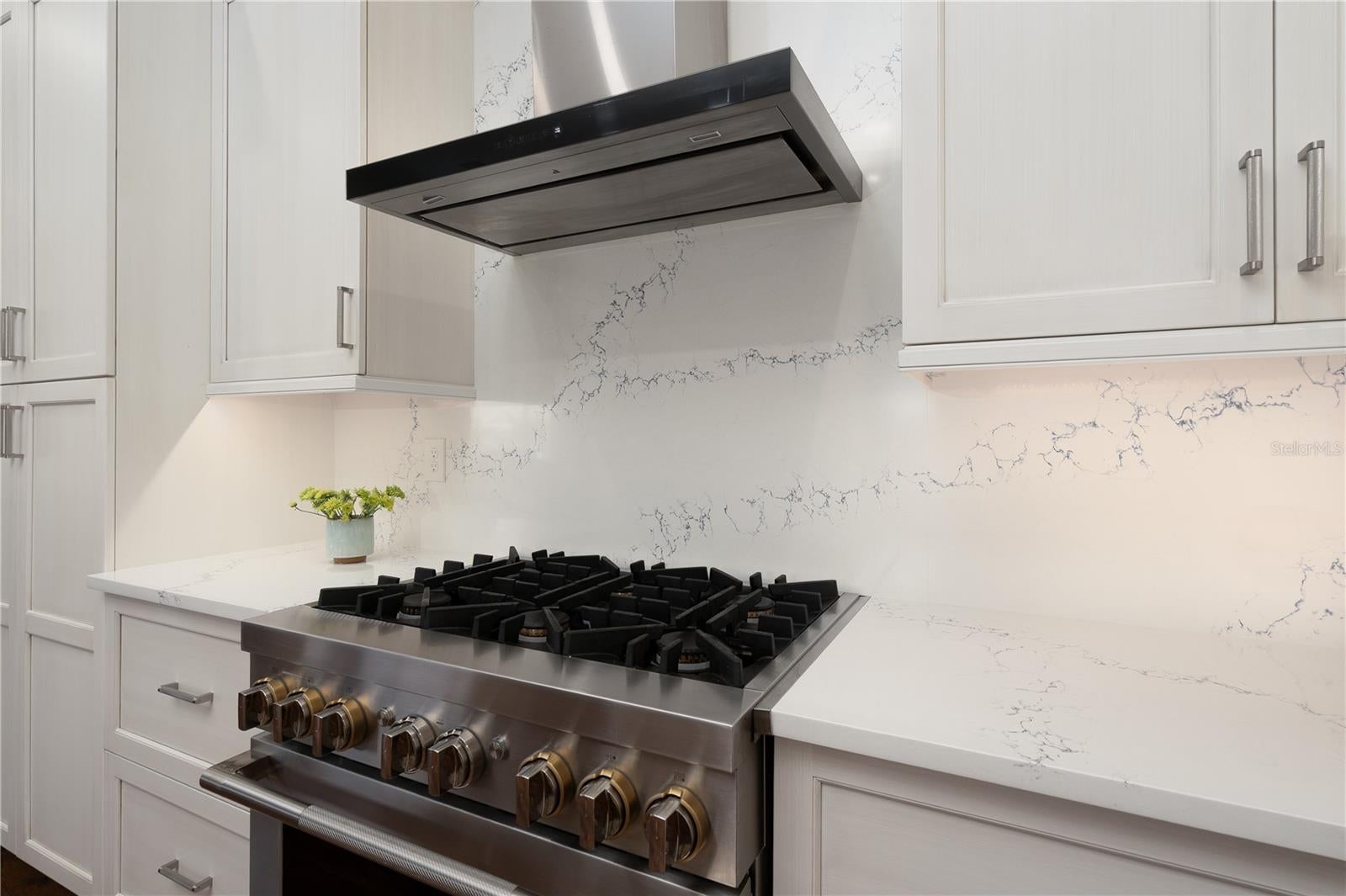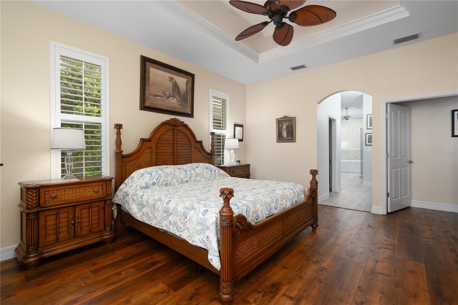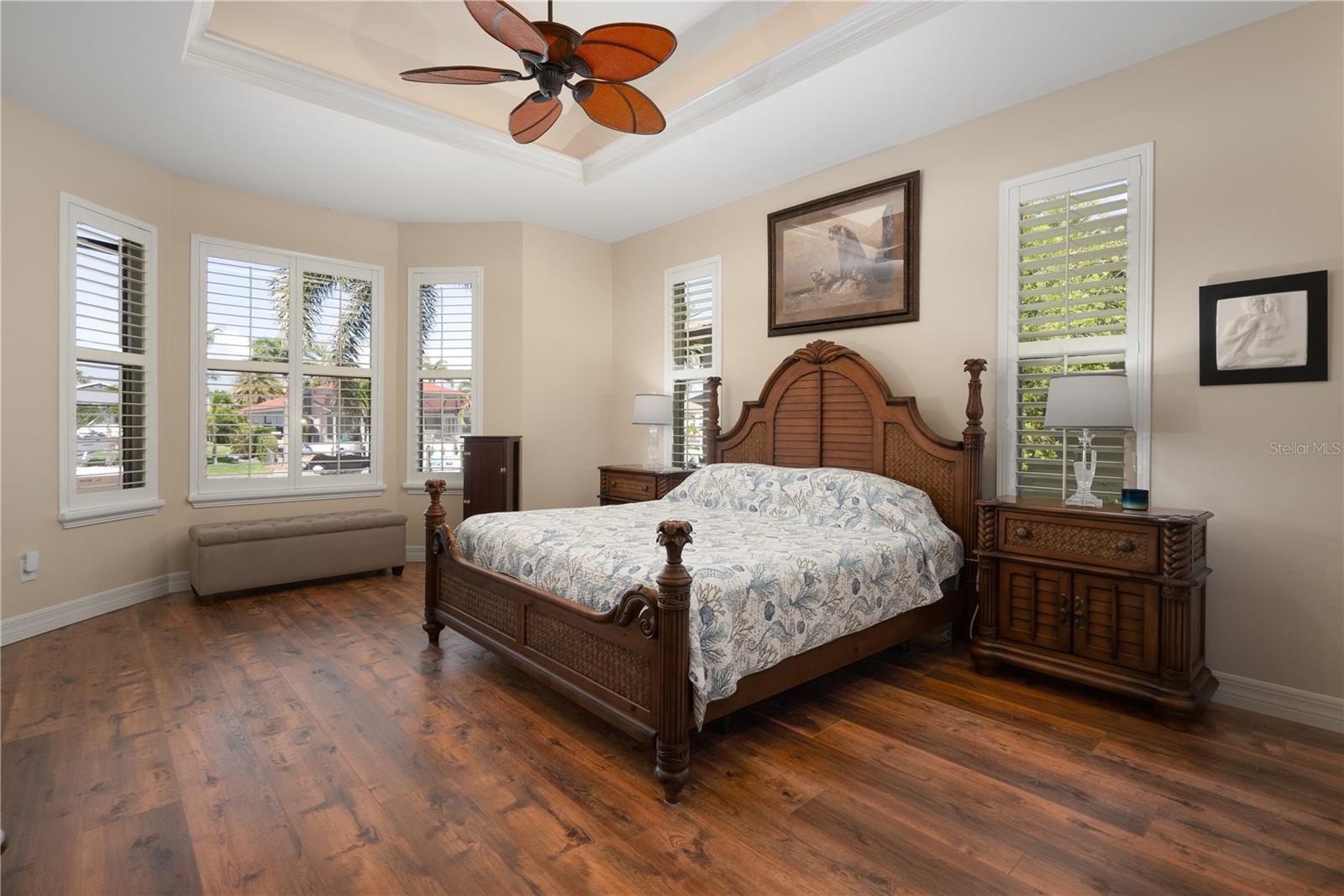 Welcome to your waterfront oasis with Gulf access and no bridges, offering the perfect blend of luxury, functionality, and outdoor living. This 3-bedroom plus den, 3-bath home is nestled on a wide canal and boasts a private boat dock and lift, making it a dream for boaters. Enjoy unforgettable sunsets from your beautiful saltwater pool and spa, all enclosed within a screened lanai for year-round enjoyment. Step inside and be captivated by the open-concept layout and rich wood laminate floors that flow throughout the home (bathrooms feature tile). The split-bedroom floor plan with volume ceilings creates privacy and openness all at once, perfect for both entertaining and everyday living. Plantation shutters throughout the home add timeless elegance and light control. The heart of the home is a spacious kitchen designed for both style and performance. Featuring cabinetry with crown molding, Quartz countertops, a large cook island with seating, and a high-end gas range, it’s a culinary dream. There’s even a dedicated bar area with glass cabinets and a beverage refrigerator, ideal for entertaining. The primary suite is a true retreat with a walk-in closet, a spa-inspired bathroom featuring a deep soaking tub, an expansive Quartz vanity, and a frameless glass walk-in shower. Two additional bedrooms, three full baths, and a flexible den with ample space for guests, hobbies, or a home office. Additional updates include a new roof (2018), AC unit (2019), and appliances (2021). What truly sets this home apart is the rare 500-gallon propane tank that fuels the gas range and is available for other uses as desired—adding convenience and value. Step out to the covered patio with paver flooring and ceiling fans, the perfect setting for poolside dining or relaxing while taking in tranquil sunset views over the canal. Whether you're boating, entertaining, or simply enjoying the serenity of waterfront living, this home offers the ultimate Florida lifestyle.