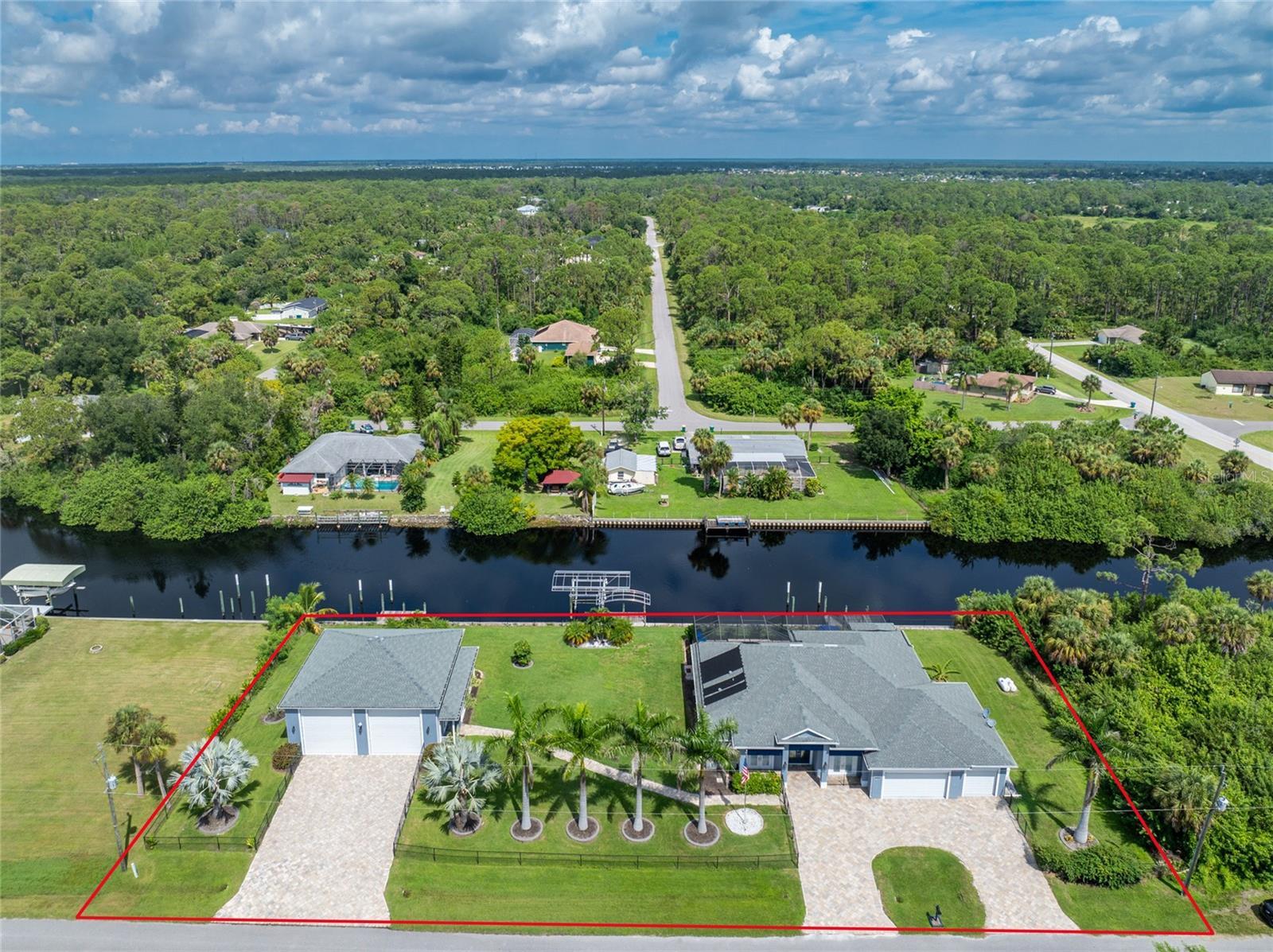 Built in 2019, this FULLY FURNISHED nearly new custom estate is a rare waterfront masterpiece offering the space, privacy, and luxury that are almost impossible to find. Situated on over 1.15 acres across five combined lots, including multiple oversized waterfront parcels and additional buildable lots across the street, this property delivers unmatched value, flexibility, and long-term potential. Set along 240 feet of pristine waterfront, the home features three docks, including one with a 10,000-lb boat lift and two additional docks ready for expansion. Inside, the residence showcases soaring 12-foot ceilings, dramatic custom wood entry doors, and expansive zero-corner sliders that open to sweeping water views and seamless indoor-outdoor living. The designer kitchen is a true showpiece, featuring a Sub-Zero refrigerator, premium appliances, elegant stone surfaces, and refined finishes throughout. The luxurious primary suite offers serene pool and water views, a spa-inspired bath with Roman shower and clawfoot soaking tub, and a custom California closet with direct access to the laundry room. Step outside to your private resort-style oasis—complete with a screened lanai, cedar plank ceilings, LED-lit heated saltwater pool, waterfalls, and a fully equipped stainless outdoor kitchen perfect for entertaining year-round. Additional highlights include a 3-car attached garage, a massive 40x40 detached garage with 16-foot ceilings and RV hookups, whole-house generator, electric hurricane shutters, and smart home features throughout. Located just minutes from dining, shopping, and Gulf beaches—with no flood damage, no storm impact, and no compromises—this is a rare opportunity to own a nearly new, estate-style waterfront home with unmatched land, privacy, and versatility.