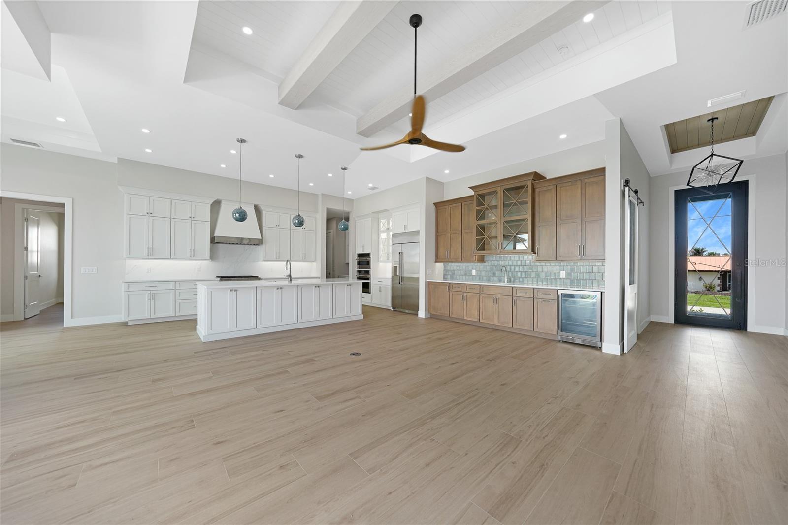 Introducing a rare opportunity to own a brand-new, custom-built waterfront estate that flawlessly combines contemporary design, refined craftsmanship, and the relaxed sophistication of Southwest Florida living. Nestled on a quiet canal in one of Punta Gorda’s most desirable neighborhoods, this 3-bedroom + den, 3-bathroom residence offers over 2,598 sq ft of meticulously curated living space—designed to impress at every turn. From the moment you arrive, the home's striking curb appeal and attention to detail signal that this is no ordinary build. Step inside and be welcomed by an open-concept floor plan adorned with wide-plank tile flooring, exquisite tray ceilings, faux wood beams, and custom shiplap features that echo coastal elegance. The heart of the home is the designer kitchen—outfitted with Café Professional stainless-steel appliances, quartz countertops, soft-close cabinetry, and a gas cooktop—flanked by a butler’s pantry, wet bar, and wine refrigerator for effortless entertaining. A wall of zero-corner sliding glass doors opens completely to the outdoor living area, blurring the lines between interior and exterior in true Florida fashion. Retreat to the expansive primary suite, where private pool access, a custom wood closet system behind 8-foot solid doors, and a spa-like bath with dual shower heads and a rain shower head, with quartz finishes that create a personal sanctuary. The thoughtful split-bedroom layout provides comfort and privacy for guests, with the second bedroom featuring an en-suite bath, and the third offering direct access to the pool and shared access to the cabana-style pool bath. Step outside to your private tropical resort—a fully fenced backyard anchored by a heated, saltwater pool adorned with iridescent glass tile, powered by state-of-the-art Pentair equipment. Entertain in style under the extended covered lanai complete with a fully equipped outdoor kitchen (grill, sink, refrigerator), and refresh with the outdoor shower after a day on the water. A 36x10 concrete dock with pavered walkway offers quick boating access, making this home a dream for water enthusiasts. Additional luxury features include: *Three-car garage with epoxy flooring *Custom wood accents and high-end finishes throughout *TV mounts pre-installed in multiple rooms *Quartz surfaces in kitchen, all bathrooms, and laundry *Rain gutters, garbage disposal, and fully landscaped grounds. This home is more than move-in ready—it’s a move-up in lifestyle. Every inch was crafted with the discerning buyer in mind, combining architectural beauty with practical luxury. Whether you're seeking a serene retreat or an entertainer’s paradise, 2815 Coral Way delivers an elevated waterfront experience without compromise. Schedule your private showing today and experience Punta Gorda luxury at its finest.