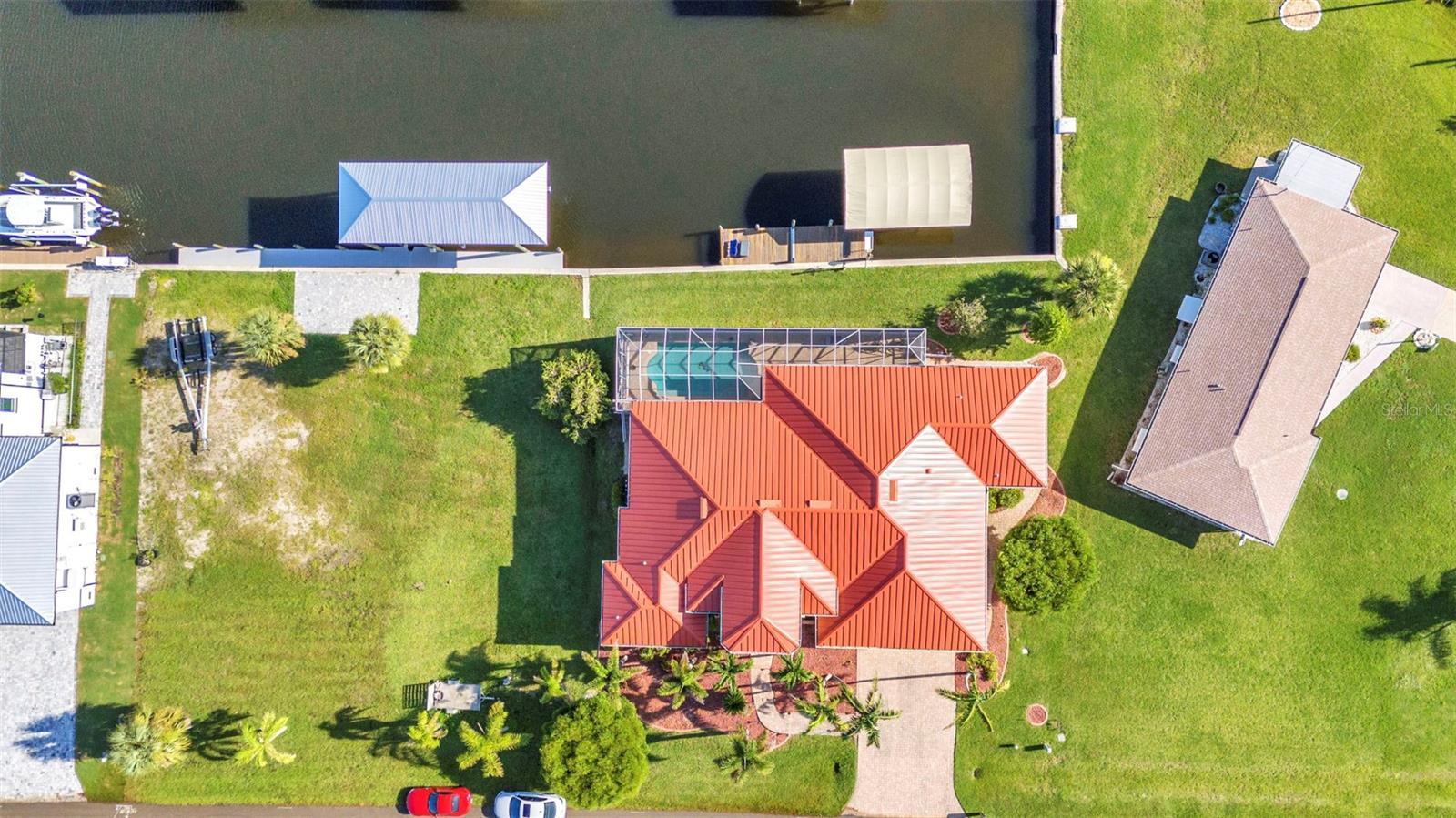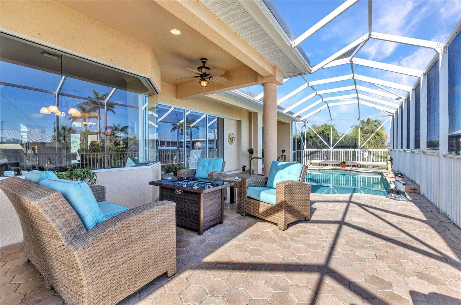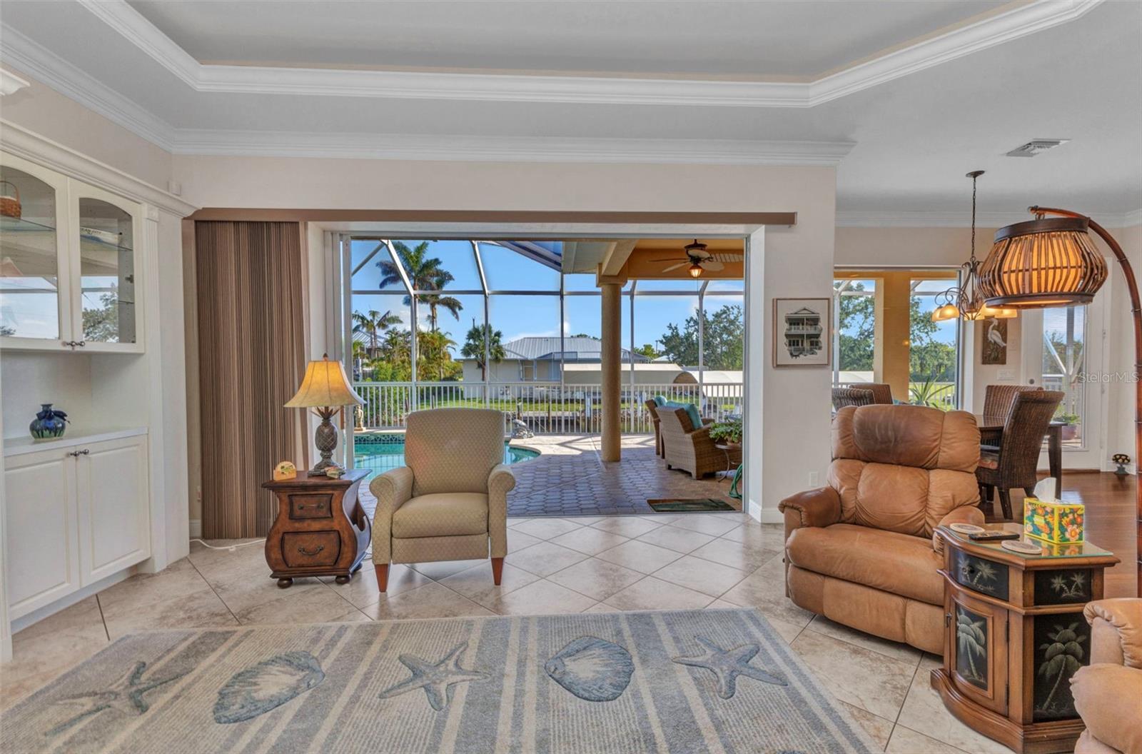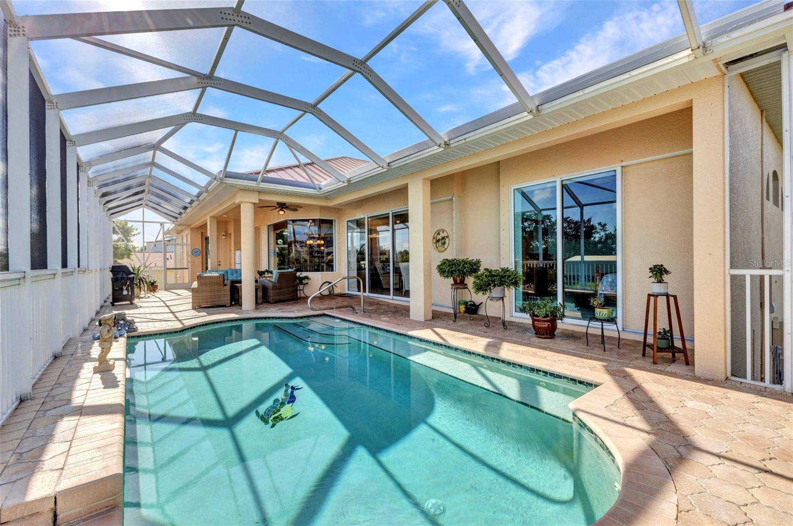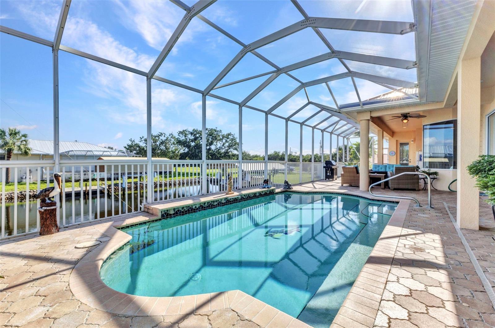 Welcome to 24354 Pirate Harbor Blvd, a beautifully maintained custom-built waterfront home in the desirable boating community of Pirate Harbor. Ideally situated at an elevation of 11.5 feet, this residence offers peace of mind along with breathtaking water views and direct sailboat access to Charlotte Harbor and the Gulf of America—an exceptional retreat for boaters and sunset enthusiasts alike. Built in 2009 and meticulously cared for by its original owners, this home features over 2,400 square feet of thoughtfully designed living space. From the moment you enter through the elegant double etched-glass front doors, you’re welcomed by an open, airy layout accented by diagonally laid tile, tray ceilings, bullnose corners, and abundant natural light. The spacious living room flows seamlessly into the kitchen and dining areas, creating an inviting space for both everyday living and entertaining. Just off the main living area, a private office or den with double doors and a tray ceiling provides a quiet place to work, create, or relax. The dining area is highlighted by a stunning aquarium window, framing tranquil views of the water and lanai and bringing the beauty of the outdoors inside. The kitchen is both charming and functional, offering a center pot sink, raised dishwasher, breakfast bar, cabinet lighting, and carefully selected drawer hardware designed to complement the countertops—one of many thoughtful details throughout the home. The primary suite is a peaceful retreat featuring a spacious walk-in closet and pocket sliders leading to the luxurious ensuite bath. The primary bathroom includes a lighted tray ceiling, jetted tub, Roman shower, dual vanities, private water closet, and linen storage.Guests will appreciate their own private wing, complete with two bedrooms connected by a Jack-and-Jill bathroom featuring a Roman shower, tray ceiling, and linen closet. A conveniently located half bath with direct lanai access is perfect for pool days and outdoor entertaining. Step outside to the southern-exposure lanai, designed for year-round enjoyment. The heated saltwater pool with solar cover is surrounded by ample space for lounging and dining. A utility sink and pool storage room with a drain—easily convertible to an outdoor shower—add exceptional functionality. Boaters will love the 8x32 wood dock equipped with water and electric at the fish station, ideal for cleaning your catch or enjoying quiet waterfront evenings. The 10,000 lb boat lift includes a newer canvas cover, and the dock chairs and fishing box convey with the home—ready for your next adventure. The garage offers an impressive 8x10 lofted storage area with stand-up height, a rare and valuable feature. Additional highlights include impact glass throughout, Kevlar protection for sliding doors, pre-wired security, seven hose bibs, and electrical outlets on every plant shelf—perfect for lighting or seasonal décor. A transferable flood insurance policy adds even more value and peace of mind. Recent updates include: • New metal roof (2023) • Hot water heater (2024) • Water softener (2024) • AC system (2020) This is a rare opportunity to own a truly exceptional waterfront home in Pirate Harbor. Schedule your private showing today and experience coastal Florida living at its finest.