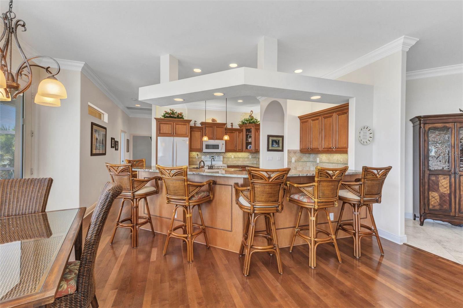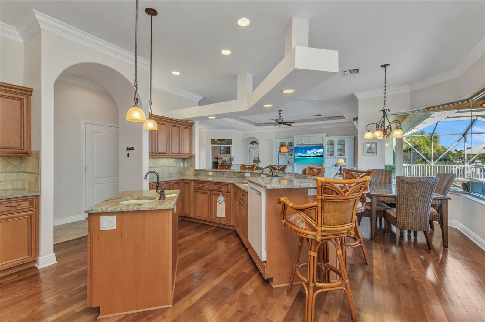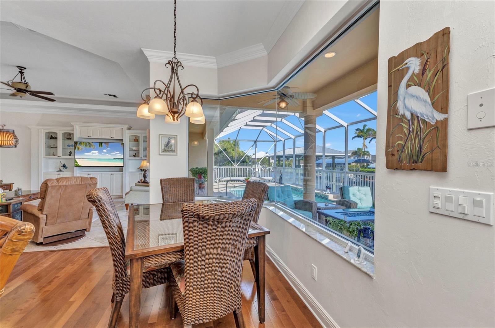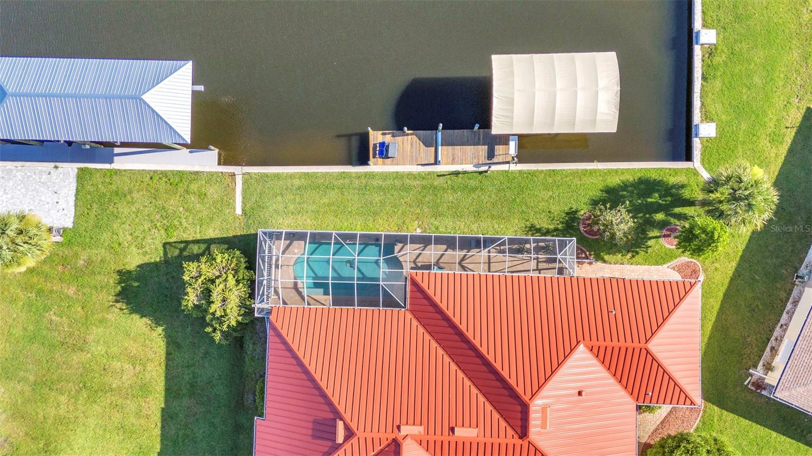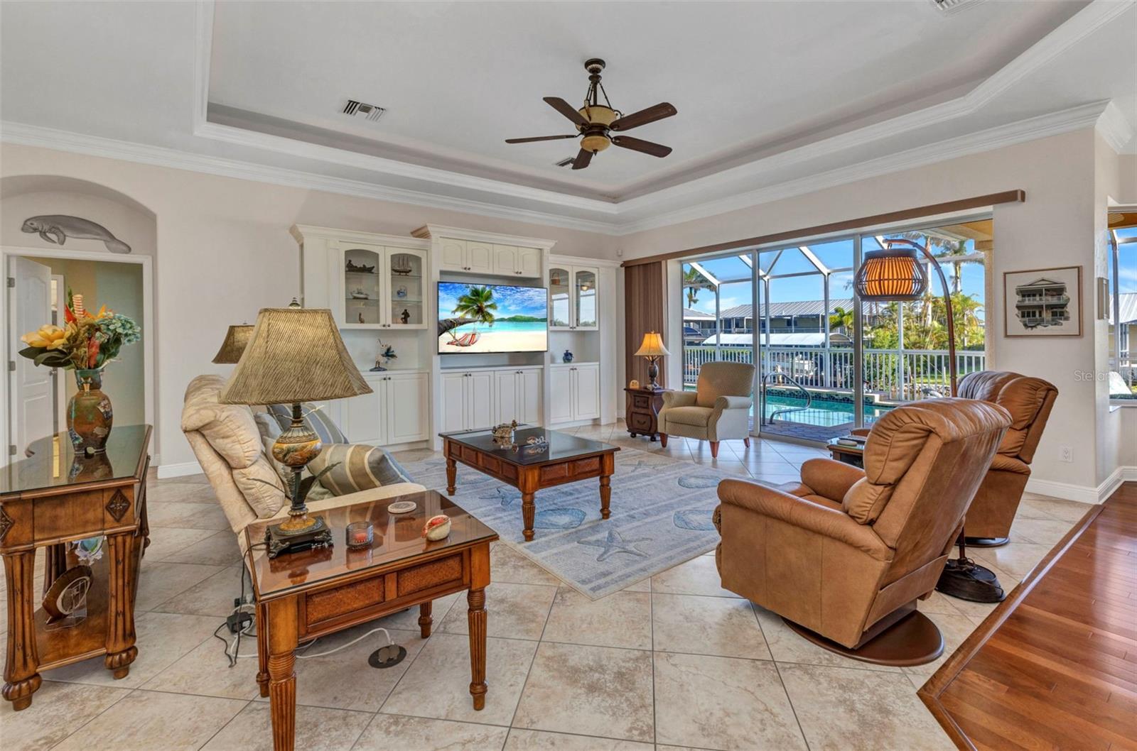 Welcome to 24354 Pirate Harbor Blvd, a beautifully maintained custom-built waterfront home in the desirable boating community of Pirate Harbor. Ideally situated at an elevation of 11.5 feet, this residence offers peace of mind along with breathtaking water views and direct sailboat access to Charlotte Harbor and the Gulf of America—an exceptional retreat for boaters and sunset enthusiasts alike. Built in 2009 and meticulously cared for by its original owners, this home features over 2,400 square feet of thoughtfully designed living space. From the moment you enter through the elegant double etched-glass front doors, you’re welcomed by an open, airy layout accented by diagonally laid tile, tray ceilings, bullnose corners, and abundant natural light. The spacious living room flows seamlessly into the kitchen and dining areas, creating an inviting space for both everyday living and entertaining. Just off the main living area, a private office or den with double doors and a tray ceiling provides a quiet place to work, create, or relax. The dining area is highlighted by a stunning aquarium window, framing tranquil views of the water and lanai and bringing the beauty of the outdoors inside. The kitchen is both charming and functional, offering a center pot sink, raised dishwasher, breakfast bar, cabinet lighting, and carefully selected drawer hardware designed to complement the countertops—one of many thoughtful details throughout the home. The primary suite is a peaceful retreat featuring a spacious walk-in closet and pocket sliders leading to the luxurious ensuite bath. The primary bathroom includes a lighted tray ceiling, jetted tub, Roman shower, dual vanities, private water closet, and linen storage.Guests will appreciate their own private wing, complete with two bedrooms connected by a Jack-and-Jill bathroom featuring a Roman shower, tray ceiling, and linen closet. A conveniently located half bath with direct lanai access is perfect for pool days and outdoor entertaining. Step outside to the southern-exposure lanai, designed for year-round enjoyment. The heated saltwater pool with solar cover is surrounded by ample space for lounging and dining. A utility sink and pool storage room with a drain—easily convertible to an outdoor shower—add exceptional functionality. Boaters will love the 8x32 wood dock equipped with water and electric at the fish station, ideal for cleaning your catch or enjoying quiet waterfront evenings. The 10,000 lb boat lift includes a newer canvas cover, and the dock chairs and fishing box convey with the home—ready for your next adventure. The garage offers an impressive 8x10 lofted storage area with stand-up height, a rare and valuable feature. Additional highlights include impact glass throughout, Kevlar protection for sliding doors, pre-wired security, seven hose bibs, and electrical outlets on every plant shelf—perfect for lighting or seasonal décor. A transferable flood insurance policy adds even more value and peace of mind. Recent updates include: • New metal roof (2023) • Hot water heater (2024) • Water softener (2024) • AC system (2020) This is a rare opportunity to own a truly exceptional waterfront home in Pirate Harbor. Schedule your private showing today and experience coastal Florida living at its finest.