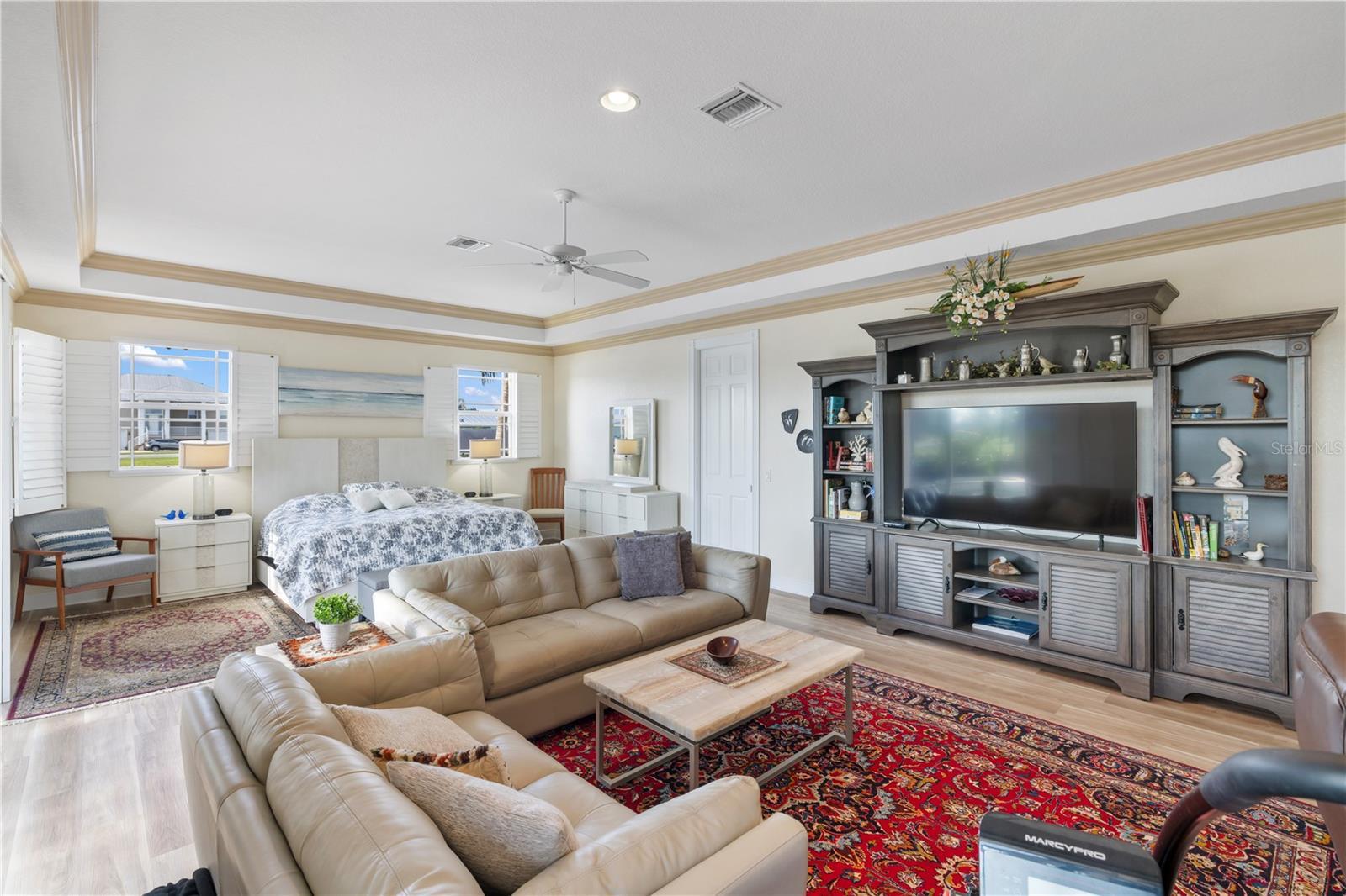 - Built-in Features, Ceiling Fans(s), Crown Molding, High Ceilings, Open Floorplan, Primary Bedroom Main Floor, Solid Surface Counters, Split Bedroom, Stone Counters, Tray Ceiling(s), Vaulted Ceiling(s), Walk-In Closet(s), Window Treatments