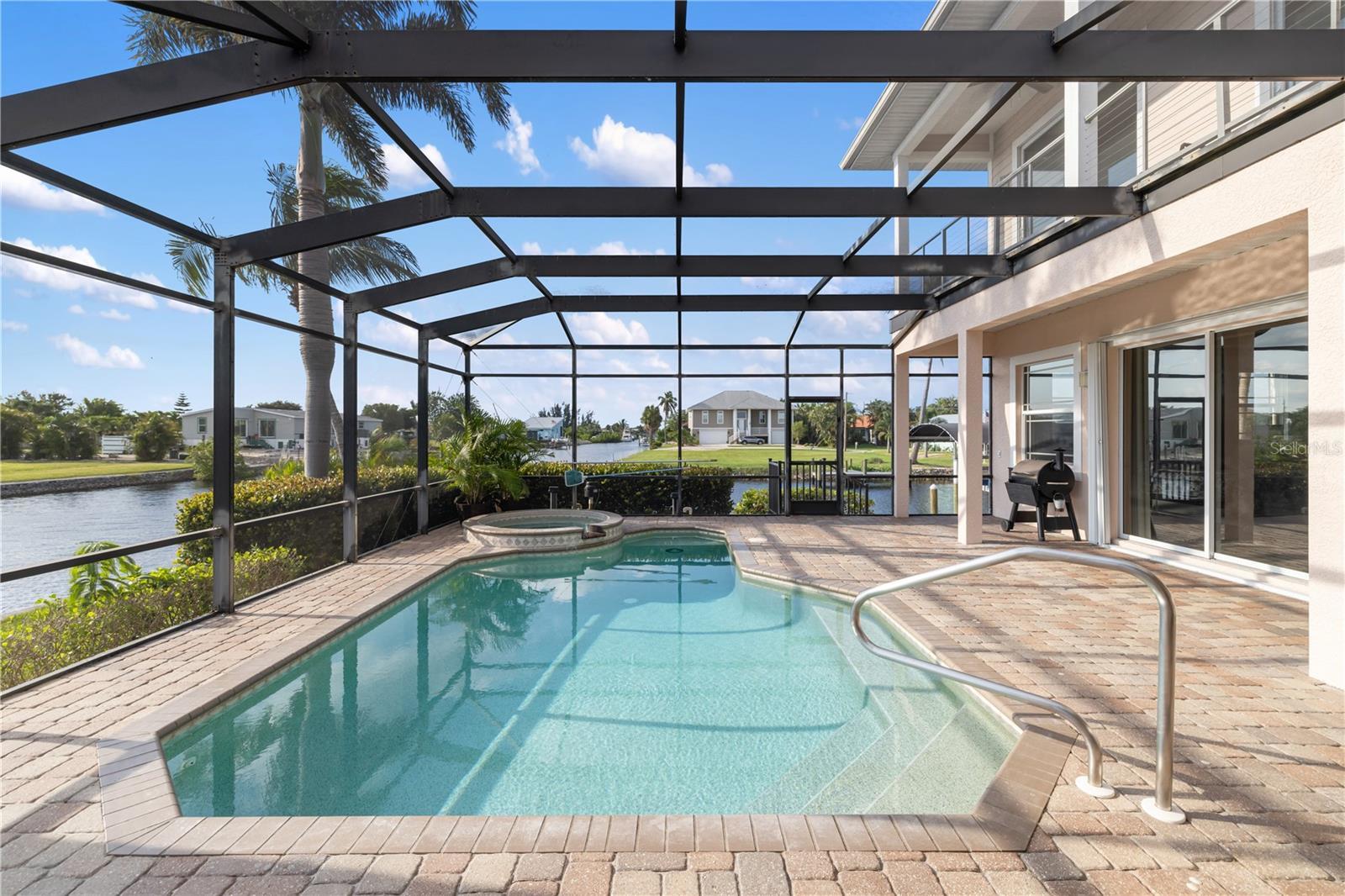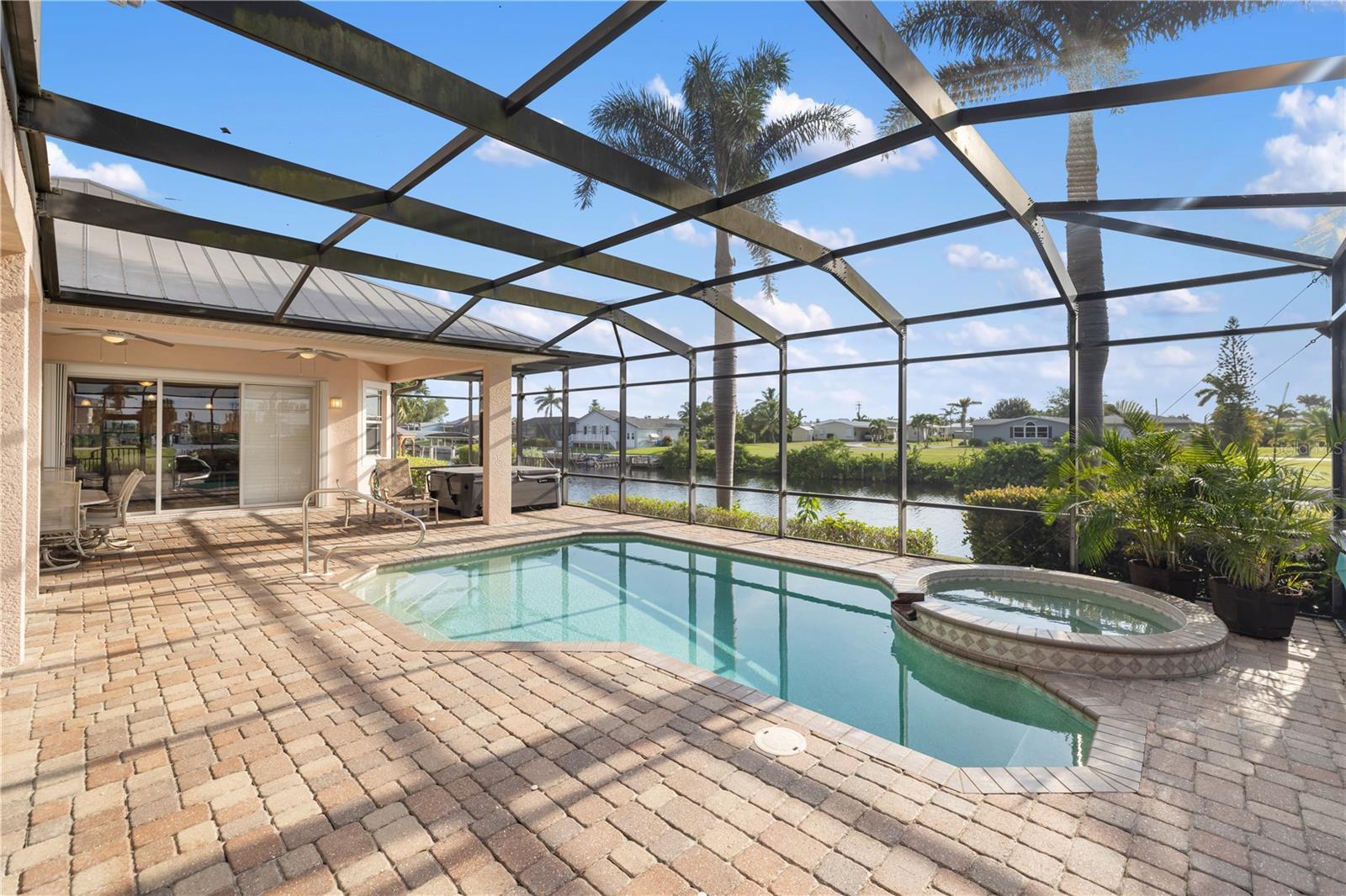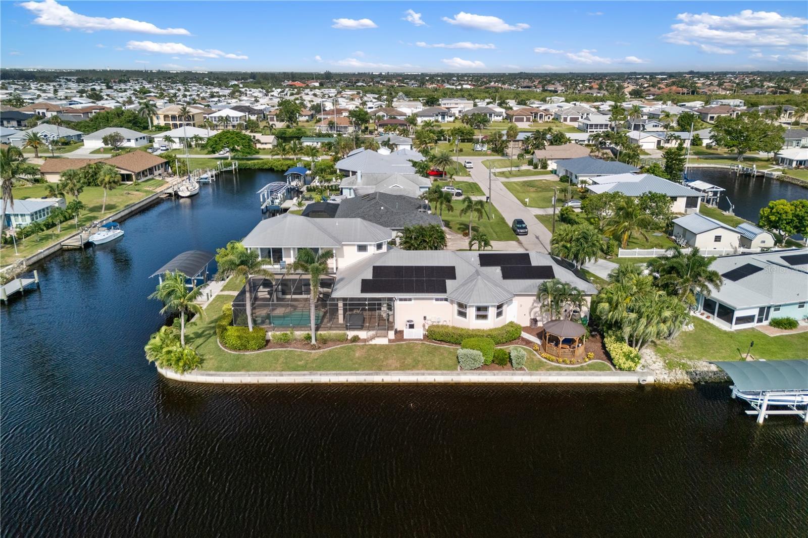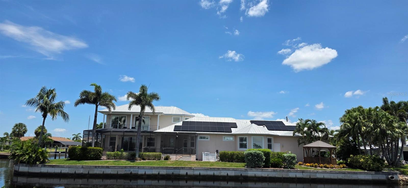 Welcome to Paradise!! Time to Start Living the Florida Lifestyle in this Luxurious 4 Bedroom, 3.5 Bath, 2 Car Garage Pool Home offering 247 feet of Sailboat Saltwater Frontage with 20 ft Composite Dock and Covered Boat Lift that can hold up to 9,000 lbs.....With over 4100 sf under air and 5700 total sf, you will be astonished how much room and privacy you have in this spectacular home. Brand New Lawn recently installed. You will fall in love with this Beautiful Florida Home as you walk through the etched glass double doors....into the foyer that flows into the Great room with amazing views of your private saltwater heated pool and stunning views of the waterway. The living room area features vaulted ceilings with a built-in entertainment center that includes the tv. The Kitchen is a chef's dream with a huge 2-tier breakfast bar, granite countertops, plenty of cabinets and countertop space and center island with wine rack for that extra touch.... The dinette area has three huge windows with exquisite views of the water...The formal dining room has tray ceiling with crown molding to give it that extra touch of class. The Primary bedroom is located on the main floor and is immaculate and huge, has two walk-in closets, large sitting area with sliding glass doors out to your private sparkling pool. Primary Bathroom is amazing with long vanity with dual sinks, garden tub, glass enclosed walk-in shower that is nicely tiled with 5 jets & handheld showerhead and separate toilet area. The second bedroom/office is also on the main floor and quite spacious with two closets. The second bathroom is on the main floor and features a nice vanity, glass enclosed walk-in shower, built-in shelves and door out to your lanai/pool area. The 3rd and 4th bedrooms are upstairs and have walk-in closets and both have sliding glass doors out to the adjoining balcony with new Nezan balcony railings with Spectacular Views of Your New Florida Lifestyle!! The third bathroom is just across from the two bedrooms upstairs... features long vanity with dual sinks, tub/shower with nice tile walls and linen closet. The laundry room is nice size just off the kitchen and features washer, dryer, utility sink and kitchen pantry closet. Half bath is just off the kitchen and great room. Other Features of this Gorgeous Waterfront Home: Tile flooring throughout except the bedrooms and formal dining room have luxury vinyl flooring, Plantation shutters throughout including on all the sliding glass doors, high impact windows, 35 Solar Panels with Electric bill under $50 a month, A/C 2019 & 2021, water heaters 2016 x 2 upstairs, metal roof screws replaced in 2023, Gazebo 2023, concrete curbing 2023, pool heater/pump 2023, Hot tub with cover 2022 and more..... ***One Year Home Protection Plan Included*** Relax out back by your sparkling pool or enjoy hanging out at your Gazebo with breathtaking views of the water.... plenty of room to entertain... Nearby shopping, restaurants, golfing, fishing, parks, beaches and more...... Great Price!!! Great Curb Appeal!!! Great Location!!! Don't miss the boat on this "Exquisite Living Experience"!! Call today for your private showing. Start Living the Florida Lifestyle Now!!