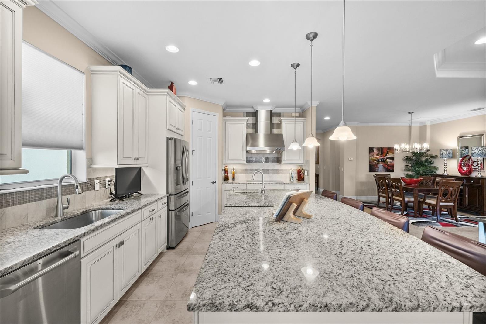 - Built-in Features, Ceiling Fans(s), Crown Molding, Eat-in Kitchen, High Ceilings, Kitchen/Family Room Combo, Living Room/Dining Room Combo, Open Floorplan, Primary Bedroom Main Floor, Solid Surface Counters, Solid Wood Cabinets, Split Bedroom, Tray Ceiling(s), Walk-In Closet(s), Window Treatments