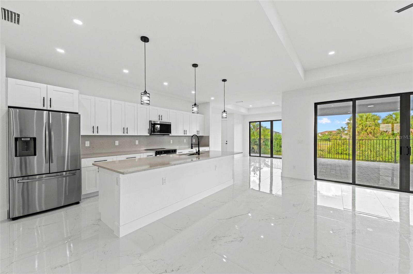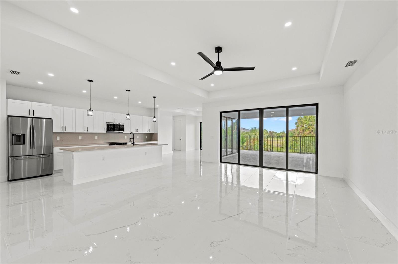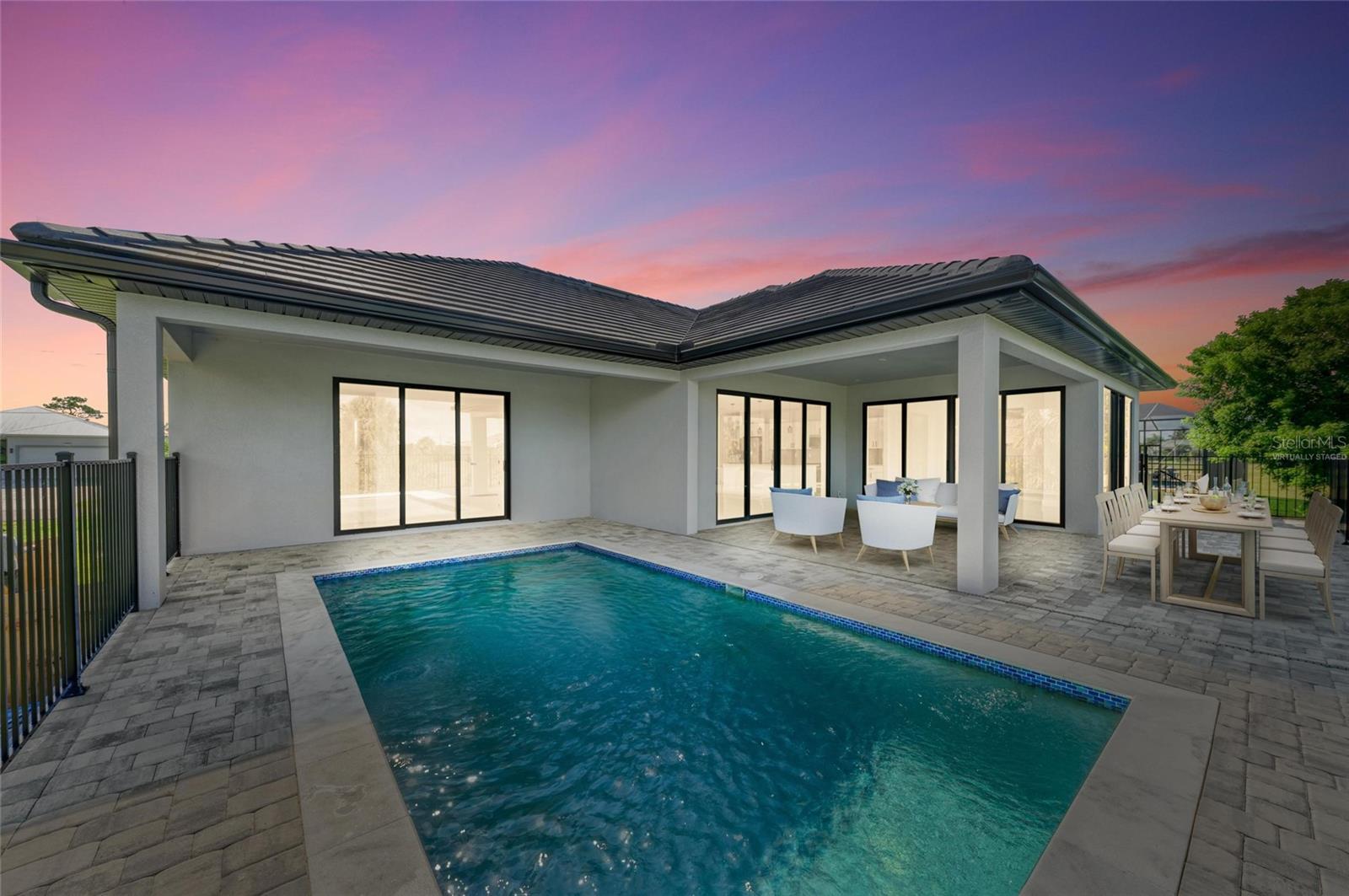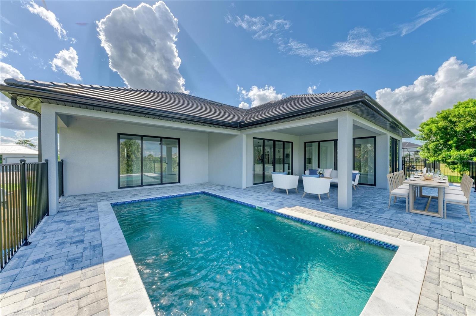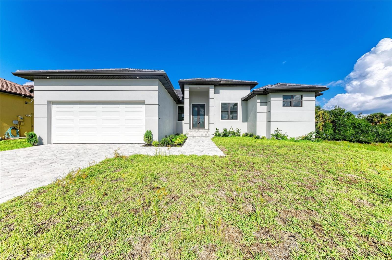 One or more photo(s) has been virtually staged. PRICE REDUCED $20,000! Paradise Found! Discover your dream coastal lifestyle in this brand-new 2025 custom pool home—offering the perfect blend of modern design, elegant comfort, and resort-style living at an incredible value. With over 2,600 sq ft under air (3,439 total), soaring ceilings, and a wide-open layout, this home lives large and bright. Located in the desirable harborfront community of Burnt Store Lakes, you’ll enjoy easy access to the best of Southwest Florida—boating, golf, dining, and more—all just minutes away. The striking curb appeal begins with clean modern lines, a 14-ft portico entry, multiple tile rooflines, and a paver drive that sets a polished tone. Inside, dramatic 12-ft ceilings, sleek 8-ft doors, and glossy tile floors create a fresh, elegant backdrop. Thoughtful black accents—lighting, plumbing fixtures, and window frames—add a touch of timeless sophistication. The contemporary kitchen shines with granite counters, premium cabinetry, upgraded fixtures, and a 10-ft island with bar seating for effortless entertaining. The adjoining dining area overlooks the pool and opens seamlessly to the lanai. The owner’s suite is a private retreat with pool access, dual walk-in closets, a luxurious soaking tub, a spacious walk-in shower, and double vanities. Two additional guest bedrooms offer generous closets and natural light, while the den/flex room provides an ideal office or fourth bedroom option. Outdoor living takes center stage here—an oversized heated pool, extended sun patio, and elevated lanai create the perfect setting for relaxation or entertaining. Positioned along Punta Gorda’s Burnt Store Corridor, this home places you just moments from Safe Harbor Burnt Store Marina—the largest deep-water marina in Southwest Florida—with direct access to the Gulf of America, plus Freedom Boat Club, waterfront dining at Cass Cay, tennis, pickleball, and executive golf. Burnt Store Lakes residents also enjoy community parks, kayak launches, and scenic walking paths. Only 30 minutes to Punta Gorda Airport and an hour to Fort Myers—this is where luxury meets lifestyle. Don’t miss this exceptional opportunity!