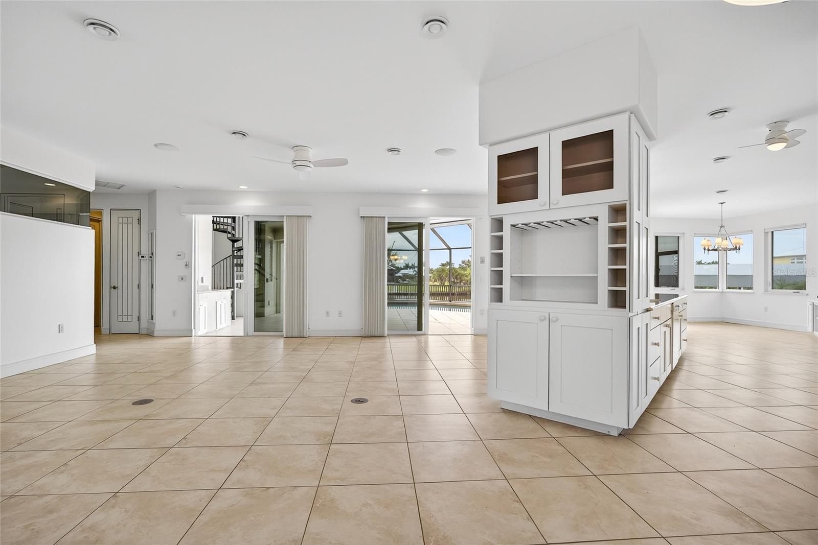 - Built-in Features, Ceiling Fans(s), Central Vaccum, Elevator, High Ceilings, Kitchen/Family Room Combo, Living Room/Dining Room Combo, Open Floorplan, Primary Bedroom Main Floor, Split Bedroom, Stone Counters, Thermostat, Tray Ceiling(s), Walk-In Closet(s)