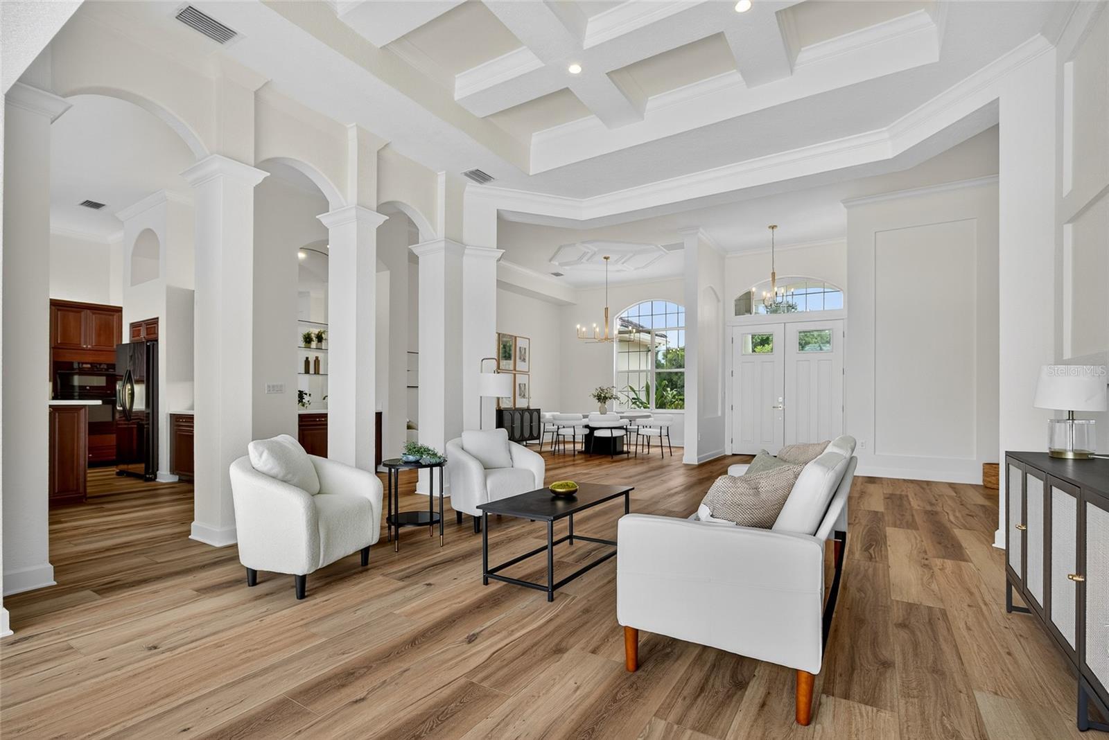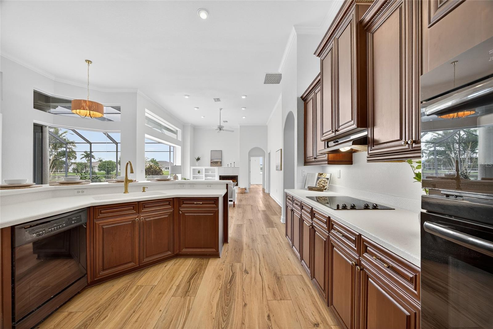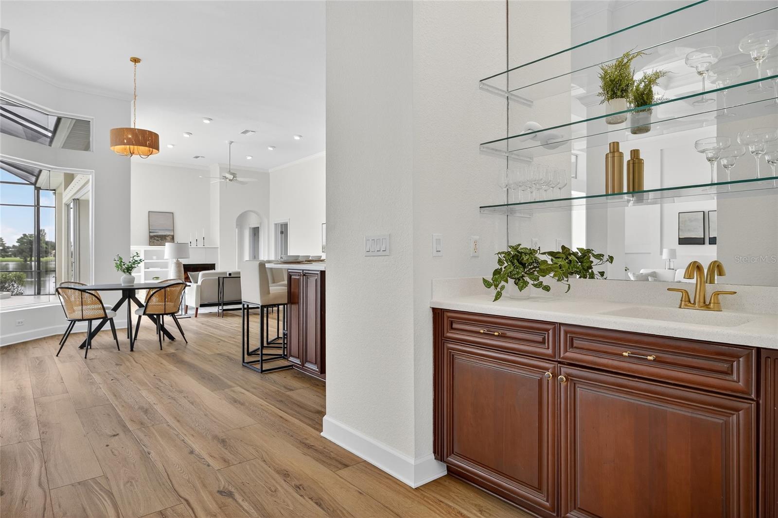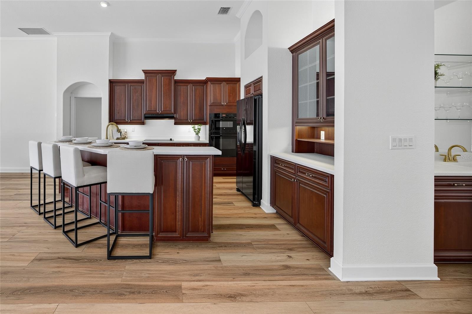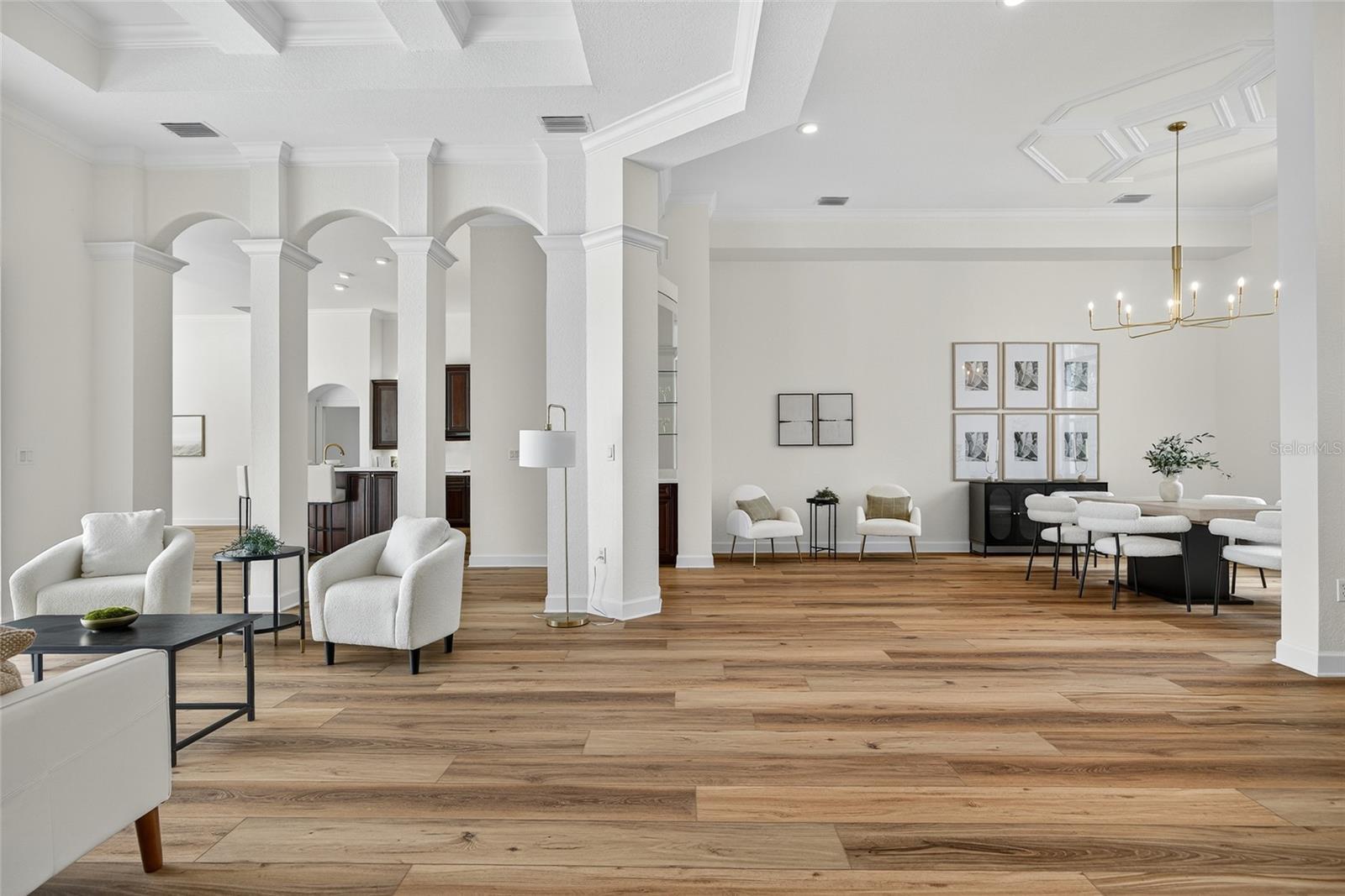 - Built-in Features, Ceiling Fans(s), Coffered Ceiling(s), Crown Molding, Eat-in Kitchen, High Ceilings, Kitchen/Family Room Combo, Living Room/Dining Room Combo, Open Floorplan, Primary Bedroom Main Floor, Solid Surface Counters, Split Bedroom, Stone Counters, Thermostat, Tray Ceiling(s), Walk-In Closet(s), Wet Bar