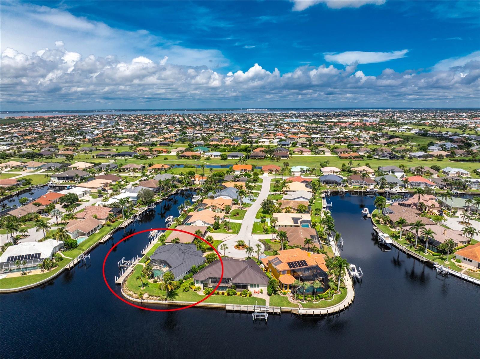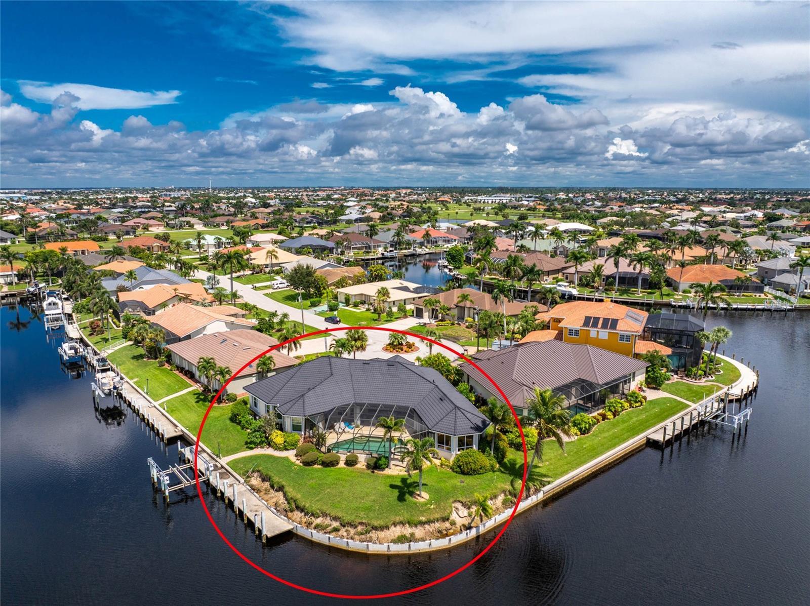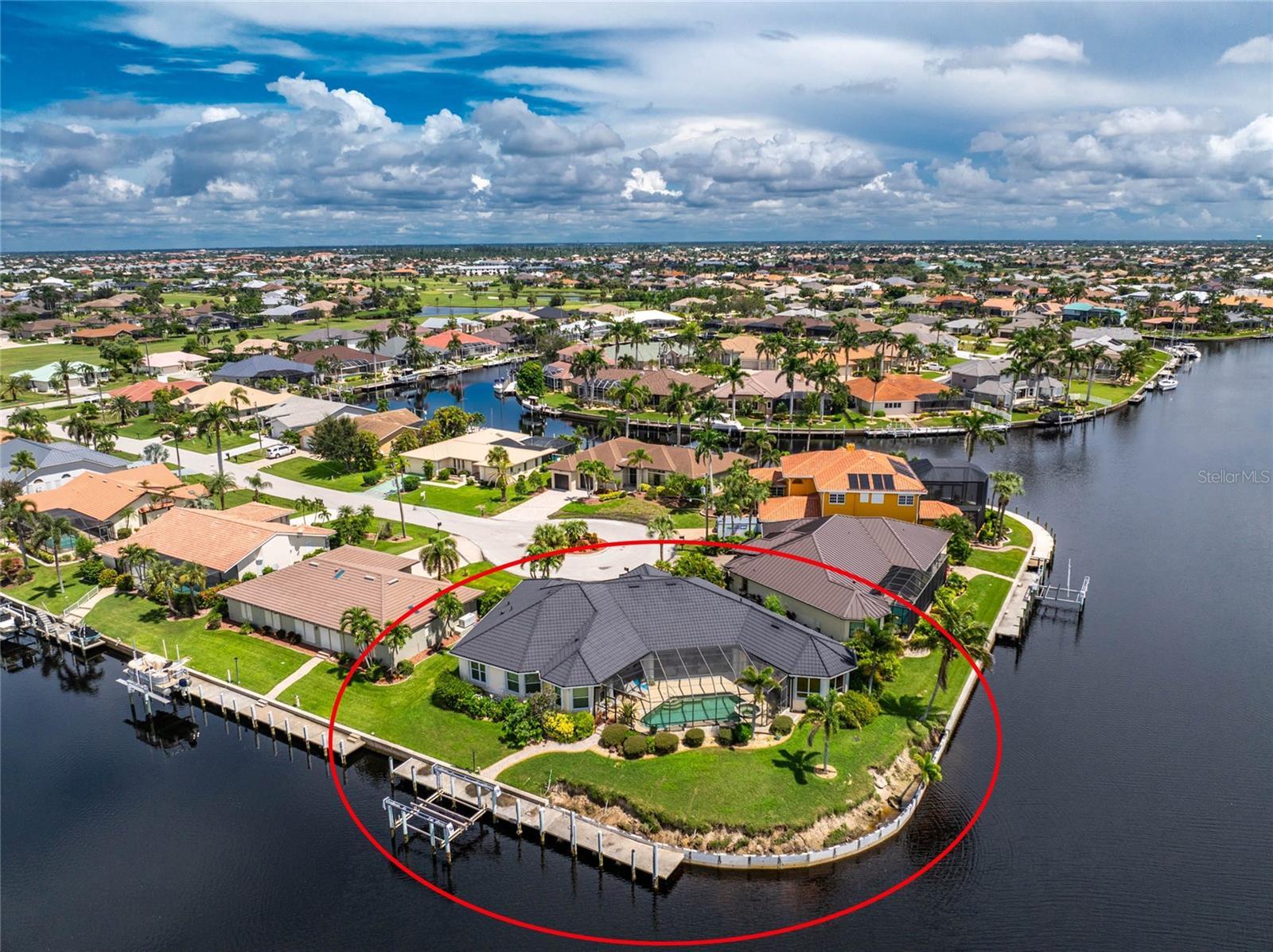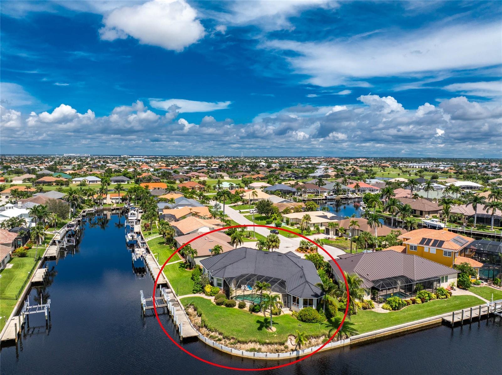 Under contract-accepting backup offers. Impressive custom WATERFRONT home built by Towles Construction located on a TIP LOT in desirable Punta Gorda Isles. *New 173 foot seawall* This spacious home offers 3 Bedrooms, Office and 2.5 Bathroom home with attached 2.5 Car Garage. This light and bright home offers an open and split bedroom floor plan with Great Room, formal Dining Room, well appointed Kitchen with Dining area, Media Room and screened Lanai. The Great Room offers disappearing sliding glass doors that open to the Lanai. The Kitchen offers granite counters, wood cabinets, excellent cabinet and counter space, built in oven, 4 burner gas range, desk and closet pantry. The home Office features a built in desk and bookcases.The Master Bedroom suite features Lanai access, oversized walk in closet/dressing room and private bathroom with dual sinks, walk in shower and garden tub. There are two additional generous sized bedrooms and one of the bedrooms has direct access to the guest bath.A half bath is located just outside of the media room and is also a Pool Bath. Continue to the screened Lanai via sliding glass doors with inground pool and attached spa. Continue to the waterfront with concrete seawall (maintained by the cit of Punta Gorda), 45 foot concrete dock and 13,500 lb boat lift. Other features include vaulted ceilings, cathedral ceilings, hurricane protection, irrigation system. **NEW ROOF 2023** There is NO HOA and the utilities are city water and sewer. This home is minutes from historic downtown Punta Gorda shopping, dining, medical care, waterfront parks, art galleries, walking and biking paths, Charlotte Harbor Event Center, boat ramps, fishing piers, weekend farmer and artisan markets, downtown events and more!