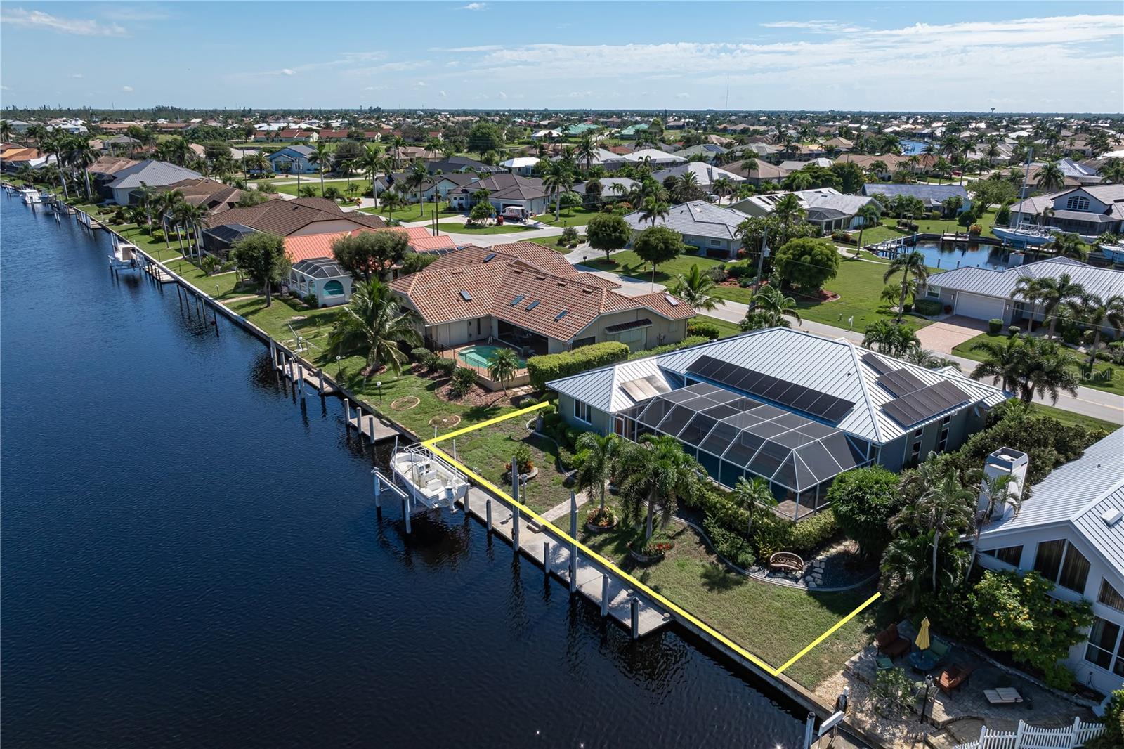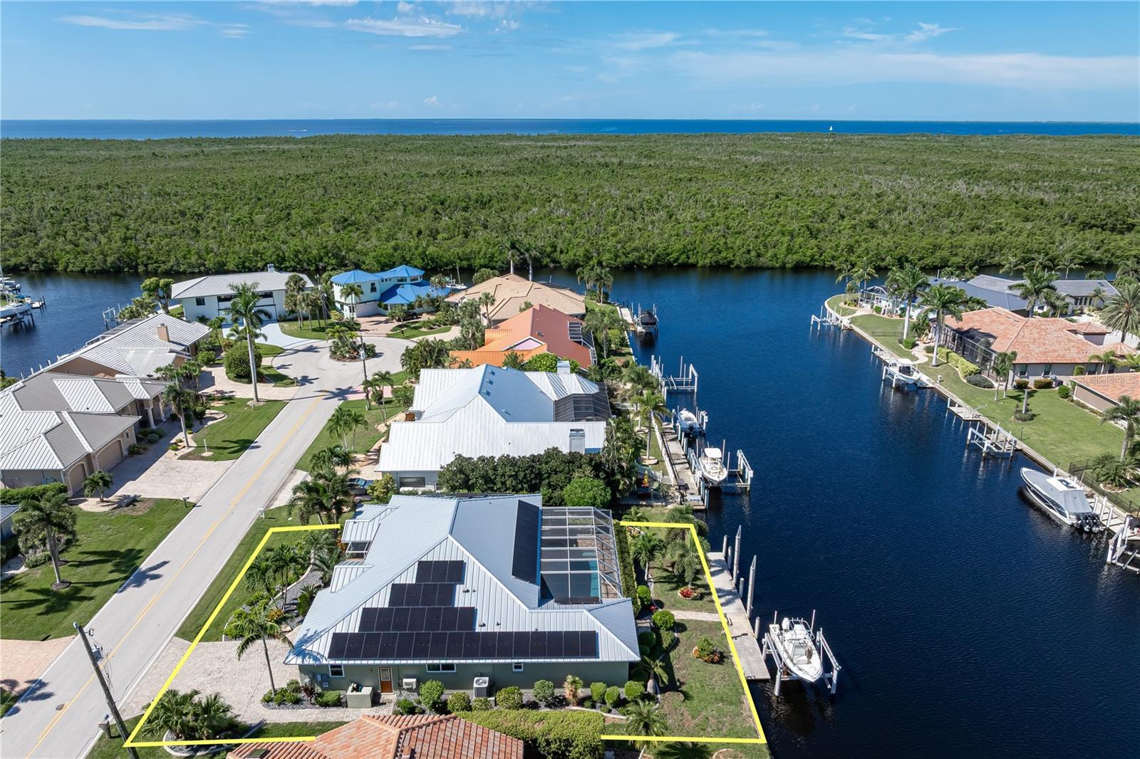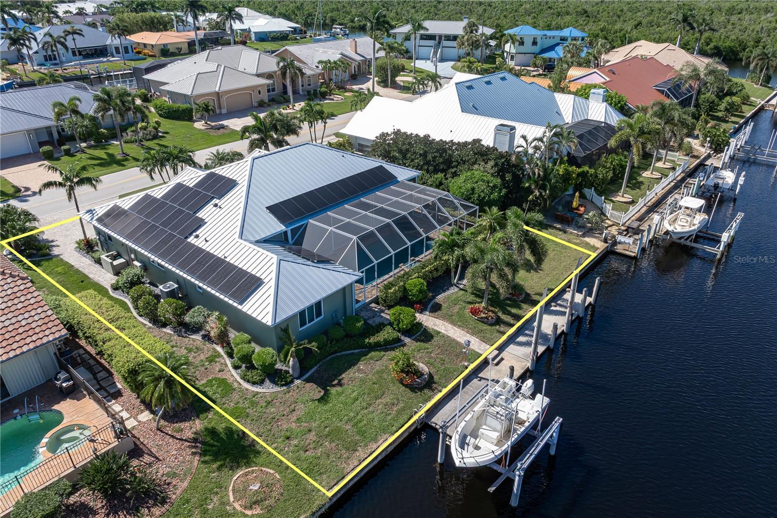 Under contract-accepting backup offers. UPDATED PGI WATERFRONT HOME W/100FT SEAWALL, QUICK SAIL ACCESS & WHOLE HOUSE SOLAR SYSTEM - This custom, 3 bed/2 bath, waterfront home by Fero Construction in PGI delivers everything a boater could want: oversized seawall, extended concrete dock w/boat lift plus quick sail access to Charlotte Harbor via Buckley's Pass or Ponce Outlet. The recently installed whole-house solar system offers a huge costs savings. Inside, the great room sets the tone with soaring ceilings, updated travertine floors, and a wall-mounted, floating entertainment center featuring lighted displays, built-in cooling fans for electronics as well as a hidden desk. Disappearing sliding glass doors connect the interior seamlessly to the lanai, blending indoor and outdoor living. The kitchen impresses with waterfall quartz counters, stainless steel appliances, custom cabinetry, and a center island. A bar area with lighted display cabinets adds both function and style and features a hidden wine refrigerator. The master suite has pool and canal views, dual walk-in closets, and a luxurious bath with dual sinks, granite counters, a soaking tub, and a glass-enclosed shower with two rain showerheads and body sprayer. The master bath also features a TOTO toilet w/motion-activated, heated seat & bidet features. The split bedroom floor plan offers guest rooms that are tucked away on the opposite side of the home. Guest rooms share an updated bath. The layout is ideal for visiting friends or family. Step outside to your private oasis: a screened lanai with brick paver deck surrounding the in-ground, heated pool w/attached spa. Plenty of room for outdoor entertaining here. Relax under the shade of the covered area or soak up some Florida sun poolside. Lush, tropical landscaping surrounds the home. The backyard leads directly to your dock, where your boat is always ready for the next adventure. The 55ft concrete dock offers two slidemoors, 10,000 lb boat lift plus water & (30amp) electric hook-ups. Other amenities include solar power that runs the entire home, an attached, 2-car garage w/epoxy floor, whole-house hurricane protection, Alexa controls in kitchen & master suite as well as a security system w/interior & exterior cameras. Schedule your showing today and start living your Florida dream here.