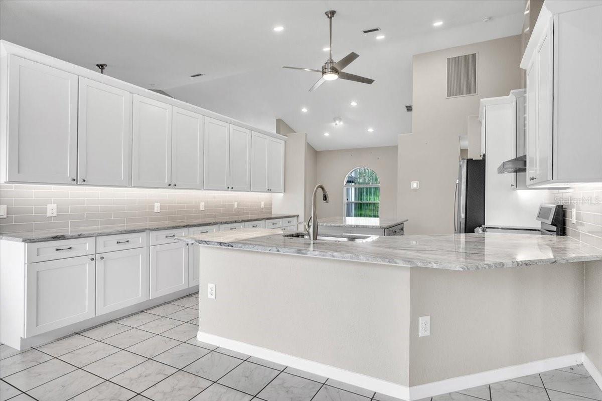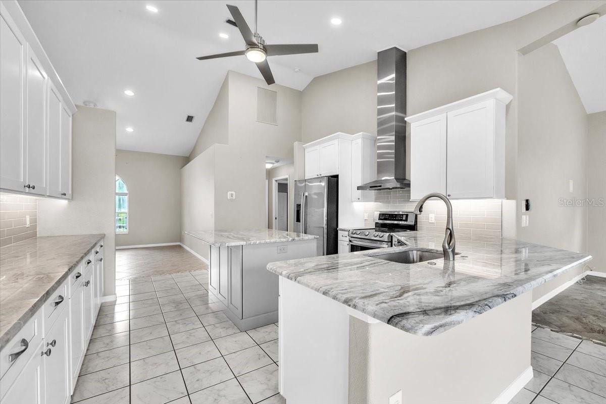 - Cathedral Ceiling(s), Ceiling Fans(s), Eat-in Kitchen, High Ceilings, Kitchen/Family Room Combo, Living Room/Dining Room Combo, Primary Bedroom Main Floor, Split Bedroom, Stone Counters, Thermostat, Tray Ceiling(s), Walk-In Closet(s), Window Treatments