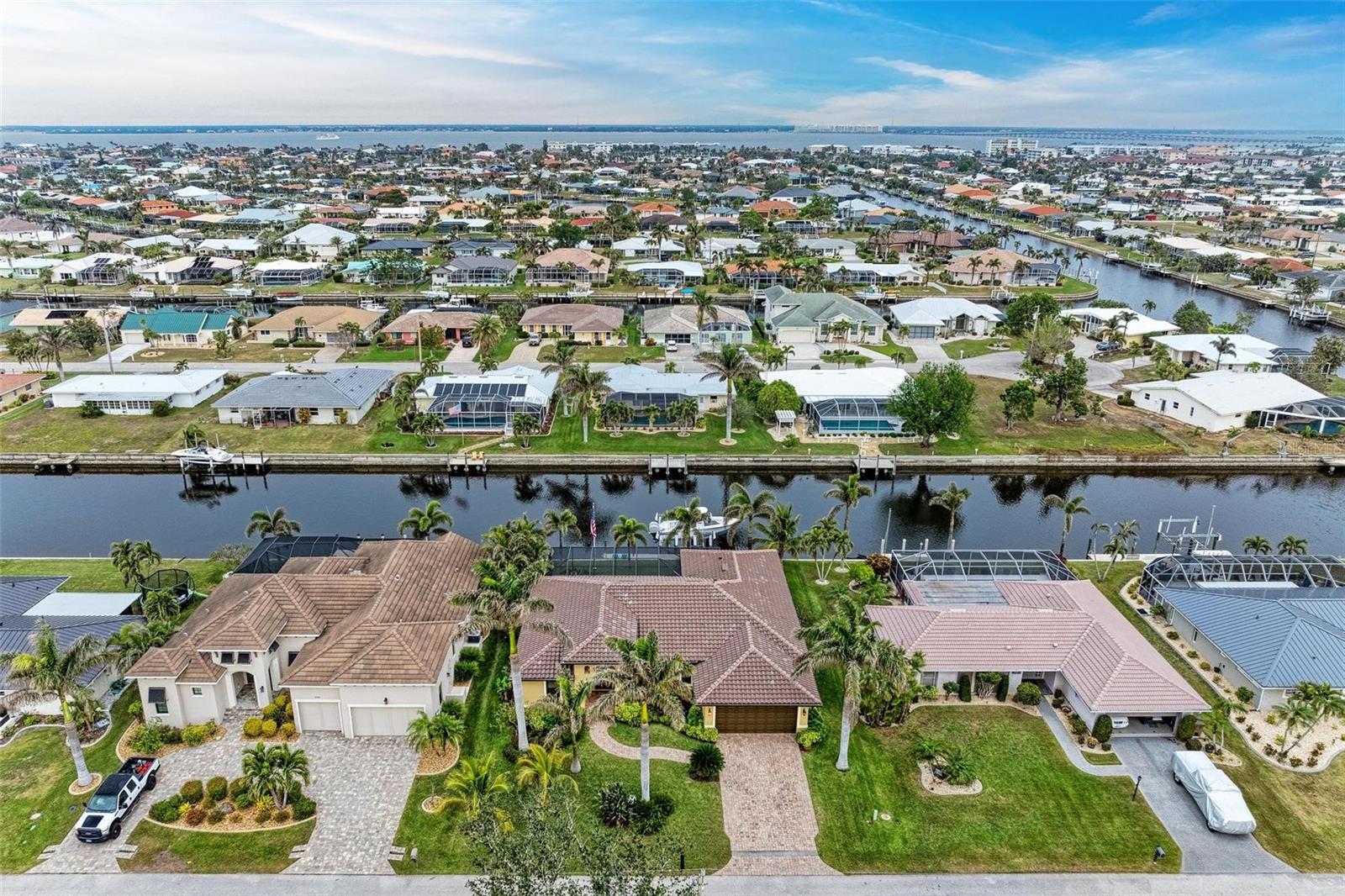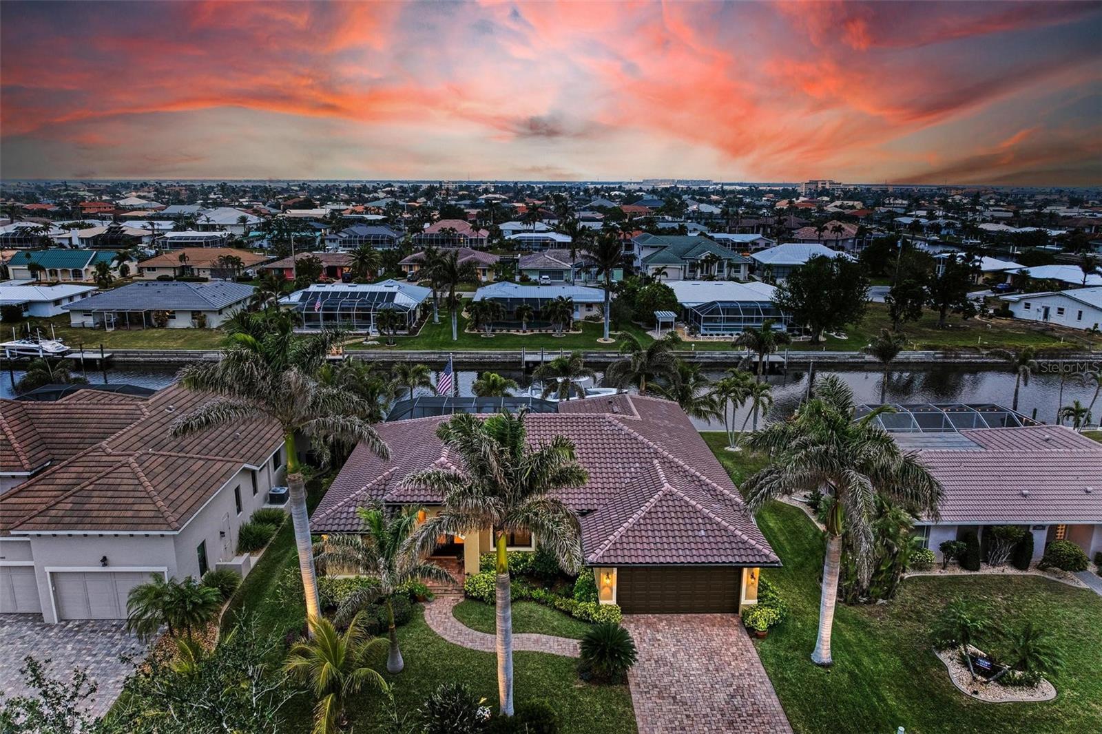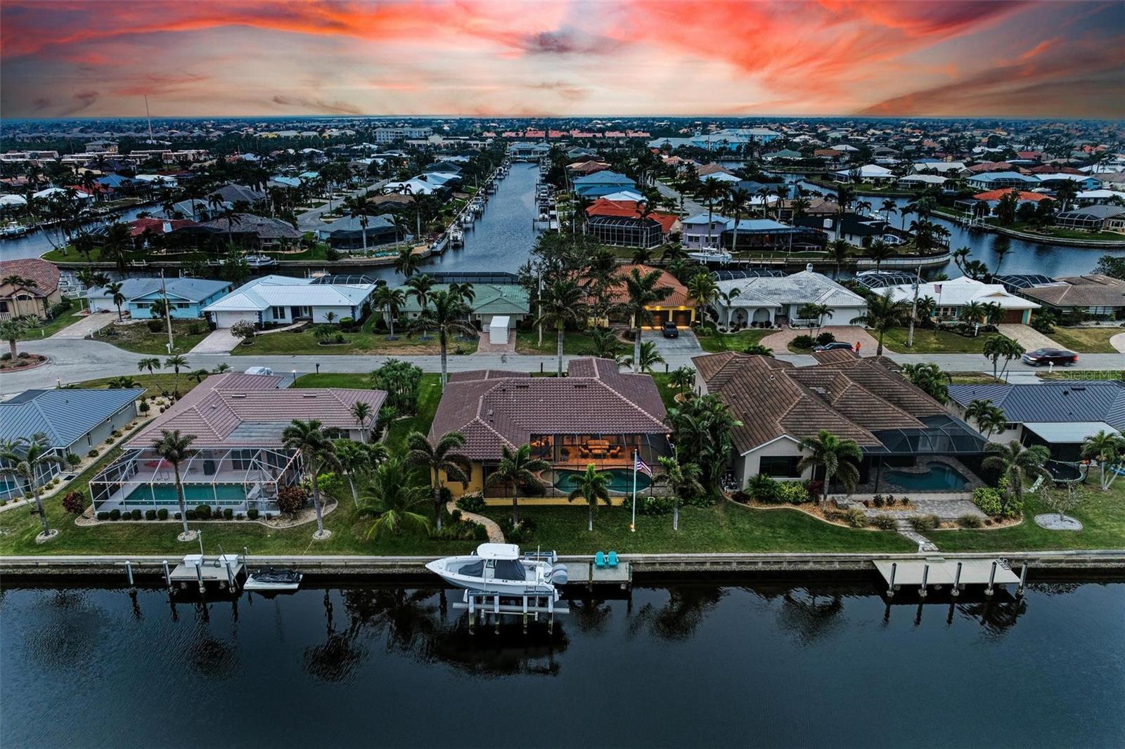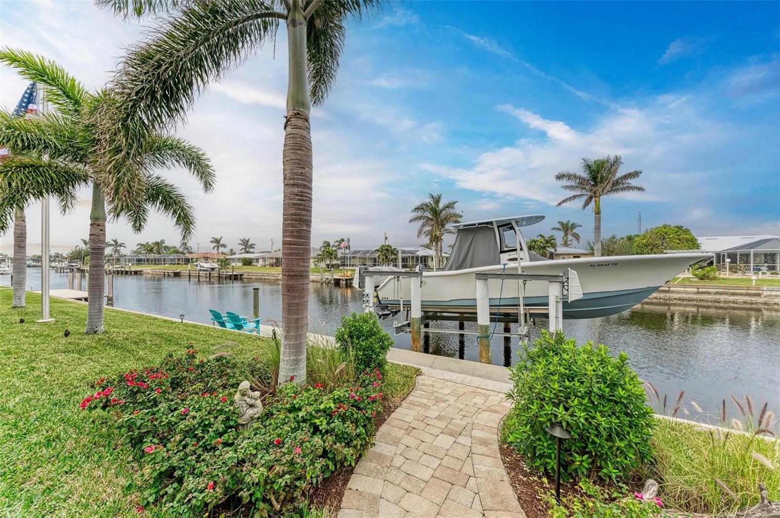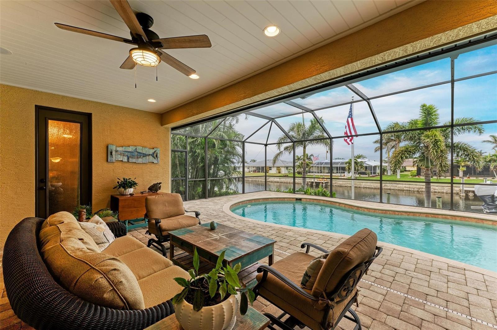 Under contract-accepting backup offers. WATERFRONT LUXURY AWAITS at this gorgeous 2013 built custom POOL HOME with incredible and unique features! This 3-bedroom, 3 full bath –2,205 sqft air conditioned / 3,260 sqft total home on an 85’ x 120’ oversized lot has an oversized two car garage with a large climate-controlled storage room, a NEW cement tile roof with double underlayment, new soffit and 7” gutters, a refurbished cage, new garage epoxy flooring, all completed in 2024. Inside, enjoy two guest bedrooms, each with their own bathroom on the left side of the home, an open concept design including the dining room, spacious great room, kitchen and dinette all open to the outdoors via six - 8’ tall sliders that create indoor/outdoor spaces with wonderful views of the water and pool, a beautiful primary suite with dual walk-in closets and an en-suite bathroom with separate tub and walk-in shower, and upgraded dual vanities. Additional features include a large inside laundry room with extra storage, a commercial grade flagpole, upgraded landscaping, audio speakers in main living area and outside porches, Impact windows and Storm Smart hurricane shutters for lanai, 20” porcelain tile flooring throughout, tongue and groove ceilings in main living area and outside porches, a huge walk-in pantry large enough for a deep freeze off the beautiful gourmet kitchen, an amazing outdoor kitchen and bar with propane grill and additional two burner cooktop, a heated saltwater gunite pool that is 7’ deep, landscape decorative lighting, a fabulous 35' concrete dock with 20,000 lb lift, shore power, and 2 hose spigots. This home also is GENERATOR READY with a plugin adaptor for home power. Nearby to great shopping, restaurants, marinas, golf, parks and more, you will not want to miss this! BE SURE TO CLICK THE FULL VIRTUAL TOUR LINKS FOR DETAILS!