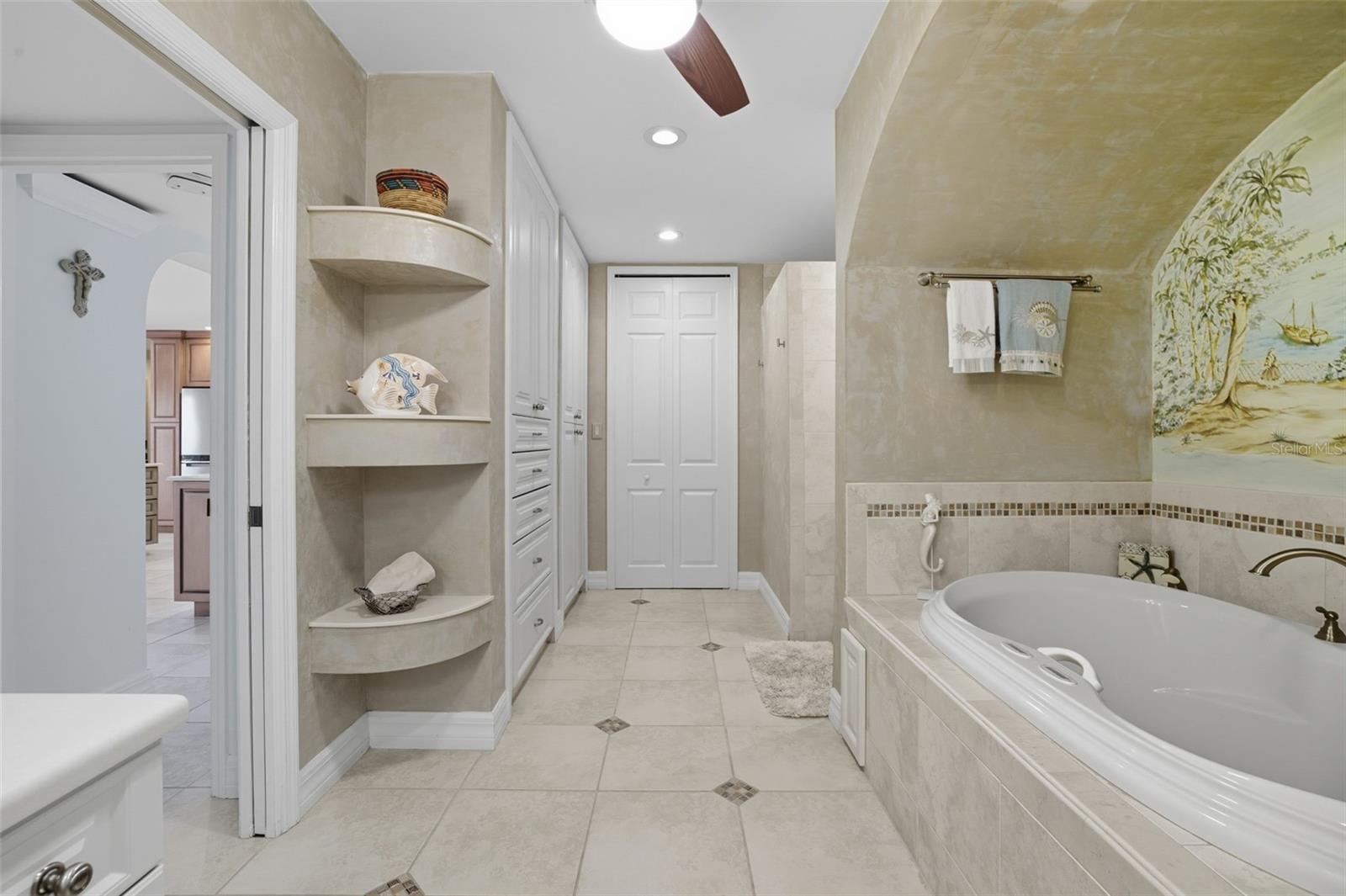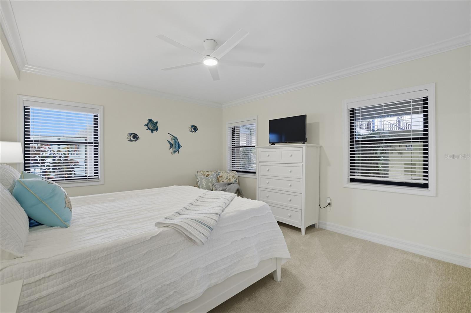 - Built-in Features, Ceiling Fans(s), Crown Molding, Open Floorplan, Primary Bedroom Main Floor, Window Treatments