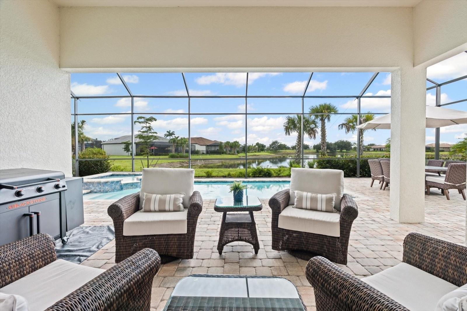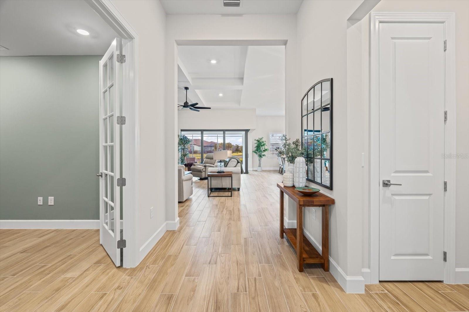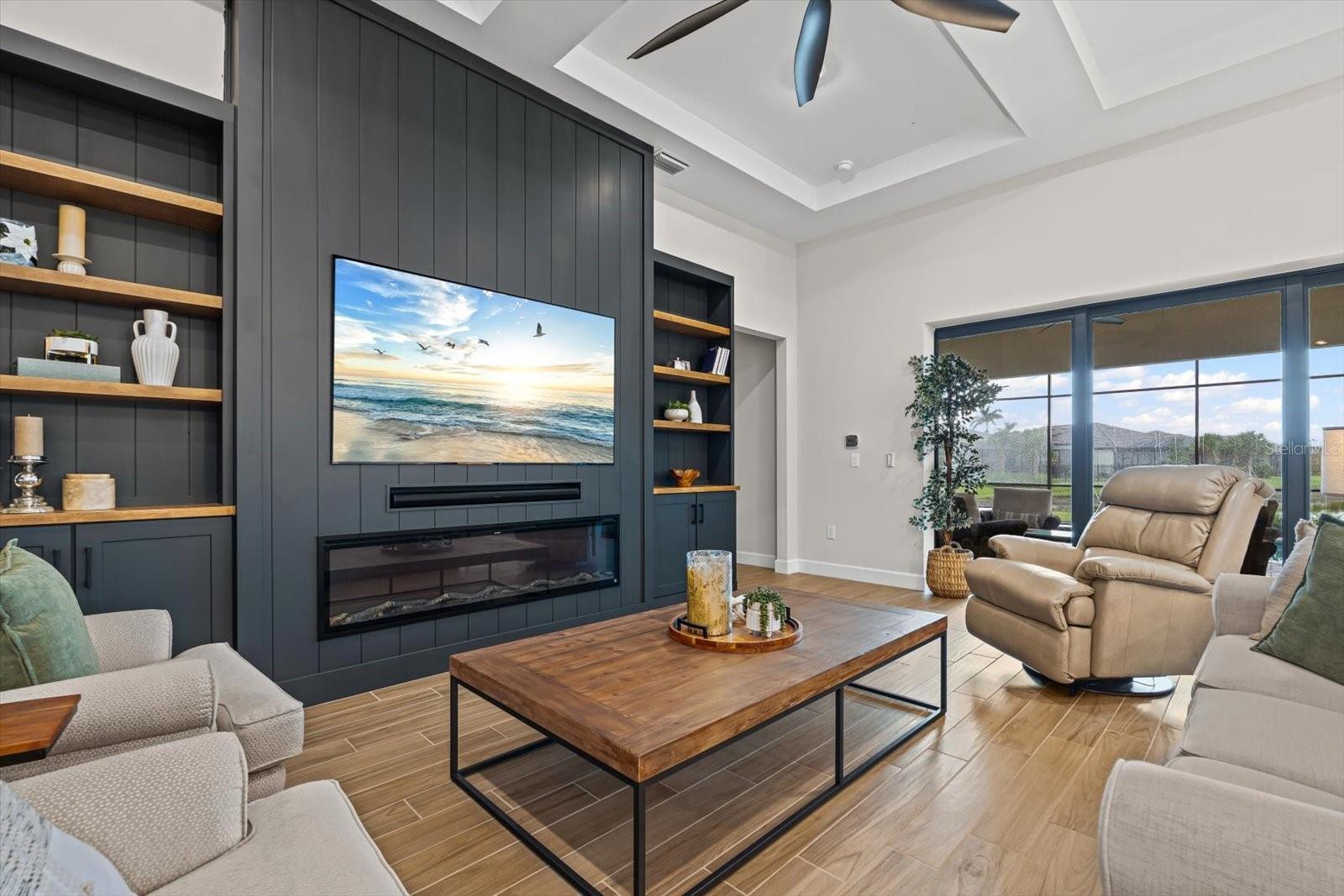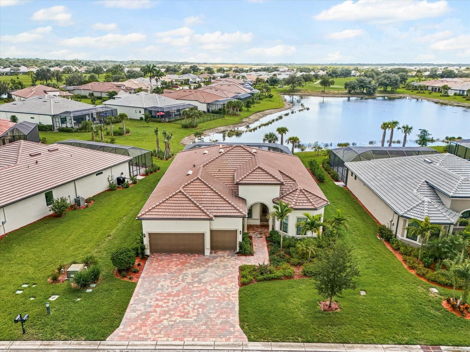 Experience refined elegance in this stunning, model-inspired home nestled on a serene cul-de-sac lot with breathtaking water and golf course views in the prestigious River Hall Country Club. From the moment you enter, exquisite craftsmanship captivates, with soaring coffered ceilings in the living room, elegant tray ceilings in the primary and guest suites, and custom built-ins in the private office, complete with cabinets and a desk for work or relaxation. Vibrant custom accent walls, designer paint, and a dramatic entertainment wall in the living room create a sophisticated ambiance. The open-concept chef’s kitchen, with sleek darker island cabinets for bold contrast, flows seamlessly into the great room and dining area—an entertainer’s dream. Plantation shutters throughout add timeless charm. The primary suite is a tranquil sanctuary, featuring custom wall accents, a spa-inspired bath with dual vanities, an oversized walk-in shower, and a meticulously organized walk-in closet. Guests will feel pampered in private retreats, one with an en-suite bath and another offering ample comfort and privacy. Glass zero-corner sliding doors open to an expansive covered lanai, perfect for unforgettable gatherings, complete with a heated pool and spa for year-round relaxation and generous deck space for lounging or games. The three-car garage, ideal for car enthusiasts or golf cart lovers, provides abundant storage, blending function with luxury. River Hall Country Club offers a vibrant lifestyle with HOA and golf fees covering an array of premium amenities: cable, high-speed internet/WiFi, irrigation water, lawn/land maintenance, exterior pest control, access to recreational facilities, 24/7 security, street lights, street maintenance, and the renowned championship golf course. Enjoy pickleball courts, a resort-style pool, a state-of-the-art fitness center, a clubhouse, and on-site dining. Seize this extraordinary opportunity—schedule your private tour today and elevate your lifestyle in this unparalleled haven of luxury and leisure! No Flood Insurance required...located in desireable Zone "X".