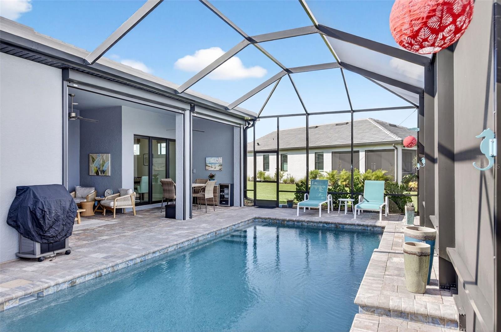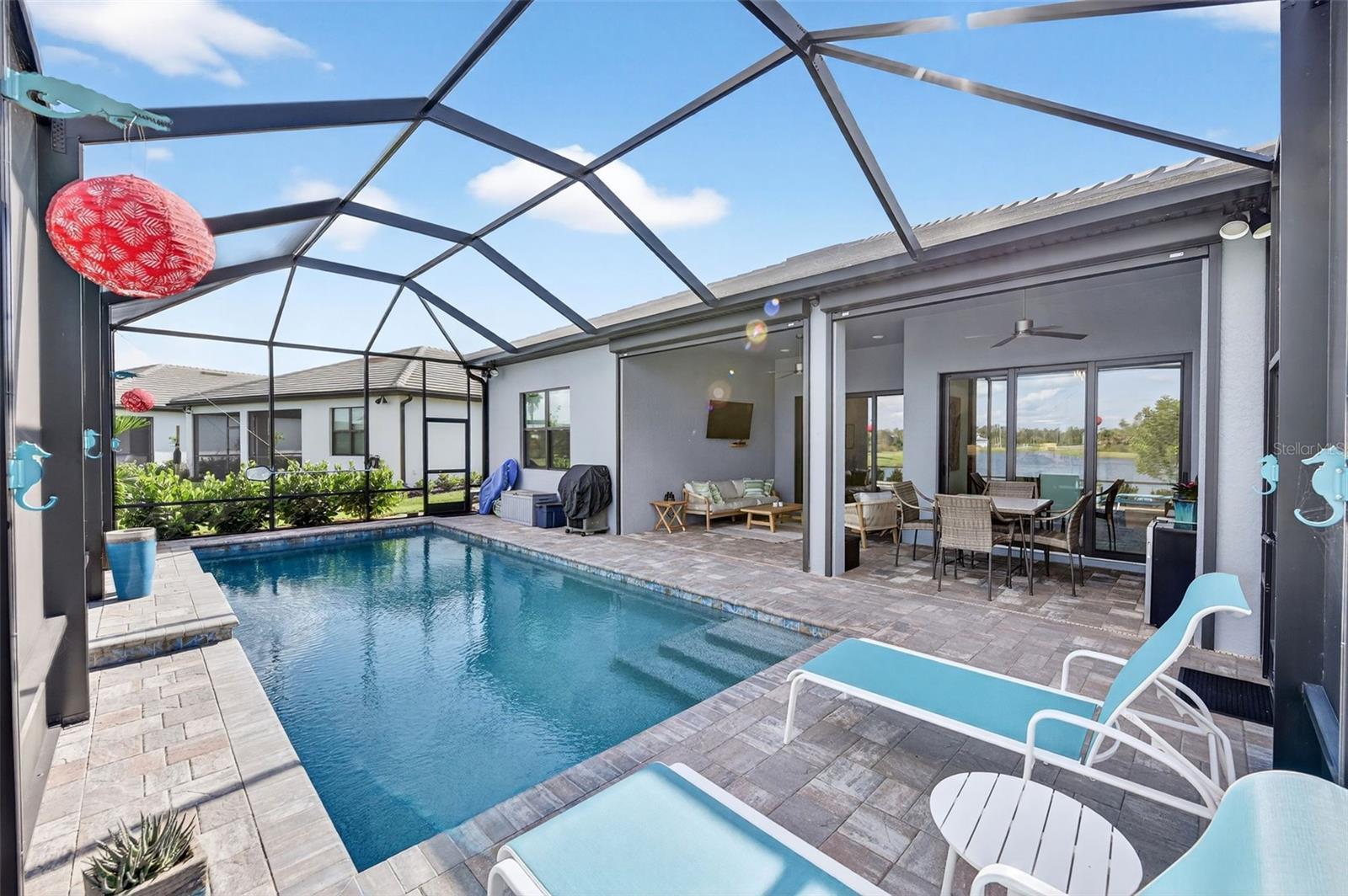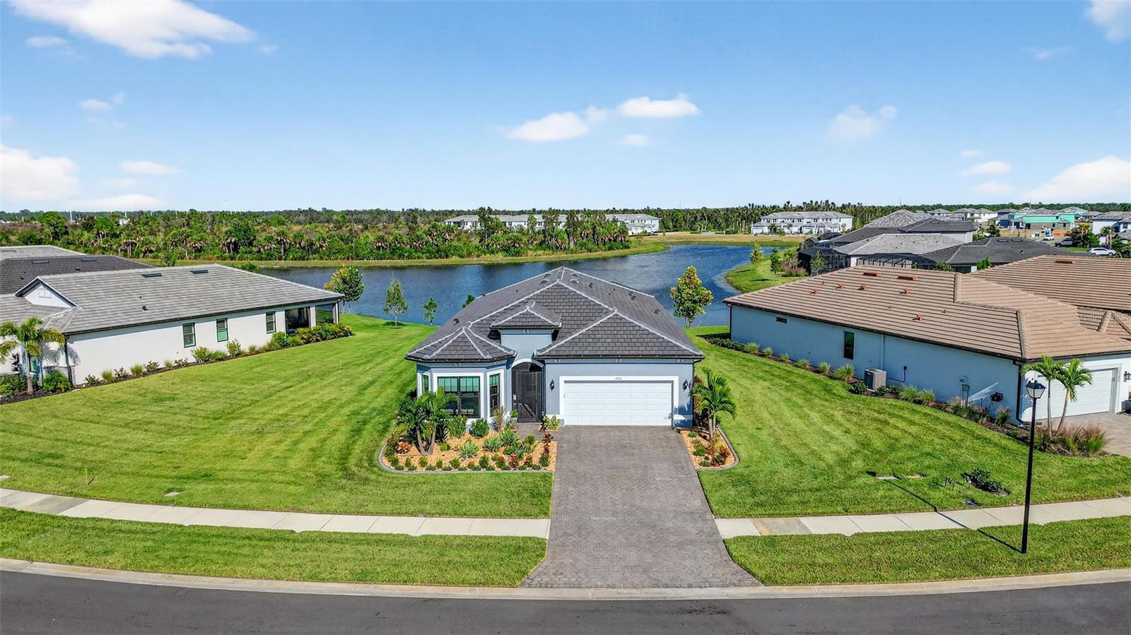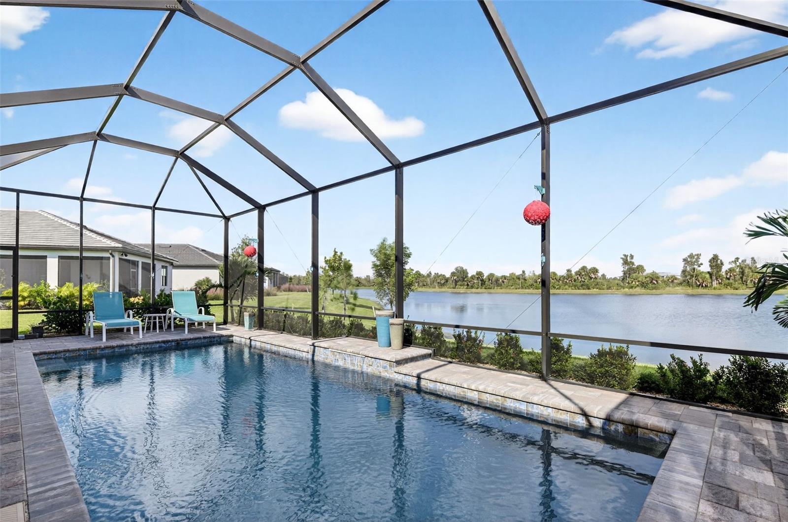 Experience luxury living in this upgraded Prestige model home on a spacious 0.25± acre lake view lot in the desirable gated community of Lakespur in the award-winning master planned development of Wellen Park. An exceptional Pulte built three-bedroom, two-and-a-half-bath home offering 2,098 square feet of thoughtfully designed space. Enjoy the new front-screened-in entry porch and relax in your gorgeous oversized screened-in and private saltwater heated pool with tranquil lake views. Take advantage of the versatile flex room—perfect for a third bedroom, den or office. Sophisticated porcelain tile flooring flows throughout and 10’4” – 11’ ceilings are complemented by tray ceilings and crown molding for a refined touch. Dual master suites provide exceptional privacy and comfort, with the primary suite featuring an oversized walk-in shower, dual sinks, and two large walk-in closets. The gourmet kitchen has been expertly upgraded, showcasing a custom design with six high-end appliances and pendant lighting, elevating the culinary experience. Plumbed for an outdoor kitchen, you’ll have endless opportunities for alfresco dining and entertaining. You’ll appreciate the stress-free protection of this Pulte built “smart home” showcasing the best in construction and quality materials, including tile roofing with steel-enforced concrete block construction and professional engineered roof trusses with hurricane tie-downs for wind. The "tubes in wall" pest defense system is a clever feature that keeps pests out of the home. The home has a brand new electric powered roll down hurricane impact screens protecting the oversized lanai, new auto-operated roll down interior shades for ease of added privacy, and ceiling fans throughout provide both pleasing aesthetics and year-round comfort. The garage has been expanded by 4 feet, providing additional storage space, and the epoxy floor adds a sleek and durable finish. Professionally upgraded landscaping and automatic sprinkler system completes the exterior, creating a visually appealing, and easily maintained property. The home offers many aftermarket features that are not available in new builds and at a fraction of their cost. Don’t miss the chance to own this exceptional lake view pool home—where every detail is designed for comfort, style, and flexibility. ***** Lakespur offers an intimate, community-focused lifestyle enhanced by exceptional amenities. Residents enjoy access to a resort-style pool, a cozy fire pit lounge, a playground, and a beautifully maintained event lawn for neighborhood gatherings. A fenced-in dog park and a 12-foot-wide paved walking trail provide the perfect setting for outdoor enjoyment and active living. Set in the heart of Wellen Park, this home offers easy access to a thriving area full of dining, shopping, and entertainment options. Experience the best of Florida living in this thoughtfully designed home in Lakespur at Wellen Park.