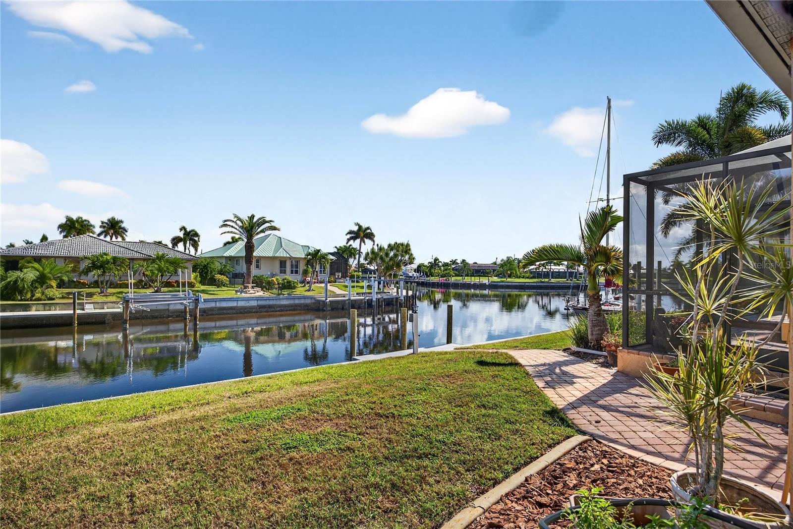 Under contract-accepting backup offers. PRIME WATERFRONT LOCATION! SAILBOAT OR POWERBOAT ACCESS IN MINUTES TO CHARLOTTE HARBOR LEADING TO THE GULF! Enjoy breathtaking intersecting canal views and fabulous sunrises in this tranquil setting. 82’ of waterfrontage with concrete seawall and dock, electric and ready to add lift. Meticulously maintained residence features 3 bedrooms, 2 baths, 3-car garage and offers a spacious 1,956 square feet of living area. Warm and soothing tones make this an inviting space featuring high ceilings, plantation shutters, large slider to lanai in great room and porcelain tile flooring with Herringbone design. Well-equipped kitchen offers granite counters tops, tall cabinetry, tile backsplash, stainless appliances, casual dining nook and breakfast bar with pendant lighting. Spacious primary suite features tray ceiling, an abundance of natural light, access to lanai and private bath with dual sinks and roman shower. Split bedroom plan affords plenty of privacy for all and the third bedroom is currently used as office with custom built-in desk in closet. Large utility room boasts extra space for storage and craft room. Step outside to a covered lanai, paver deck and screened heated pool with PebbleTec finish and waterfall overlooking beautiful water views. Additional features include security system, surround sound wiring in great room and den, above closet storage, Thermo pane windows with Low E glass, exterior 8' doors in kitchen and primary bedroom with sealed in blinds, front door mosaics, in wall pest control, newly screened pool enclosure, bifold storm shutters on lanai, landscape lights and curbing, plumbed for water softener, extra wide front sidewalk and lush tropical landscaping. Nestled on a quiet cul-de-sac street with great neighbors, this residence is just minutes from the Yacht Club, Fishermen's Village, and downtown historic Punta Gorda, offering easy access to arts, community events, entertainment, and world-class fishing. Do not miss this opportunity to own a waterfront home in a popular golf and boating community. Schedule your private showing today!