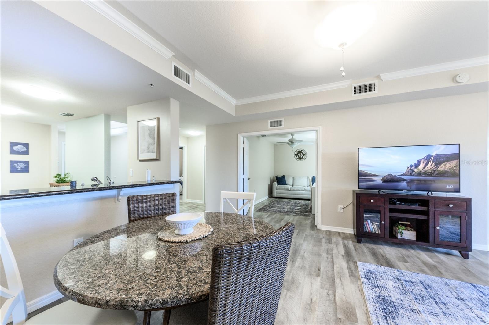 - Ceiling Fans(s), Crown Molding, Eat-in Kitchen, Living Room/Dining Room Combo, Open Floorplan, Solid Wood Cabinets, Split Bedroom, Stone Counters, Thermostat, Tray Ceiling(s), Walk-In Closet(s)