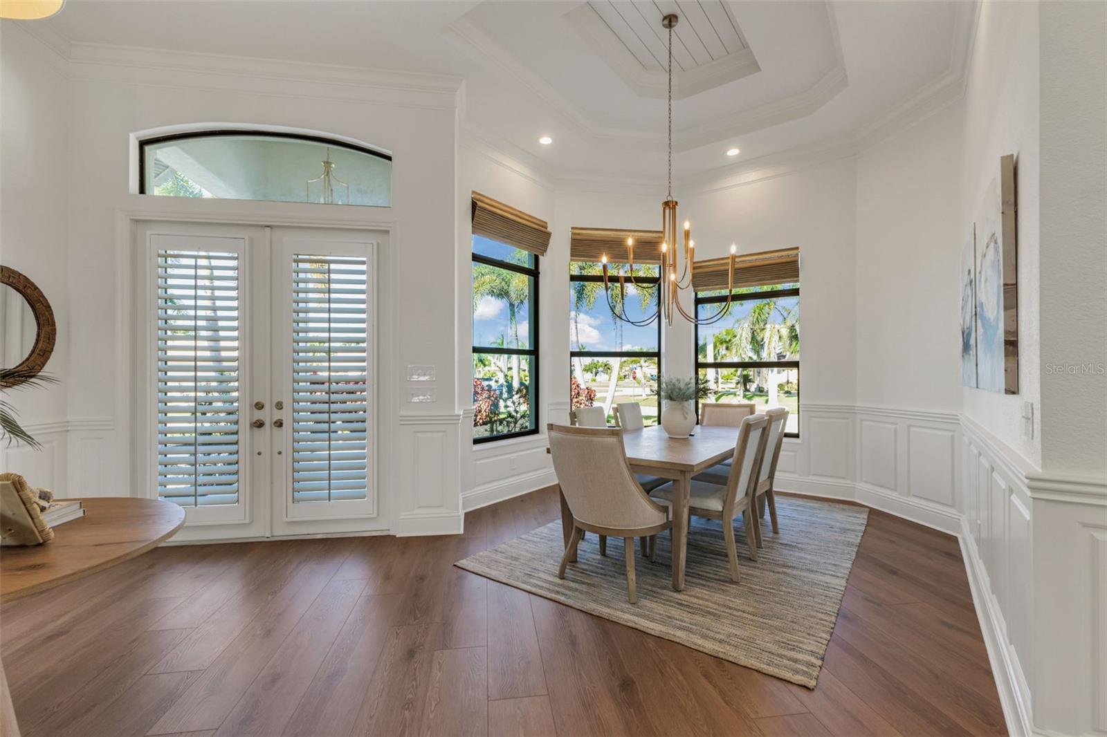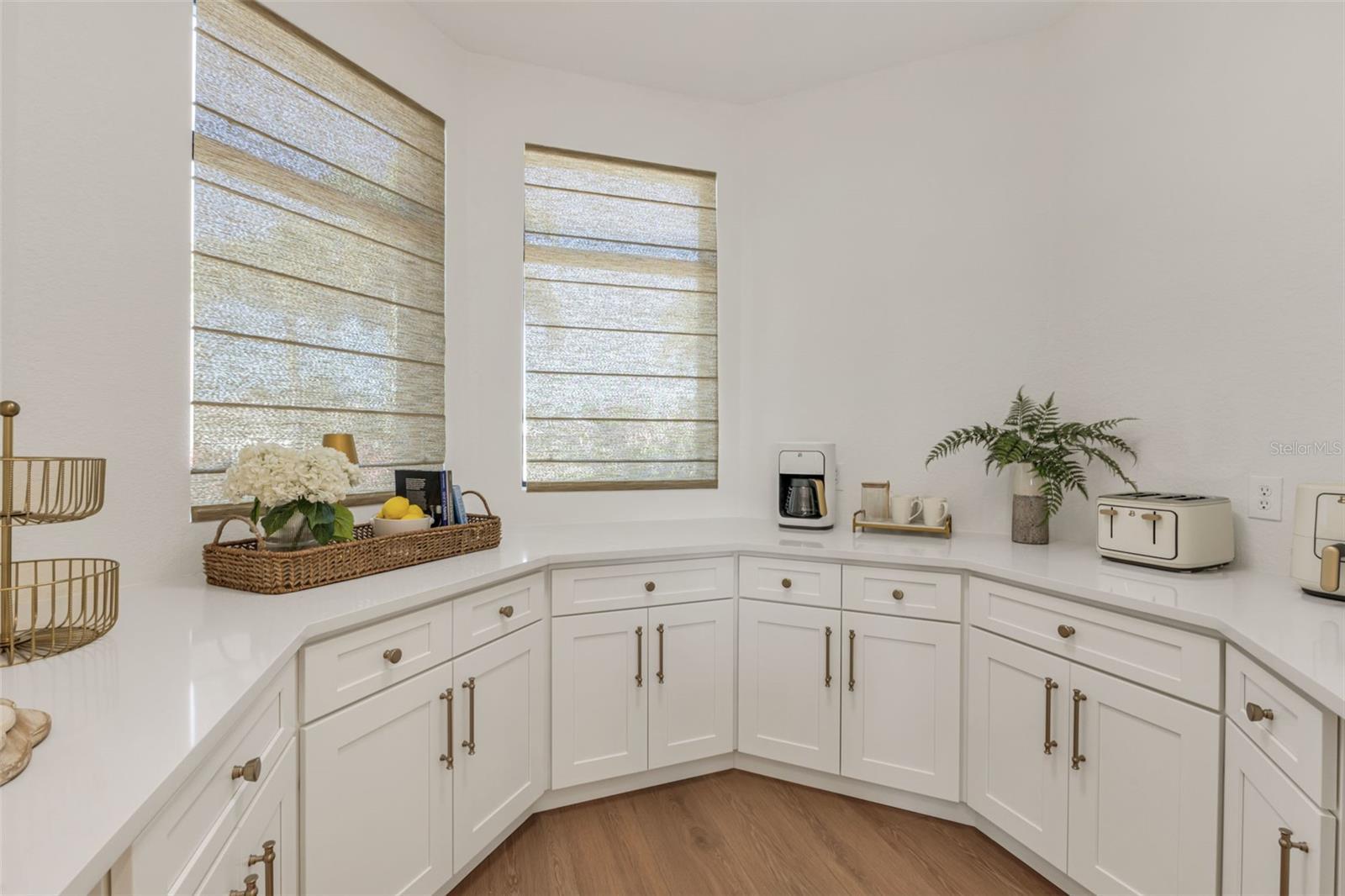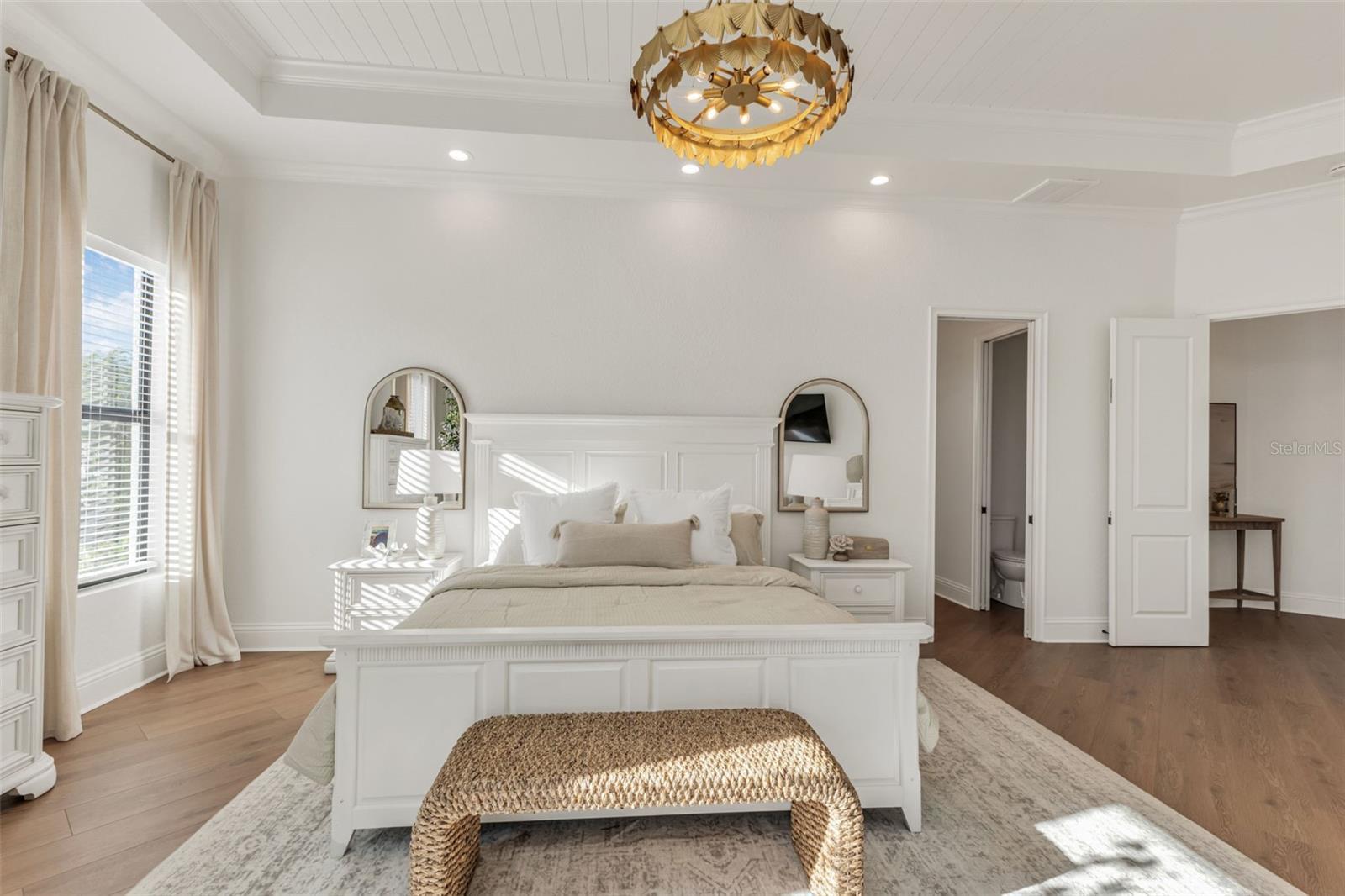 - Ceiling Fans(s), Coffered Ceiling(s), Crown Molding, Eat-in Kitchen, High Ceilings, Kitchen/Family Room Combo, Living Room/Dining Room Combo, Open Floorplan, Primary Bedroom Main Floor, Solid Surface Counters, Solid Wood Cabinets, Thermostat, Walk-In Closet(s), Wet Bar, Window Treatments