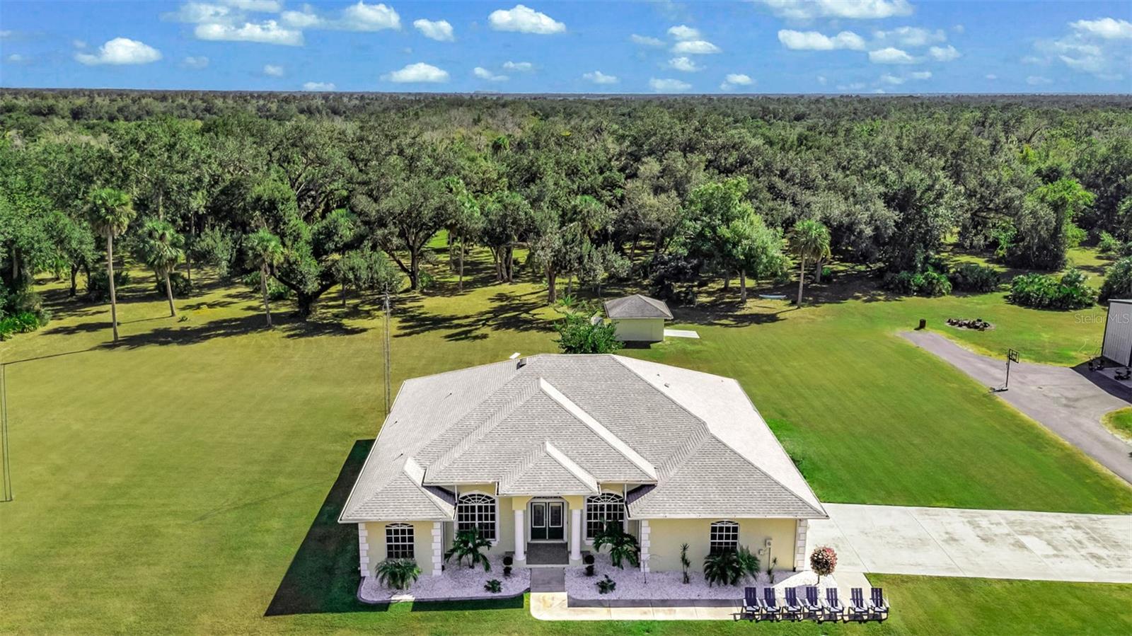 Dreaming of wide-open land and natural privacy, and a home that balances comfort with freedom — this is it. This rare find boasts 2800 sqft of living space and is surrounded by lush palms, mature fruit trees, mature greenery, and the absolute best land Florida has to offer (with no HOA). This estate delivers a rare blend of tranquility and practicality, with over 13 acres of Non-Flood-Zone land, where you can enjoy a deep artesian well with high quality water that feeds a stocked fishpond. Whether you envision relaxing by the water, enjoying recreational fishing, or enhancing the private estate atmosphere, these natural elements create a rare and inviting environment. The estate has a NEW ROOF & HVAC, along with an RV Hook-up and a Steel frame 3,200 sqft warehouse, built to last and perfect for equipment storage, workshop use, or future customization to fit your needs This beautiful home is set apart from others because of its location and low maintenance land with a long personal paved road that leads almost the whole distance of the property. Expertly designed to endure all of mother nature’s tests feel at ease with well thought out homestead design, a true private family compound that captures the best of quiet country living while keeping you close to major amenities and coastal destinations with easy access to I-75. This solidly built home offers a well-designed open, split bedroom floor plan, providing comfort and privacy for all. Throughout the home, you’ll find ceramic tile flooring, elegant crown molding, and high ceilings that enhance the bright, spacious feel. This exceptional property is truly a must-see, offering quality features and thoughtful design that set it apart from the rest. Schedule your showing TODAY!