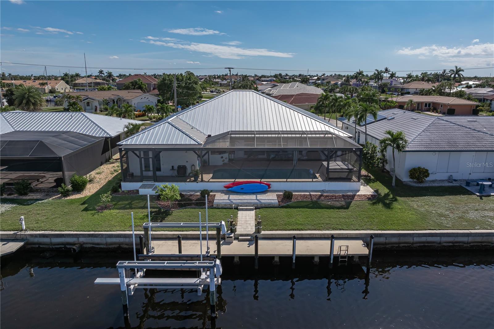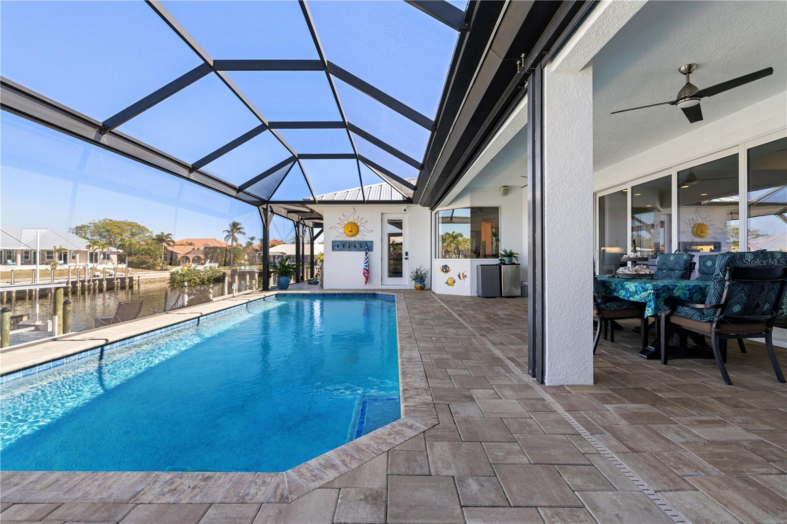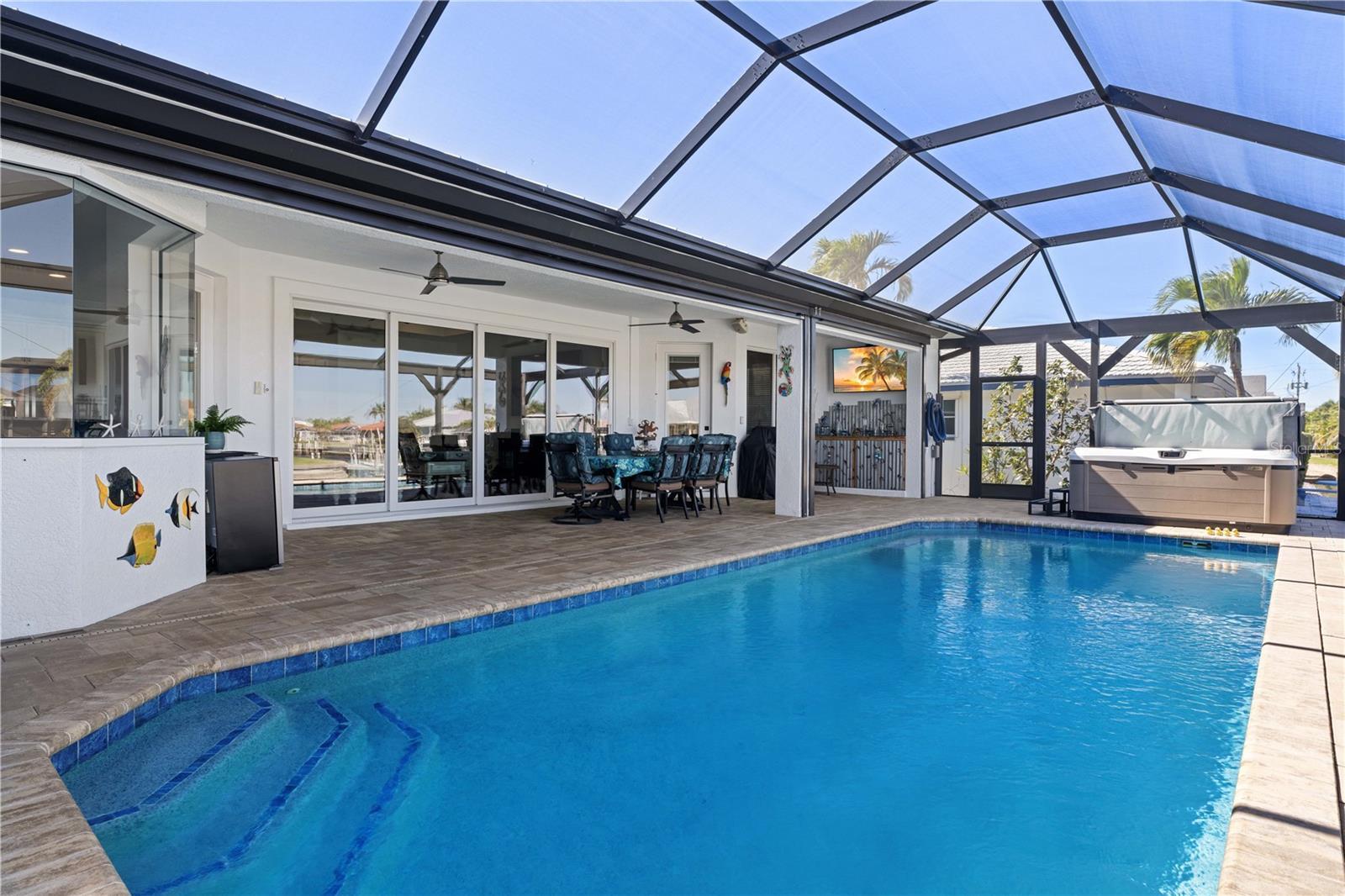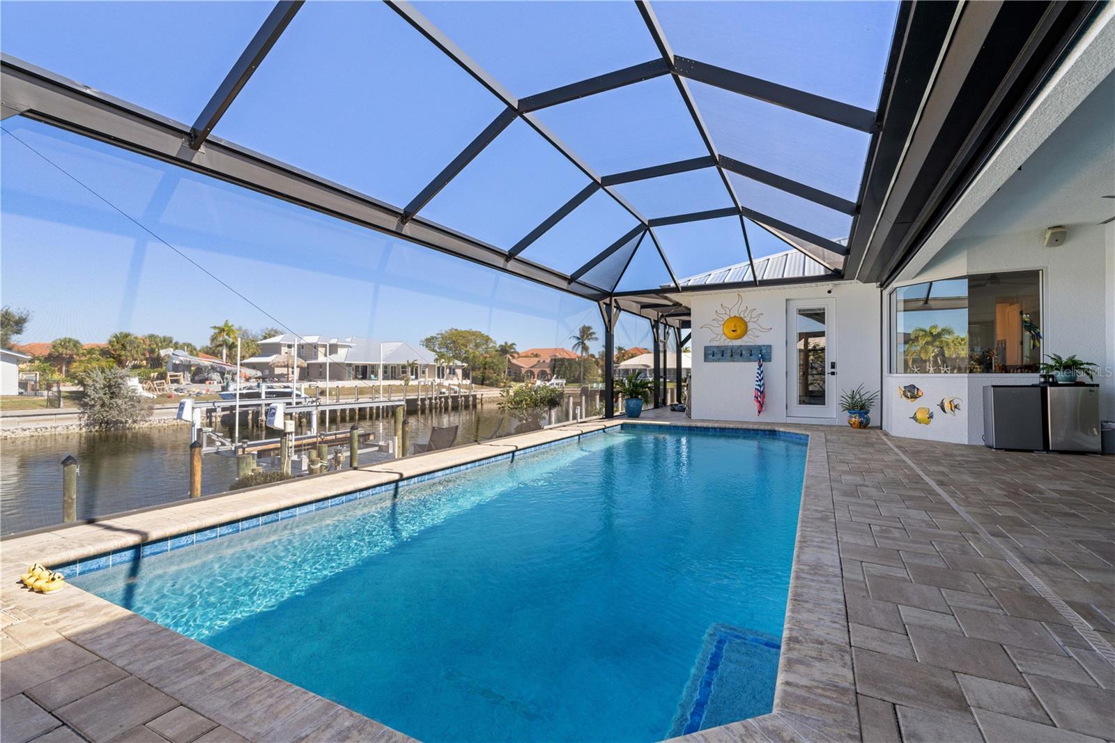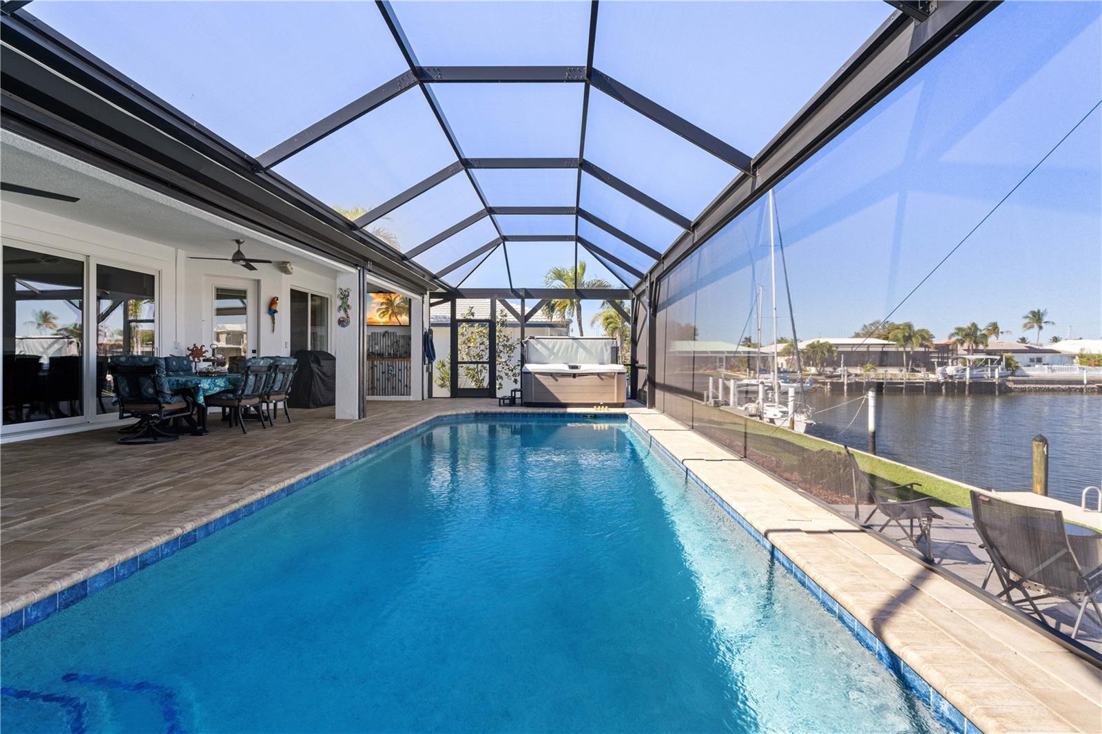 SPECTACULAR WATERFRONT HOME IN PGI W/QUICK SAIL ACCESS - Located in the original sailboat section of Punta Gorda Isles, this exceptional 3 BED/3 BATH + OFFICE, waterfront home combines modern Florida design w/superior Towles Construction craftsmanship. The property boasts 80ft of seawall with a 45ft concrete dock & 16,000lb lift. Enjoy direct, deep water, sailboat access to Charlotte Harbor where you can reach open water in minutes from your backyard. Inside, 2,655 sq ft of elegant living space showcases high tray ceilings, luxury vinyl flooring throughout, & a split-bedroom layout designed for privacy. Sliding glass doors open from the great room to the lanai extending the living space outside, filling the home w/ natural light & offering up wonderful canal views. The kitchen is the heart of the home w/stainless steel appliances, built-in double oven w/air fryer, 36" induction cook top, soft-close cabinetry w/pull-outs, granite counters, & a wraparound island w/breakfast bar seating that is ideal for entertaining. The adjacent dining area features a mitered bay window for an unobstructed pool & canal view. The interior laundry room features a 6-ft pantry for additional kitchen storage. Master suite offers private access to the lanai, two large walk-in closets, & a spa-inspired bath w/split vanities & a dual-entry, tiled shower w/two rainfall heads. Split bedroom layout boasts large guest rooms. One guest room features walk-out access to the lanai & an en-suite bath that doubles as a pool bath. A large office is located off the foyer adding functional flexibility for working from home. The office could also be used as a craft/hobby room, home gym or even a 4th bedroom, if needed. With almost every room in the home opening to the lanai, outdoor living takes center stage. The brick paver lanai features a clear view pool cage surrounding an in-ground, heated, saltwater pool. The large seating area is anchored by a summer kitchen. The covered area of the lanai is protected by electric, roll-down Kevlar hurricane screens for peace of mind. A Bullfrog hot tub is perched at the corner of the lanai overlooking the wide canal. Step beyond the screen enclosure to your 45ft concrete dock w/16,000 lb lift where you can keep your boat docked at your backdoor. Dock has kayak rollers for easy launches. Superior craftsmanship is evident in the wood-look luxury vinyl flooring, the solid core doors w/contemporary handles, the dimmable LED lighting & the modern ceiling fans. Other amenities include whole-house water softener, impact-resistant doors & windows, Manabloc plumbing system, in-ground sprinklers, wired security cameras & increased energy efficiency thanks to foam insulation throughout attic (including over lanai & garage). The oversized 3-car garage offers abundant storage for vehicles & gear. The curb appeal of the home is enhanced by tropical landscaping & a circular paver driveway. Enjoy the active Punta Gorda lifestyle where miles of sidewalks connect you to Ponce Park, Fishermen’s Village, the Harborwalk, & historic downtown. While there's no HOA, the Punta Gorda Isles Civic Association (PGICA) offers access to a wide range of social clubs, boating groups, & community activities. The only requirement to joining is ownership or residency in Punta Gorda Isles. Here, every day feels like a vacation. Bring your boat, your flip-flops, & your love of the water: start living your Punta Gorda dream today.