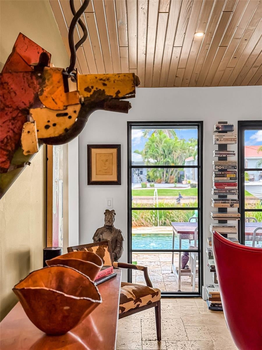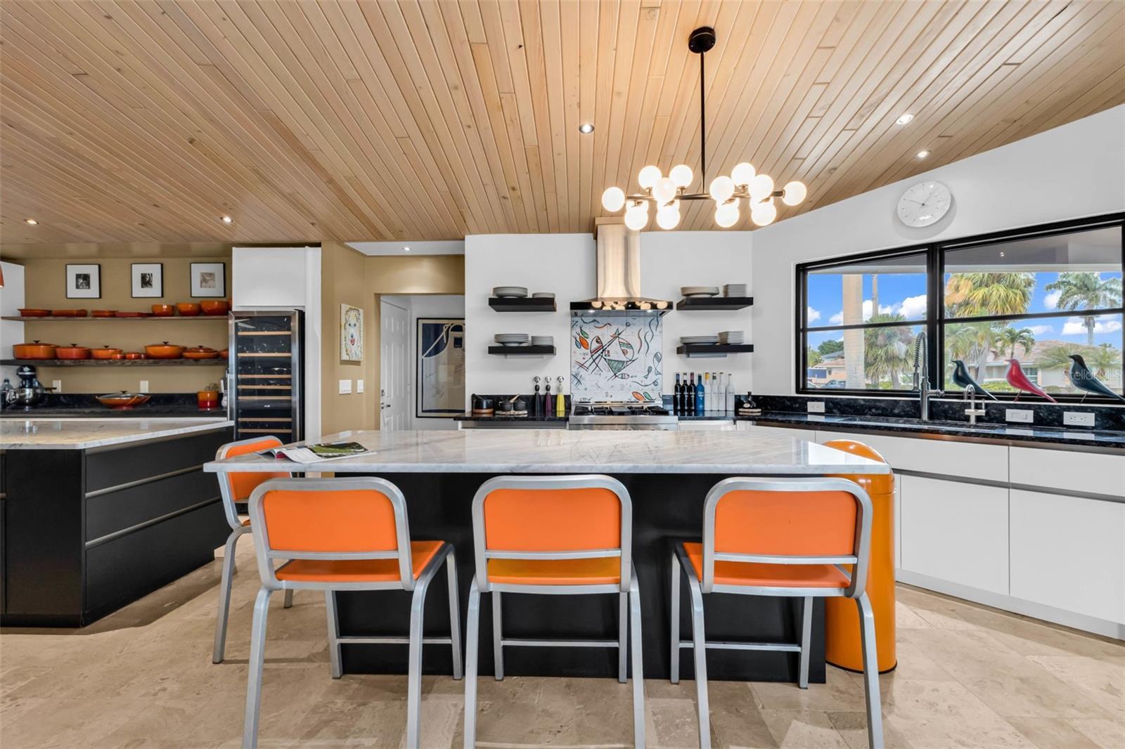 Mid Century Modern style meets 21st Century practicality. Modern Coastal Elegance with Unmatched Structural Integrity Completely reimagined from the slab up in 2023/2024, this 3-bedroom, 2-bath home offers 2,675 square feet of luxury living with a focus on strength, sophistication, and seamless indoor-outdoor living. Walk up the cream travertine front steps, to the spacious front porch. Step through one of the two custom steel HURRICANE IMPACT PIVOT DOORS into a stunning interior featuring vaulted cypress ceilings and French-pattern cream travertine MARBLE flooring throughout. Entertain effortlessly in the CHEF'S KITCHEN with JennAir, Bosch, and Fisher Paykel appliances featuring 2 dishwashers, gas range, double electric wall ovens, warming drawer, wine fridge, TWO EXPANSIVE ISLANDS topped with Carrera marble and Brazilian granite, a striking Picasso-inspired tile backsplash, WALNUT LIVE-EDGE SHELVING, and Picasso inspired wall paper above THE COFFEE BAR adds a bespoke touch. A hidden pantry with a second Bosch refrigerator, and custom cabinetry is tucked behind the kitchen, through a restaurant-inspired swinging door. Custom lighting fixtures abound throughout the home, many are vintage, from Herman Miller. The MCM open-concept design extends to an 1800 sq. ft., SPECTACULAR LANAI, tan travertine marble pavers, gas hookup ready for a future outdoor kitchen and plenty of shady and sunny seating areas. Overlooking the lanai is a 50 ’ saltwater lap pool with decorative jets, new JANDY pump (2024), and electric heater with new control panel (2024), New LED color changing underwater lights; all controllable from your phone with the Aqua Link App. Built atop a 4-course stem wall at 9.6' elevation, this residence boasts unparalleled structural integrity with a standing seam metal roof (2024) tied to the foundation via threaded steel rods every 18 inches. Built for resilience and comfort, the home includes: Whole-house 24KW GENERAC GENERATOR (auto switchover) powered by an in-ground 250- gallon LP tank, Hardie Board cement siding and hurricane-impact windows and doors, Two AC units (2023 & 2024) each with a Remy-Halo UV filtration system, and TWO on-demand hot water heaters (electric 2023, LP gas 2024), HALO whole-house water filtration system which will function carefree until 2033, Advanced security system with cameras, audio, and DVD backup Retreat to the luxurious primary suite with a Kohler rain shower, Kohler handheld shower, custom tile work, an infrared sauna (NEGOTIABLE) and expansive custom cabinetry with his and hers walk-in closets. Guest bedrooms and bathroom feature equally high-end finishes and CUSTOM Built-in storage. Guest bath has edgeless glass door, Kohler rain shower, a private water closet, and a large CUSTOM linen closet. Outdoors, enjoy the professionally landscaped backyard (fully fenced) maintained by Beautiful Boundaries. Boaters will appreciate the 30 ’ dock with 30,000 lb boat lift and all-new 2024 electrical. The 32x22 garage includes epoxy flooring, waterproofed walls, overhead storage, a workshop bay, separate man-door, and a hurricane-rated, custom Clopay door. Truly move-in ready, this meticulously designed home delivers peace of mind, exceptional taste, and every modern convenience. Schedule your private showing today.