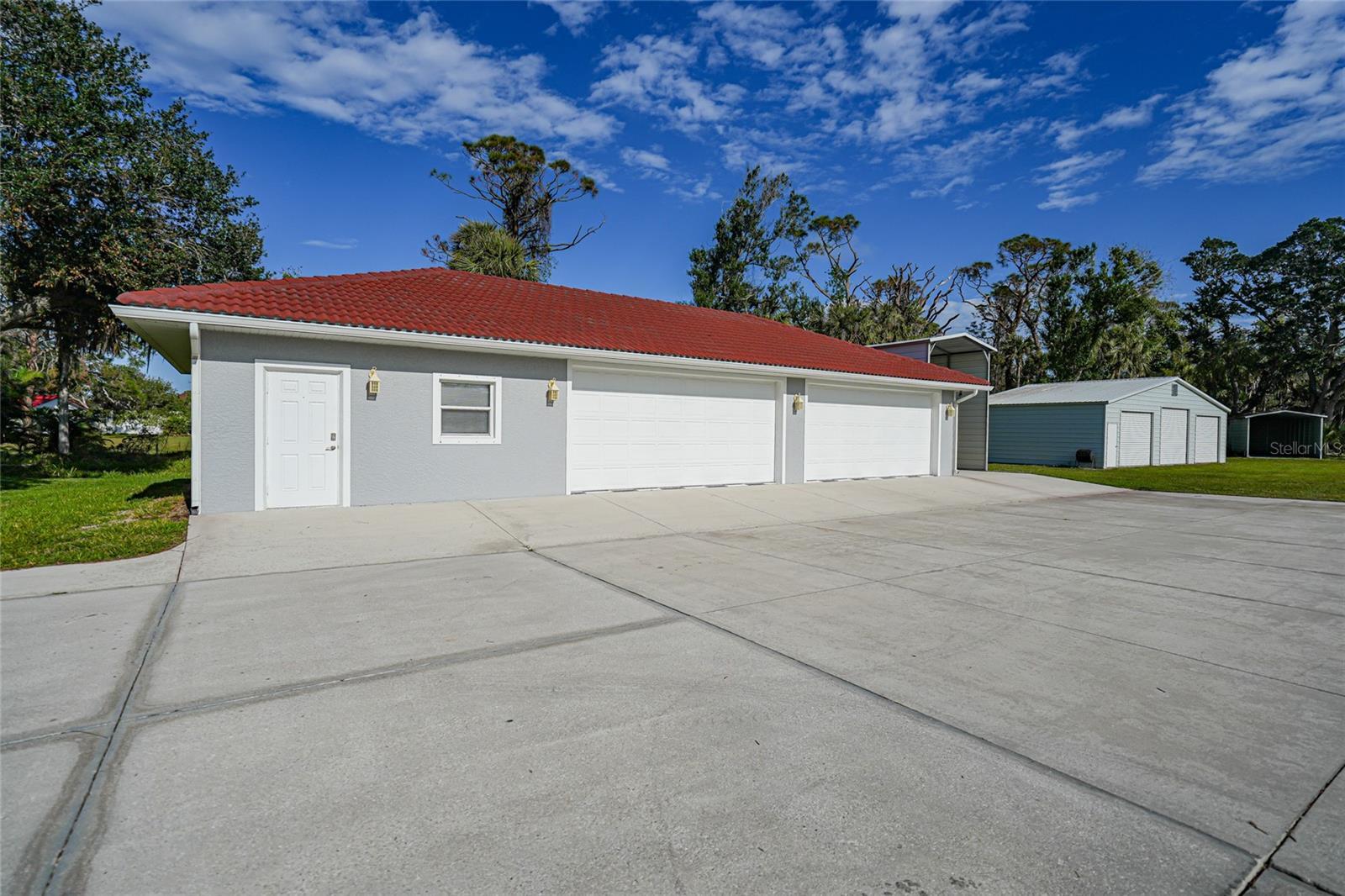 Discover your own slice of paradise with this unique 3.3-acre park-like estate, one mile from beautiful Manasota Beach and a public boat ramp. Boasting over 4,500 square feet of living space, this home embraces natural surroundings, providing a welcoming retreat and serene lifestyle. A charming white gate, adorned with globe lighting, welcomes you to the property. Upon entry, a tile-roof gazebo in the front yard evokes a sense of nostalgia beneath mature oaks, while a lighted and fenced double pickleball court (converted tennis court) offers the perfect outlet for sports enthusiasts. The wide driveway stretches to the back of the home, with a circular section providing easy, sheltered access to the entryway beneath the lattice carport. A screened-in L-shaped wraparound porch offers an ideal spot to relax and enjoy the Florida breeze. Accessible from both the front porch and the yard, the pool and hot tub are surrounded by a spacious pavered deck and screened pool cage. A built-in pet door leads to the exterior fenced dog run, giving pets the freedom to go outside on their own. The kitchen features a large island, solid surface countertops, wood cabinetry, breakfast bar, stainless appliances, stylish chimney hood, walk-in pantry, built-in desk, and decorative lighting. There is also room for a dining table, making it perfect for family gatherings. An archway opens to an additional dinette area, creating a seamless flow for entertaining. With floor-to-ceiling windows in both the dining and living rooms, abundant natural light fills the space. The living room's wood-burning fireplace adds a cozy touch on cooler Florida nights. The home features 4 bedrooms, a separate office/den that can serve as a 5th bedroom, and 4 1/2 baths, with the possibility of 3 master suites for unmatched comfort and privacy. Upstairs, the primary suite spans a generous 1,000 square feet with French doors leading to an expansive outdoor deck, and a spa-inspired bathroom featuring a jetted tub, rainfall shower, dual sinks, separate vanity. Two additional bedrooms are also located on the second floor, sharing a hallway bath with a large closet, walk-in shower, and double sinks. The remaining two rooms are downstairs, each with its own en-suite bathroom. The downstairs laundry room, designed for convenience, features custom built-in cabinets, shelves, and a storage closet. A laundry chute runs from beneath the upstairs bathroom sink cabinet to a laundry room cabinet, where clothes are gathered until wash day. A half bath is located in the hallway just outside the laundry room. The lower level family room will be one of the most frequently used spaces in the home, and features an exterior door leading to the double carport. Outdoors, you will find a total of 9 garage bays and 3 carports offering abundant parking for everything. The closest building is currently used as a game room and also includes a solid concrete safe room and full bath (making the property total 5 1/2 baths). The second building has a 2-car garage, 2 storage rooms, and a room ideal for a home gym with a mirror wall. There are 6 RV plugs on the property (four 30-amp and two 50-amp). There’s also a 3-bay garage with electric roll-up doors and 3 more open metal buildings. Some noteworthy features include public water and sewer, along with a well and pump system for exterior needs. The modified low-slope roof was replaced in 2020. This estate is a true sanctuary. Virtual tour and video are available.