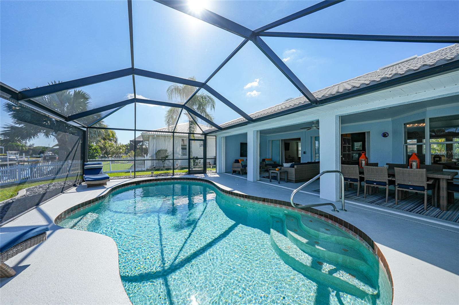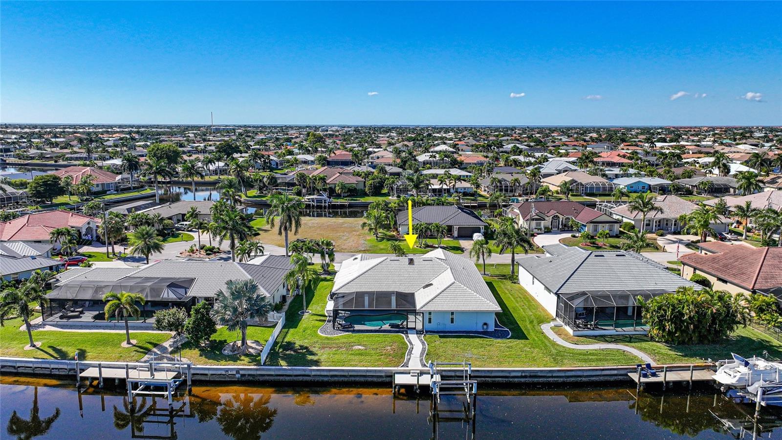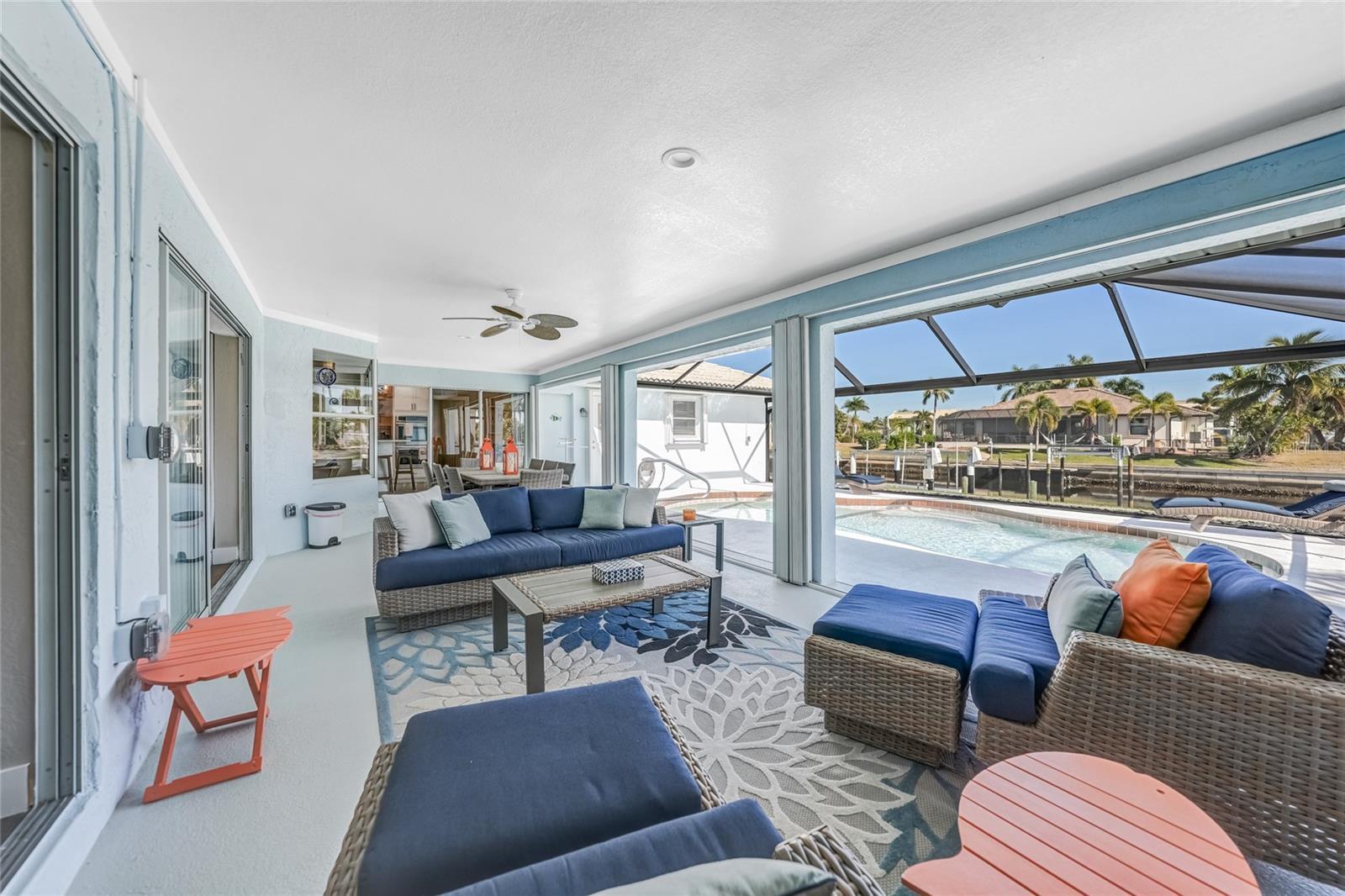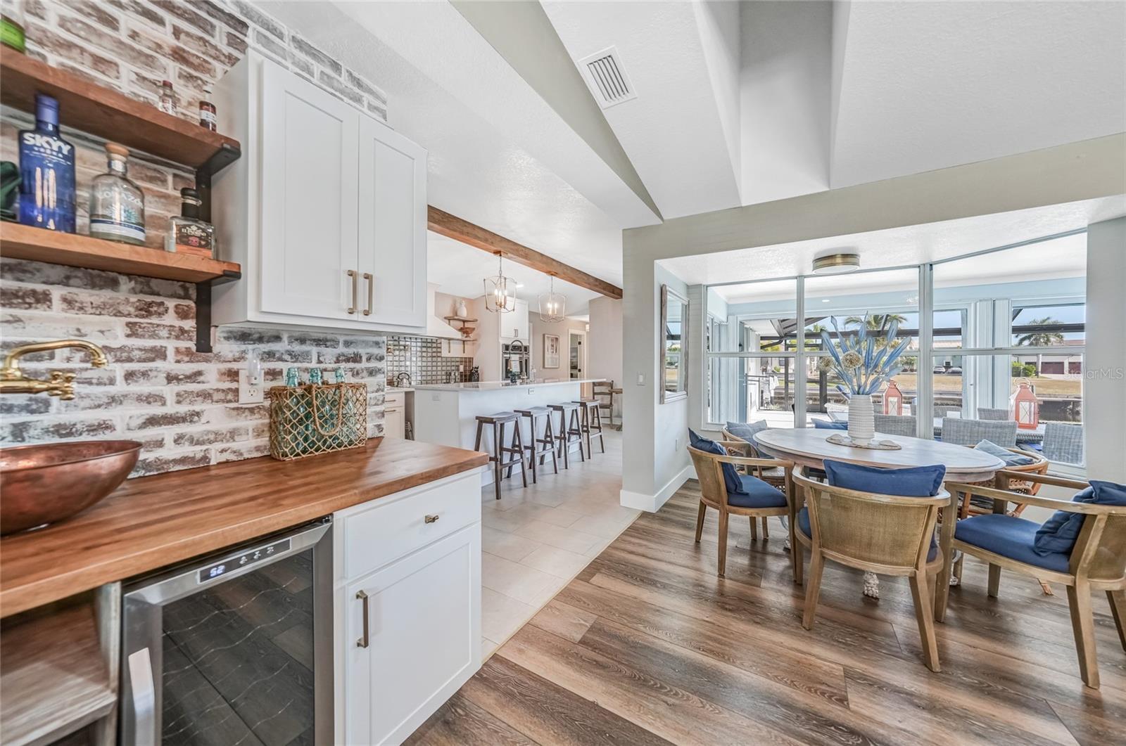 Beautifully remodeled and fully furnished waterfront home in Punta Gorda Isles, featuring 4 bedrooms, 3 full baths, and a HEATED POOL. Enjoy direct GULF ACCESS from your oversized 100-FOOT CITY MAINTAINED CONCRETE SEAWALL equipped with a 7,000-lb boat lift. This 2,371 sq. ft. residence showcases stylish updates throughout, including BEAMED CEILINGS and a STONE-wrapped electric FIREPLACE. The stamped-concrete circular driveway and two-car garage enhance the home’s welcoming curb appeal. The split floor plan provides both privacy and functionality for families or guests. Primary Suite: Located on its own wing of the home, the spacious primary suite features a king-sized bed, a cozy seating area, and pocketing sliders that open directly to the pool area. The large ensuite bath includes a walk-in closet, walk-in shower, soaking tub, double sinks, and a dedicated vanity space. Secondary Suite: The main guest bedroom—large enough to serve as a second primary—offers a king-sized bed, walk-in closet, and a private bath with a walk-in shower. Additional Bedrooms: Two more guest bedrooms are situated on the opposite side of the home. One includes two twin beds, and the other offers a queen. A full guest bath with tub/shower combo also functions as a convenient pool bath with direct lanai access. This home is designed for entertaining, with a spacious great room featuring bamboo flooring, built-in shelving, an electric fireplace for ambiance, and pocketing sliders that seamlessly blend indoor and outdoor living. The dining area’s bay windows provide lovely views of the pool and canal. Kitchen: A chef’s dream—with a large QUARTZ ISLAND offering ample seating, SOFT CLOSE wood cabinetry, stainless steel appliances, DUAL BUILT IN OVENS a microwave, glass cooktop with vented hood, POT FILLER, and decorative glass backsplash. A generous WALK IN PANTRY is just steps away. Adjacent to the kitchen is a dedicated COFFEE/BEVERAGE BAR complete with COPPER SINK and built-in WINE REFRIGERATOR—perfect for serving guests. A well-appointed laundry room offers a washer and dryer, utility sink, and built-in ironing station. Recent Upgrades: • A/C units (2024) • New lanai screen (2023) • Pool heat pump (2022), Pool Pump (2025) • Re-plumbing (2022) Hurricane-rated windows and accordion shutters on the lanai provide added peace of mind. This home is also conveniently located within close proximity to famous Fishermen’s Village, the new Sunseeker Resort, major highways and airports, and just a few minutes to downtown Punta Gorda, where you can enjoy its unique restaurants, shopping, pickle ball, biking, and waterfront activities.