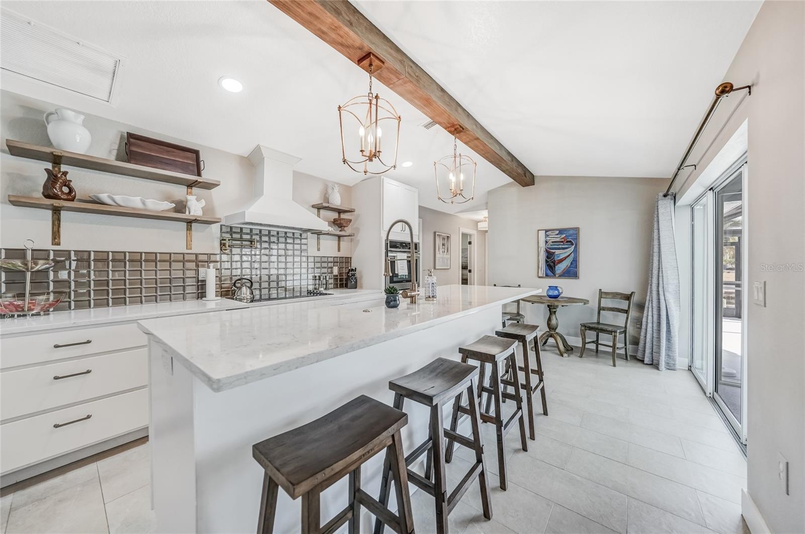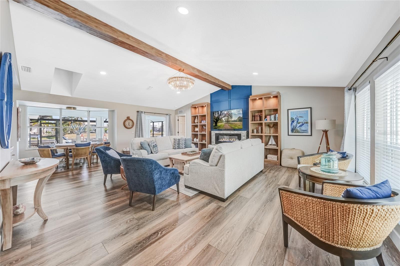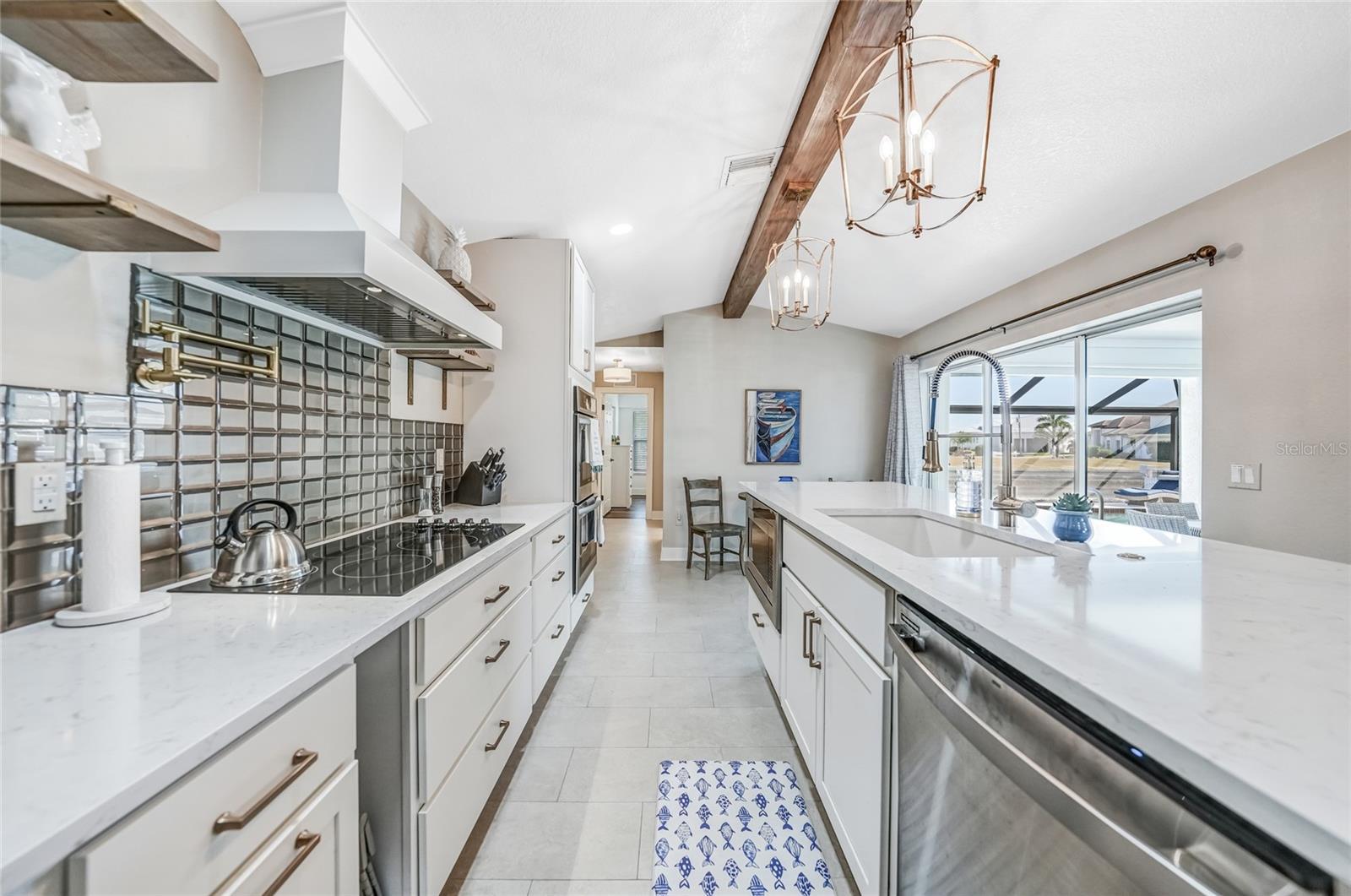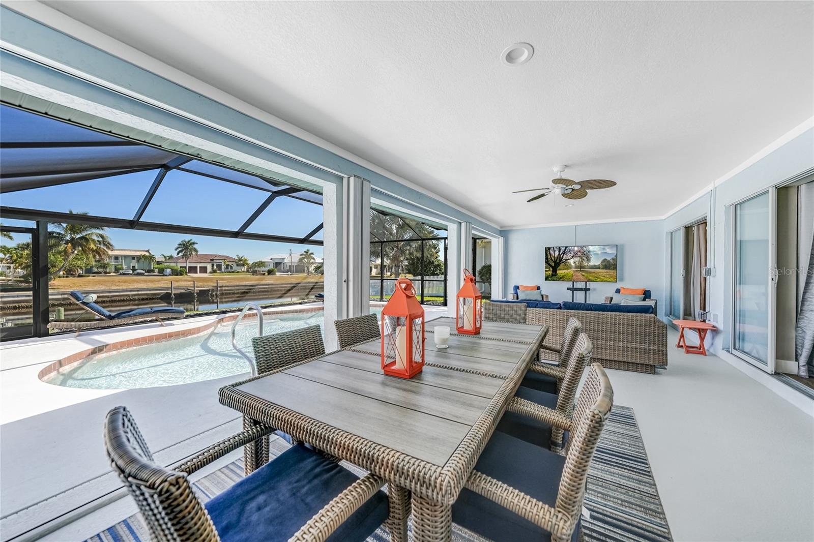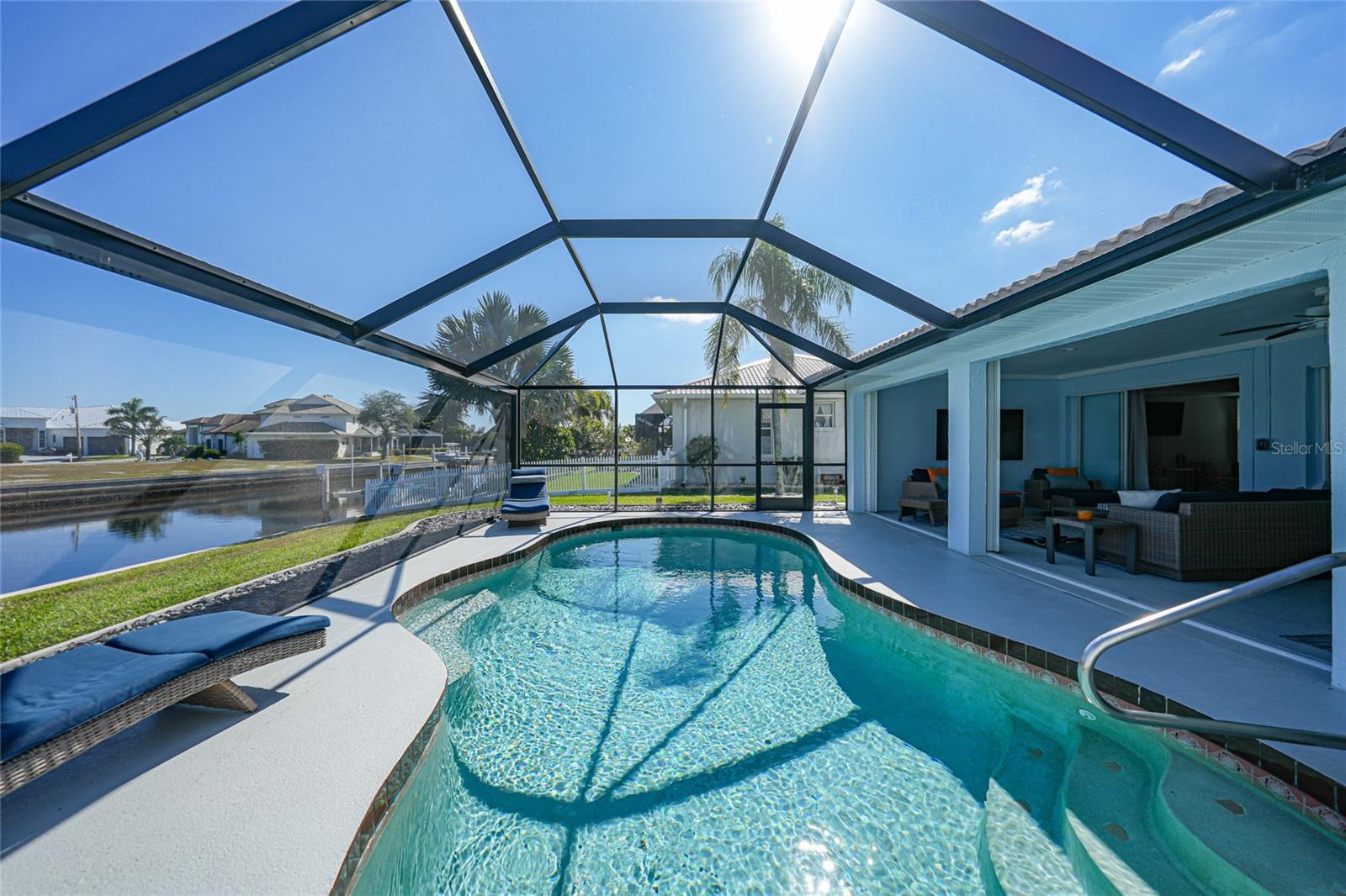 Beautifully remodeled and fully furnished waterfront home in Punta Gorda Isles, featuring 4 bedrooms, 3 full baths, and a HEATED POOL. Enjoy direct GULF ACCESS from your oversized 100-FOOT CITY MAINTAINED CONCRETE SEAWALL equipped with a 7,000-lb boat lift. This 2,371 sq. ft. residence showcases stylish updates throughout, including BEAMED CEILINGS and a STONE-wrapped electric FIREPLACE. The stamped-concrete circular driveway and two-car garage enhance the home’s welcoming curb appeal. The split floor plan provides both privacy and functionality for families or guests. Primary Suite: Located on its own wing of the home, the spacious primary suite features a king-sized bed, a cozy seating area, and pocketing sliders that open directly to the pool area. The large ensuite bath includes a walk-in closet, walk-in shower, soaking tub, double sinks, and a dedicated vanity space. Secondary Suite: The main guest bedroom—large enough to serve as a second primary—offers a king-sized bed, walk-in closet, and a private bath with a walk-in shower. Additional Bedrooms: Two more guest bedrooms are situated on the opposite side of the home. One includes two twin beds, and the other offers a queen. A full guest bath with tub/shower combo also functions as a convenient pool bath with direct lanai access. This home is designed for entertaining, with a spacious great room featuring bamboo flooring, built-in shelving, an electric fireplace for ambiance, and pocketing sliders that seamlessly blend indoor and outdoor living. The dining area’s bay windows provide lovely views of the pool and canal. Kitchen: A chef’s dream—with a large QUARTZ ISLAND offering ample seating, SOFT CLOSE wood cabinetry, stainless steel appliances, DUAL BUILT IN OVENS a microwave, glass cooktop with vented hood, POT FILLER, and decorative glass backsplash. A generous WALK IN PANTRY is just steps away. Adjacent to the kitchen is a dedicated COFFEE/BEVERAGE BAR complete with COPPER SINK and built-in WINE REFRIGERATOR—perfect for serving guests. A well-appointed laundry room offers a washer and dryer, utility sink, and built-in ironing station. Recent Upgrades: • A/C units (2024) • New lanai screen (2023) • Pool heat pump (2022), Pool Pump (2025) • Re-plumbing (2022) Hurricane-rated windows and accordion shutters on the lanai provide added peace of mind. This home is also conveniently located within close proximity to famous Fishermen’s Village, the new Sunseeker Resort, major highways and airports, and just a few minutes to downtown Punta Gorda, where you can enjoy its unique restaurants, shopping, pickle ball, biking, and waterfront activities.
