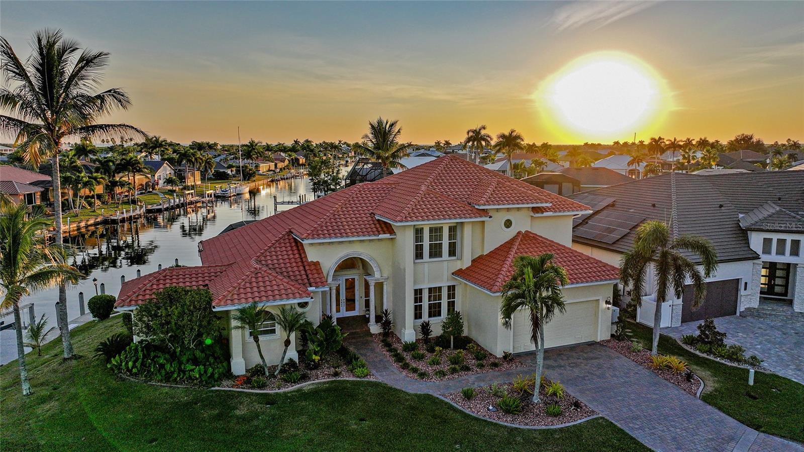 Welcome to the pinnacle of Punta Gorda Isles waterfront luxury—a breathtaking 4 bedroom, 3 bathroom, 2 half-bath residence with a den, perfectly positioned on an exceptional south-facing tip lot offering 173 feet of city-maintained concrete seawall and unparalleled panoramic water views. Designed for the discerning homeowner who expects the extraordinary, this estate delivers elite craftsmanship, sophisticated amenities, and world-class boating right in your backyard. Step inside and be immediately captivated by the grand, airy layout where refined finishes and thoughtful architectural lines guide you toward the heart of the home. A 500-bottle, temperature-controlled wine room—with refrigeration fully independent from the rest of the home—anchors the residence in true luxury and sets the stage for elevated living and entertaining. The great room unfolds through zero-corner sliding glass doors, erasing the boundary between indoors and outdoors and revealing an expansive, resort-style lanai. Outside, a travertine pool deck surrounds a stunning PebbleTec saltwater pool, complete with a solar-powered pump and heater, built-in grill, and a dedicated half pool bath for convenience. Whether hosting sunset gatherings or enjoying peaceful mornings by the water, this outdoor oasis is designed for ultimate relaxation. For boating enthusiasts, this property is simply unmatched. Enjoy two private boat lifts—including a 55,000 lb catamaran lift and a 10,000 lb lift—positioned along the wide canal with immediate, unobstructed deep-water access to Charlotte Harbor and the Gulf. Wide turning basins, expansive waterfront views, and a quiet corner location elevate this residence to a class of its own. Peace of mind meets modern resilience with a new roof, accordion shutters, storm covers, and a 26 kW Generac Whole House Generator connected to a 250-gallon buried propane tank. A rare air-conditioned outdoor storage room adds practicality without compromising luxury. Inside, each bedroom is generously sized, beautifully appointed, and designed with comfort in mind. The den offers flexibility for a private office, library, or quiet retreat. Every space flows effortlessly, showcasing the home’s elegant transitions, natural light, and attention to detail. This is more than a residence—it is a lifestyle. A luxurious, meticulously maintained waterfront sanctuary offering unmatched boating, lavish amenities, and the coveted PGI location you’ve been waiting for.