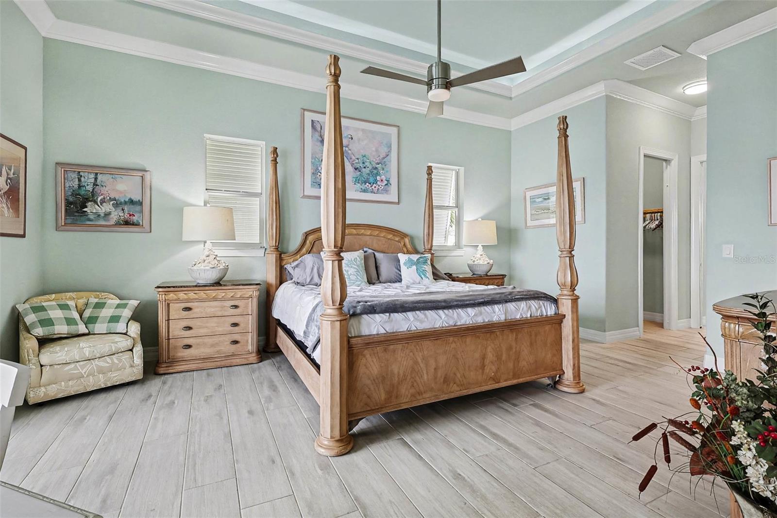 - Built-in Features, Ceiling Fans(s), Coffered Ceiling(s), Crown Molding, High Ceilings, Kitchen/Family Room Combo, Primary Bedroom Main Floor, Split Bedroom, Thermostat, Tray Ceiling(s), Walk-In Closet(s), Wet Bar
