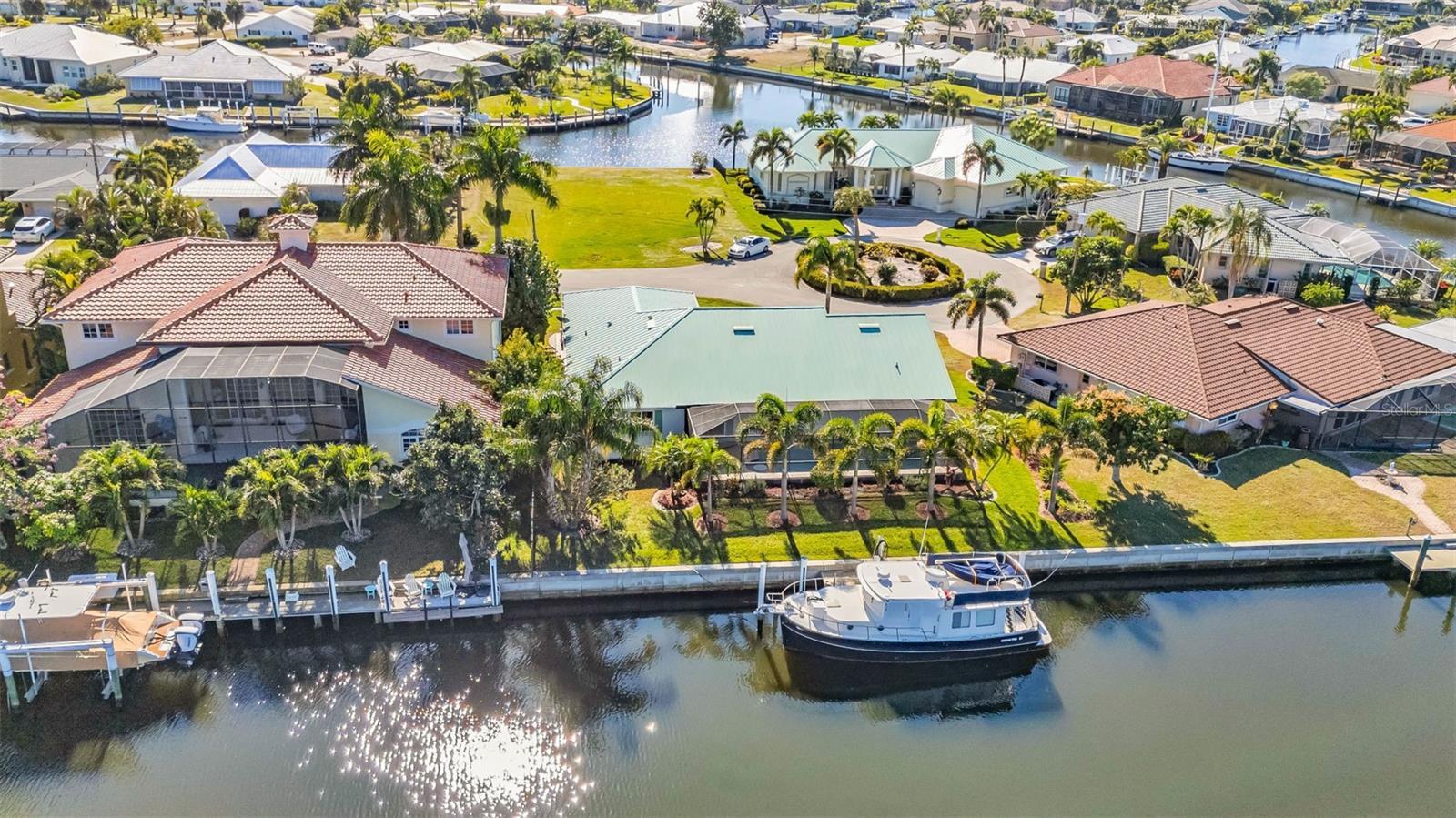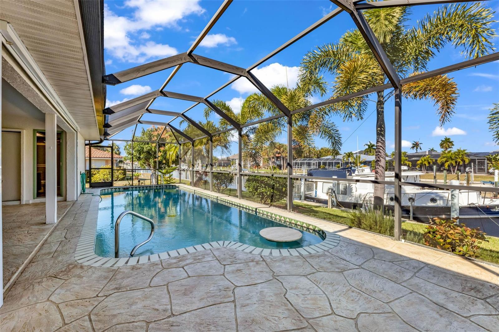 360 TOUR: Turnkey, furnished Sailboat-access, 5 minutes to open water, Waterfront home with in-ground pool! Well maintained and updated 3BD/3BA/2CG higher-elevation 9'.9" home with 90 feet of deep-water canal frontage that offers a five-minute, unobstructed water access to Charlotte Harbor; free of bridges all the way to the Gulf for any size boat! Open split bedroom floor plan with beamed cathedral ceilings in great room, dining, and kitchen areas. Other rooms have custom crown molding at the ceiling. Kitchen features updated appliances, modern backsplash and granite counters, plus abundant cabinetry including a full wall of pantry cupboards. Florida style tile throughout the main living area, carpet in two guest rooms, guest bath features a jetted tub, updated fixtures, vanity and granite counters. The 3rd full bath is adjacent to the pool. Private, Primary bed and bath features lanai access, a custom walk-in closet, and a spa-like large bath with dual granite vanities. The entire Primary en-suite was completely renovated in 2022. Laundry room features w/d, work sink, cabinets, closet plus granite counters. Updated Plantation Shutters (2020), ceiling fans and light fixtures throughout the house. Garage has epoxy floors (2021), A/C (2023), workbench, cabinets, and some tools. Outdoor living spaces include a heated in-pool seating, in-ground pool (heater 2023 and new pump 2024), surrounded by no-see-um screening lanai, with an eating area and easy access to the pool bath, which includes a full-sized shower. Lush tropical landscaping is maintained effortlessly with a (2023) Rain Bird irrigation system. Boater features: both 50 amp and 110 power, plus city water on a 7’x24’ concrete dock, completely re-engineered in 2017-2018, along with the 90 feet of concrete seawall. There are 6 pilings and a Slidemoor docking system that can secure up to a 38-ton boat. Major improvements include: metal ROOF (2022), soffits and gutters (2022), impact resistant to 160mph WINDOWS (2020) through-out, a motorized Kevlar StormSmart screen (2020) that protects lanai adjacent to house and all three sliding doors, plus a new A/C (2023) unit on west side of house. Close to Fisherman’s Village, Isles Yacht Club, Golf, waterfront dining, Sunseeker resort, parks (including dog parks), piers and historic downtown Punta Gorda. Ideal for year-round living, seasonal stays, or immediate boating and fishing enjoyment in a quiet neighborhood! Home Info Sheet & Updates/Improvement Sheet ATTACHED.