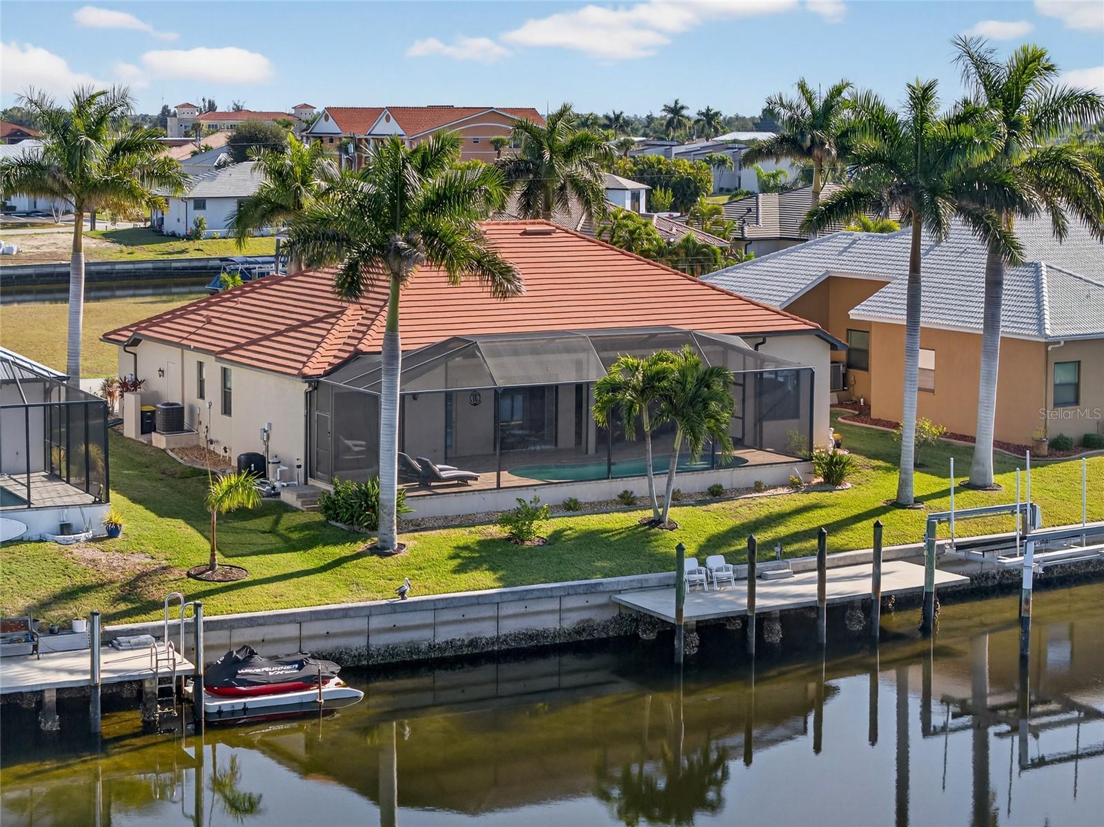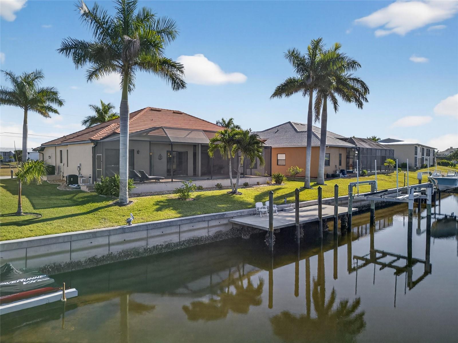 Under contract-accepting backup offers. PUNTA GORDA ISLES!! BEAUTIFUL 3 BEDROOM PLUS DEN, 2 BATH, 3 CAR GARAGE, WATERFRONT POOL HOME BUILT BY PRESTIGIOUS PGI HOMES. 84 FEET OF WATERFRONTAGE ON CANAL VIEW WITH POWERBOAT ACCESS MINUTES TO CHARLOTTE HARBOR LEADING TO THE GULF! Beautiful curb appeal with mature and lush exterior landscaping. Step inside through double door entry where you will find an open floor plan with zero corner sliders to screened lanai with beautiful water views, coffered ceilings, crown molding, and tile floors in main living and dining. Gourmet kitchen offers white cabinetry, granite countertops, tile backsplash, induction cooktop, large island and breakfast bar great for entertaining. Spacious primary suite showcases tray ceilings, direct access to lanai, sitting area, his and hers walk-in closets and private en-suite bath featuring dual vanities, Roman shower, and private water closet. Two nicely sized secondary guest bedrooms sharing a well-appointed guest bath that also serves as a convenient pool bath. Step outside to your personal paradise offering a covered and screened lanai with a saltwater heated pool enclosed by a panoramic screen that maximizes the stunning canal views. Beyond the lanai, a 33-foot concrete dock awaits, equipped with a 10,000 lb boat lift with new motors (2024), along with water and electric—perfect for boating enthusiasts. Additional features include reinforced roof with added insulation, retractable screen for 3rd garage door for flow through ventilation, two remote controlled sun filtering shades on lanai, new variable speed pool pump, all windows and doors are impact resistant for hurricane protection. Located on quiet cul-de-sac street with little traffic in popular golf and boating community close to St. Andrews South Golf Club, the Yacht Club, Fishermen's Village, and the historic downtown area of Punta Gorda. Enjoy access to arts, community events, entertainment, world-class fishing, boating, fine dining, and beautiful parks, as well as easy access to the SWFL gulf beaches. Don't miss your chance to own this waterside treasure! Schedule your private showing today!