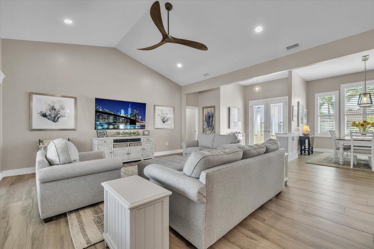 Welcome to this beautifully updated waterfront pool home in the highly sought-after Punta Gorda Isles (PGI) community. Nestled along a tranquil waterway on a quiet cul-de-sac, this single-story residence offers 2,439 sq ft of thoughtfully designed living space with 3 bedrooms and 2 bathrooms. The light, neutral exterior is complemented by a classic tile roof, paver driveway, and two-car garage, while new landscaping with fresh curbing and lush tropical plants enhances the serene coastal appeal. Boating enthusiasts will love the 81' of waterfront, complete with a city-maintained concrete seawall, concrete dock with new pilings, water and electric hook-ups, and an updated 10,000-lb remote boat lift. Quick access to open water—just 15 minutes—to Charlotte Harbor and the Gulf of Mexico makes this property a true waterfront gem. Step through double etched-glass front doors into a welcoming foyer leading to the bright great room with soaring vaulted ceilings, recessed lighting, and wide-plank flooring. The open layout connects the dining area and beautifully updated kitchen, creating ideal flow for living and entertaining. Eight-foot disappearing sliders frame peaceful water views and open directly to the pool area. The kitchen combines elegance and functionality with crisp white shaker cabinetry, top-of-the-line KitchenAid appliances including beverage refrigerator, a Jenn-Air cooktop, and Quartzite countertops. A center island with casual seating, pendant lighting, textured tile backsplash, and custom range hood provide striking details. A cozy dinette opens to the pool, ideal for indoor-outdoor living. The spacious primary suite offers plush carpeting, two custom walk-in closets, and direct lanai access with serene pool and canal views. The spa-inspired primary bathroom features a large walk-in shower with floor-to-ceiling marble-style tile and frameless glass, a dual-sink Quartz vanity with ample storage, and a freestanding soaking tub beside bright plantation-shuttered windows—creating a peaceful retreat. A split-bedroom floor plan ensures guest privacy, with two generously sized bedrooms featuring built-in closets; one offers direct pool access. The updated guest bathroom includes a walk-in shower with floor-to-ceiling tile, modern frameless glass enclosure, and stylish vanity with marble-style countertop and upgraded lighting. Plantation shutters and warm wood-look flooring create a bright, inviting space. Step outside to your private oasis, where a covered lanai with ceiling fans provides year-round comfort. In 2020, the pool was resurfaced and the brick paver decking extended, creating a seamless flow throughout the outdoor space. Enjoy a sparkling saltwater heated pool enclosed by a new panoramic pool cage, with ample deck space for sunbathing and entertaining—perfectly capturing the essence of Florida outdoor living. Additional highlights include an inside laundry room with extra storage and laundry sink, washer and dryer, water heater & tankless hot water heater supplies primary bath (2020), water softener (2020), pool heat pump (2019), plantation shutters, cement tile roof, irrigation, all new hurricane impact windows and doors, and wood-look tile throughout the main living spaces. Ideally located near I-75/US41, Fishermen's Village, downtown Punta Gorda, Saint Andrews Golf Course, and world-class boating, fishing, and sailing. **PLEASE ENJOY THE 3D INTERACTIVE VIRTUAL TOUR ASSOCIATED WITH THIS LISTING**