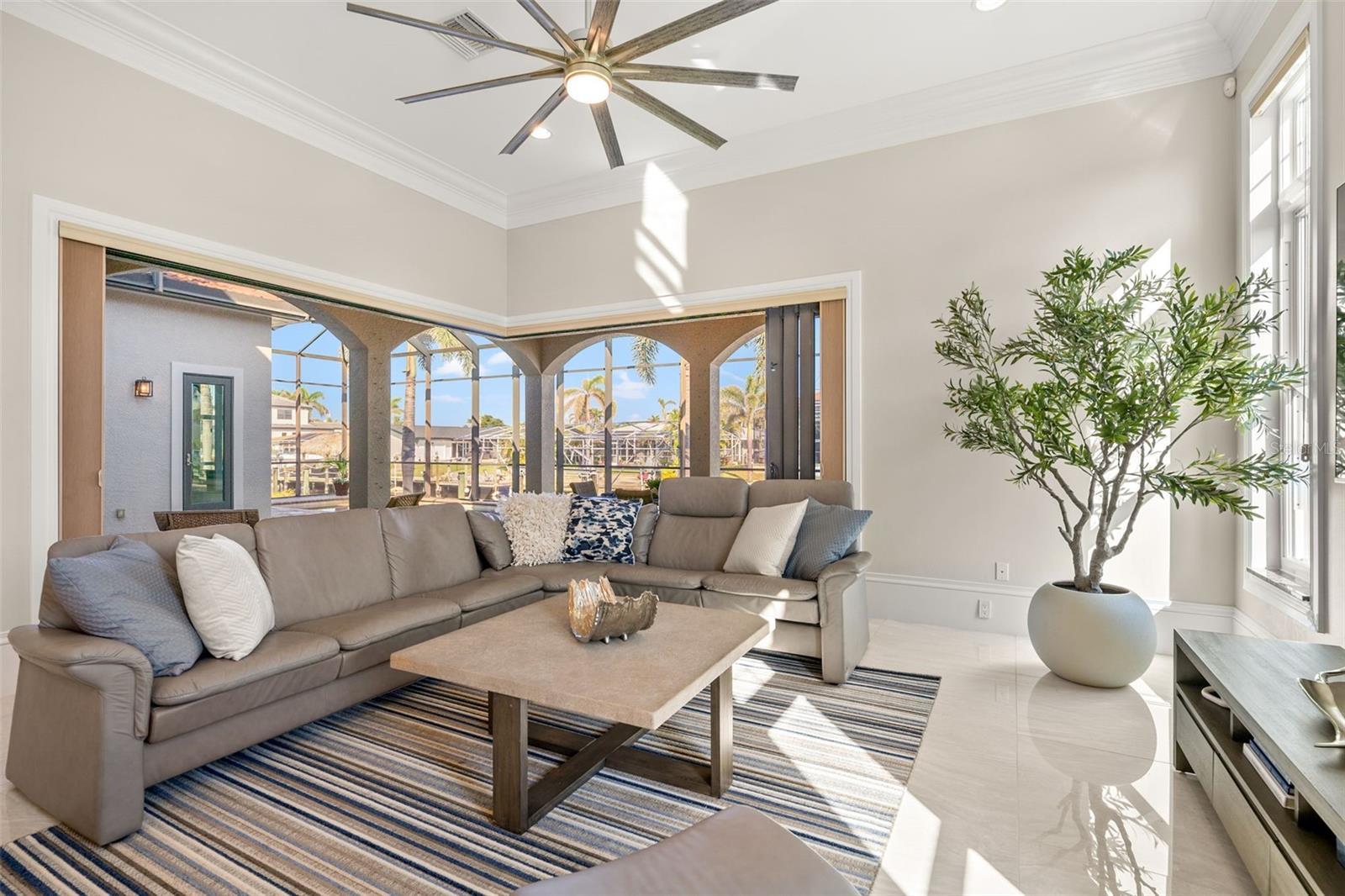 Welcome to 123 SW 53rd St, a one-of-a-kind Direct Sailboat Gulf Access estate offering the ultimate in Southwest Florida waterfront living. This 5-bedroom, 6-bathroom home spans over 3,500 sq ft and sits on nearly half an acre with 160 feet of direct sailboat access along a wide canal. The property includes two beautifully landscaped lots. One is fully fenced with a large paver patio and separate buildable parcel. Boaters will appreciate the full-length captain’s walk, 20,000 lb and 7,000 lb lifts, and quick access to open water. Inside, the home has been fully remodeled with high-end finishes while preserving its Mediterranean charm. Elegant details include crown molding, 12-inch baseboards, recessed lighting, and sophisticated flooring throughout. The primary suite is amazing, with tall ceilings, natural light, lanai access, and a luxurious en suite bath with marble walls, a soaking tub, and a glass-enclosed shower. Upstairs, three guest suites each have private bathrooms, including one with a balcony overlooking the pool and canal. A fifth bedroom on the main level features floor-to-ceiling windows. Centered around a stunning courtyard-style pool and spa, the home is built for relaxation and entertaining. The resort-style outdoor space includes a tanning shelf, built-in spa, custom lighting, and a screened enclosure. The lanai is equally impressive with wood-paneled ceilings, an outdoor kitchen, and a pool bath. The chef’s kitchen is outfitted with custom cabinetry, two-tone quartz counters, Viking gas range, Sub-Zero fridge with matching panels, drink drawers, and dual sinks. A butler’s pantry with glass-front cabinets adds extra storage and bar space, and the formal dining room includes a hidden storage area behind wainscoting. The family room opens to the lanai through zero-corner sliders, and the living room offers built-in shelving, backlit arches, and a gas fireplace. A flex loft upstairs provides an ideal home office space. Additional features include impact windows and doors, a three-car garage, circular paver driveway, a hurricane screen, and a $150,000 solar system that keeps electric bills around $40/month. This home has NEVER FLOODED in any storm. Located at the end of a quiet cul-de-sac, just minutes from Tarpon Pointe, Cape Harbour, and downtown Cape Coral. A rare opportunity for luxury, privacy, and quick Gulf access in one of the city’s most sought-after neighborhoods.