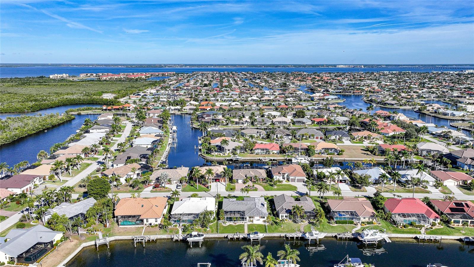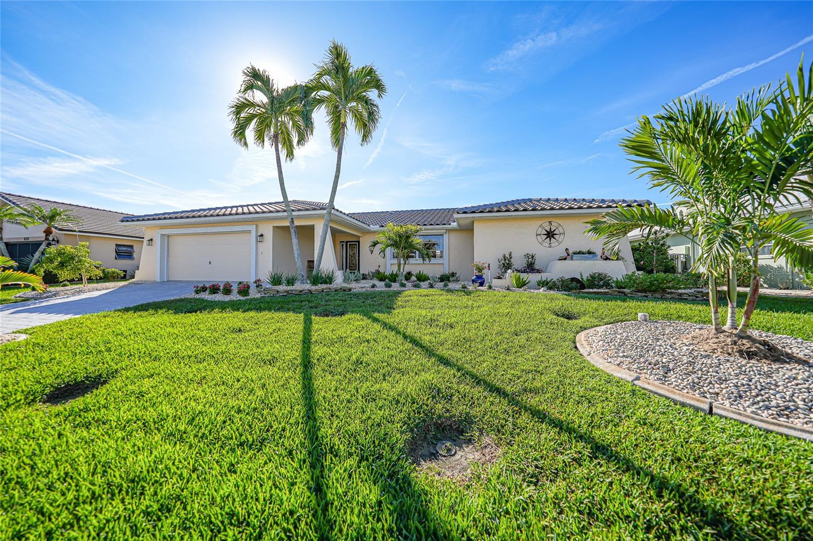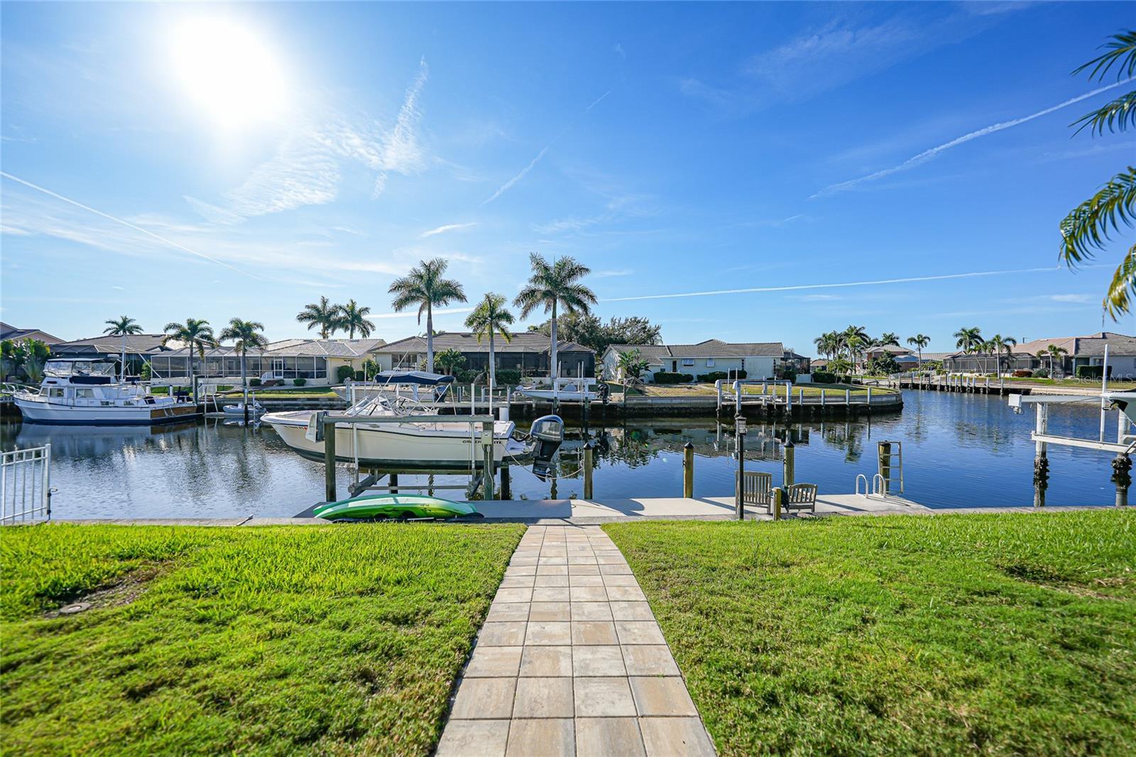 Punta Gorda Isles sailboat water at its best with quick access to open water. From the moment you arrive, this almost 2300 sqft furnished home welcomes you with a sense of warmth, elegance, and quiet sophistication. Tucked away on a peaceful street, this freshly painted three-bedroom, two-bath sailboat waterfront residence with pool and southern exposure has been lovingly maintained and thoughtfully reimagined to celebrate both comfort and coastal waterfront living living. A beautifully composed floor plan draws your eye outward, with tranquil pool and intersecting canal views with 45 foot dock and 10k lift showcased from nearly every room. The family room serves as an inviting centerpiece, anchored by a stunning cut-stone gas fireplace and mirrored wet bar—an ideal setting for intimate gatherings or relaxed evenings at home. It flows effortlessly into the remodeled kitchen, stainless steel appliances, rich wood cabinetry, gleaming granite countertops, and tumbled stone backsplashes create a space as functional as it is refined. Throughout the home, bamboo wood flooring and artfully placed recessed lighting enhance the natural textures and timeless finishes. Coordinating granite and cabinetry extend through the guest bath, laundry room, and wet bar, while the primary bath offers a private spa-like retreat, complete with antique-glazed cabinetry, granite countertops, and a jetted soaking tub—perfect for unwinding as the day fades into evening. Walls of pocketing sliding glass doors dissolve the boundary between indoors and out, opening the primary bedroom and living areas to a generous covered lanai and pool terrace. Here, expansive canal views provide a breathtaking backdrop for sunrise coffees, sunset gatherings, and endless moments of waterfront serenity. Thoughtful enhancements include crown molding, a brick-paver pool deck, a pass-through kitchen window with hand-painted outdoor cabinetry and refrigerator, hurricane shutters, a propane-powered whole house generator was added in 2021, ensuring both beauty and peace of mind. New roof and a/c in 2025. Tastefully remodeled yet offering the opportunity to add your own signature touches, this exceptional waterfront home is a rare opportunity where elegance, comfort, and value converge—waterfront living at its most attainable and inspiring. This house has never had flooding.
