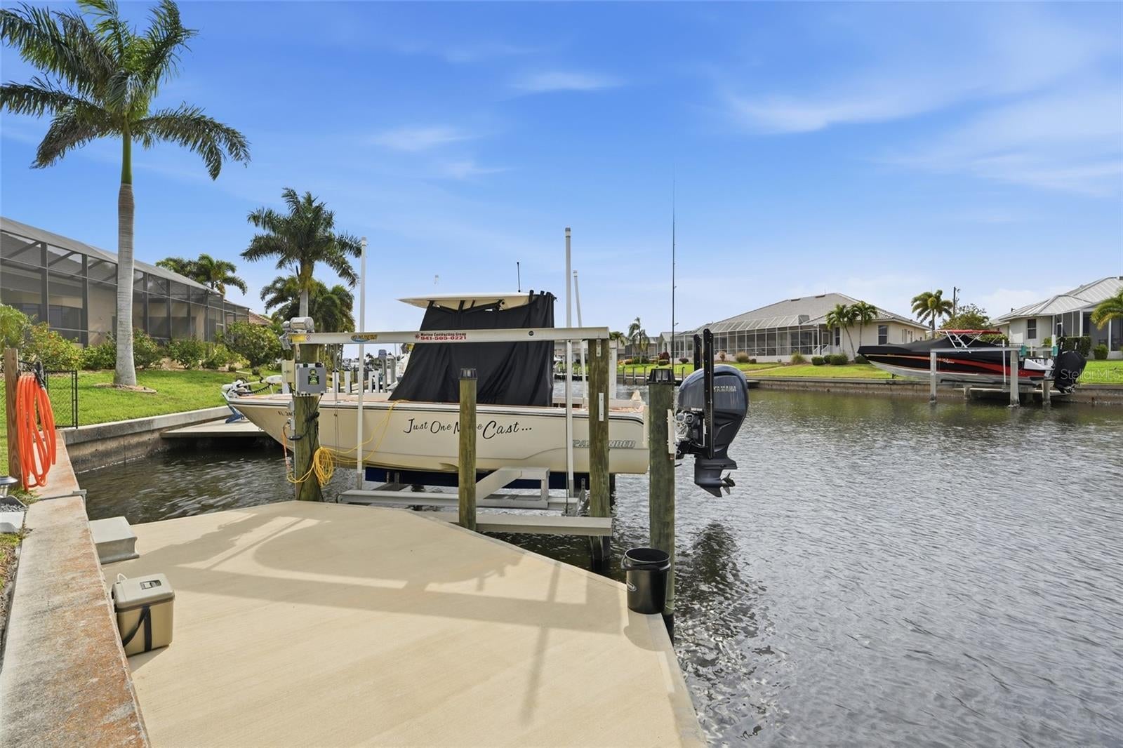 Experience refined WATERFRONT living in this exceptional 3-bedroom, 3-bath, 3-car garage pool home situated on an OVERSIZED CORNER LOT in the heart of Punta Gorda Isles. Offering 50 FEET of prime waterfrontage, this property features a private 7'x9' concrete dock with electricity, water, and a 9,000-LBboat lift, providing effortless access for boating, fishing, or simply enjoying serene canal views. NO HOA FEES! CLICK ON THE VIRTUAL TOUR LINK 1 FOR THE VIDEO AND VIRTUAL LINK 2 FOR THE 3D TOUR. A charming front patio with French door entry welcomes you into a bright, open interior highlighted by high coffered ceilings, stunning water views, and wood flooring throughout, complemented by luxury vinyl in the laundry room and bathrooms. The expansive living room is designed for seamless indoor-outdoor living, with a large slider opening to the lanai and framing picturesque water views. The gourmet kitchen is a true centerpiece, appointed with stainless steel appliances including a built-in double oven and cooktop, quartz countertops, a tiled backsplash, a generous island with breakfast bar, abundant cabinetry, and a walk-in pantry with custom shelving. Just off the kitchen, the dinette features a large picture window—perfect for enjoying water-view dining. The spacious primary suite is a private retreat, offering lanai access through a glass slider, a large walk-in closet, and a luxurious en-suite bath with dual sink vanity, separate makeup vanity, and walk-in shower. Designed with a split-bedroom floor plan, the guest accommodations provide exceptional privacy, including a second primary suite with built-in closet, en-suite bath with walk-in shower, and direct lanai access. An additional office/flex space offers versatility to suit your lifestyle—ideal for a home office, media room, home gym, or additional guest space. Step outside to a paver lanai designed as a true outdoor oasis, complete with an outdoor kitchen, wet bar, and outdoor shower—perfect for entertaining or unwinding poolside. The heated saltwater pool allows for year-round enjoyment, with ample deck space for soaking up the Florida sun. Whether you’re casting a line from your backyard dock or setting sail for open water, this waterfront residence delivers the ultimate Punta Gorda Isles lifestyle, blending luxury, comfort, and coastal living at its finest. 2022 TILE ROOF - IMPACT WINDOWS (except lanai picture window) & DOORS (except slider) - ELECTRIC SHUTTERS ON LANAI - 24-KW WHOLE HOME GENERATOR w 500 GAL BURIED PROPANE TANK - PLANTATION SHUTTERS. Enjoy all the amenities that Punta Gorda has to offer, such as biking, fishing, boating, dining, live entertainment, and much more! Close to Fisherman's Village, Ponce De Leon Park, Gilcrest Park, and Historical Downtown Punta Gorda. Also, minutes to award-winning beaches such as Englewood Beach, Manasota Key & Stump Pass, to name a few!! Schedule your private tour TODAY!