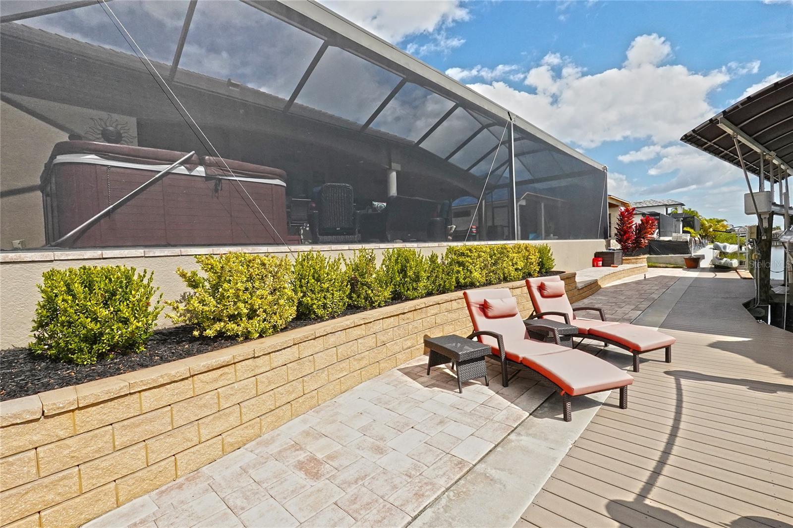 TRUE FLORIDA Living in this Luxury home. Custom built by Sinclair Homes. Southern Exposure, sellers say only 30 minutes to open water. Situated on an oversized 90x125 lot along the Santanita Canal with 1 bridge. This 4-bedroom home (3 bedrooms plus den/office) offers an open floor plan with Zero-Corner sliders, soaring ceilings, 8-foot solid doors, travertine flooring, crown molding, tray ceilings, and custom lighting and fans throughout. The kitchen features soft-close cabinetry, extended center island, leathered granite countertops throughout the home, wine fridge, and bar sink. Laundry room includes cabinetry and sink. The primary suite has lanai access, two walk-in closets with motion lighting, Jacuzzi tub, walk-around multi-head shower, heated towel rack, and bidet toilet. All secondary bathrooms include GFI outlets for future bidet installation. Outdoor living includes a picture-frame screened lanai, gas-heated pool, 7-person spa, outdoor kitchen with built-in gas grill, bar sink, leathered granite countertops, and LED lanai lighting. Home is powered by a 500-gallon buried propane tank with gas line extended to the dock for future fire pit and prewired for a whole-house generator. Oversized composite dock with lighting, tiki hut, covered boat lift canopy accommodating up to a 32-foot boat. Additional features include a 3-car garage with epoxy floors, dedicated A/C, custom storage, walk-up attic with spray foam insulation, water softener, heavy-duty water tank, two A/C units, irrigation system, built-in surround sound in great room and lanai, and extensive storage throughout. Professionally maintained pool, landscaping, and pest control. All city assessments paid in full. Convenient to shopping and restaurants.