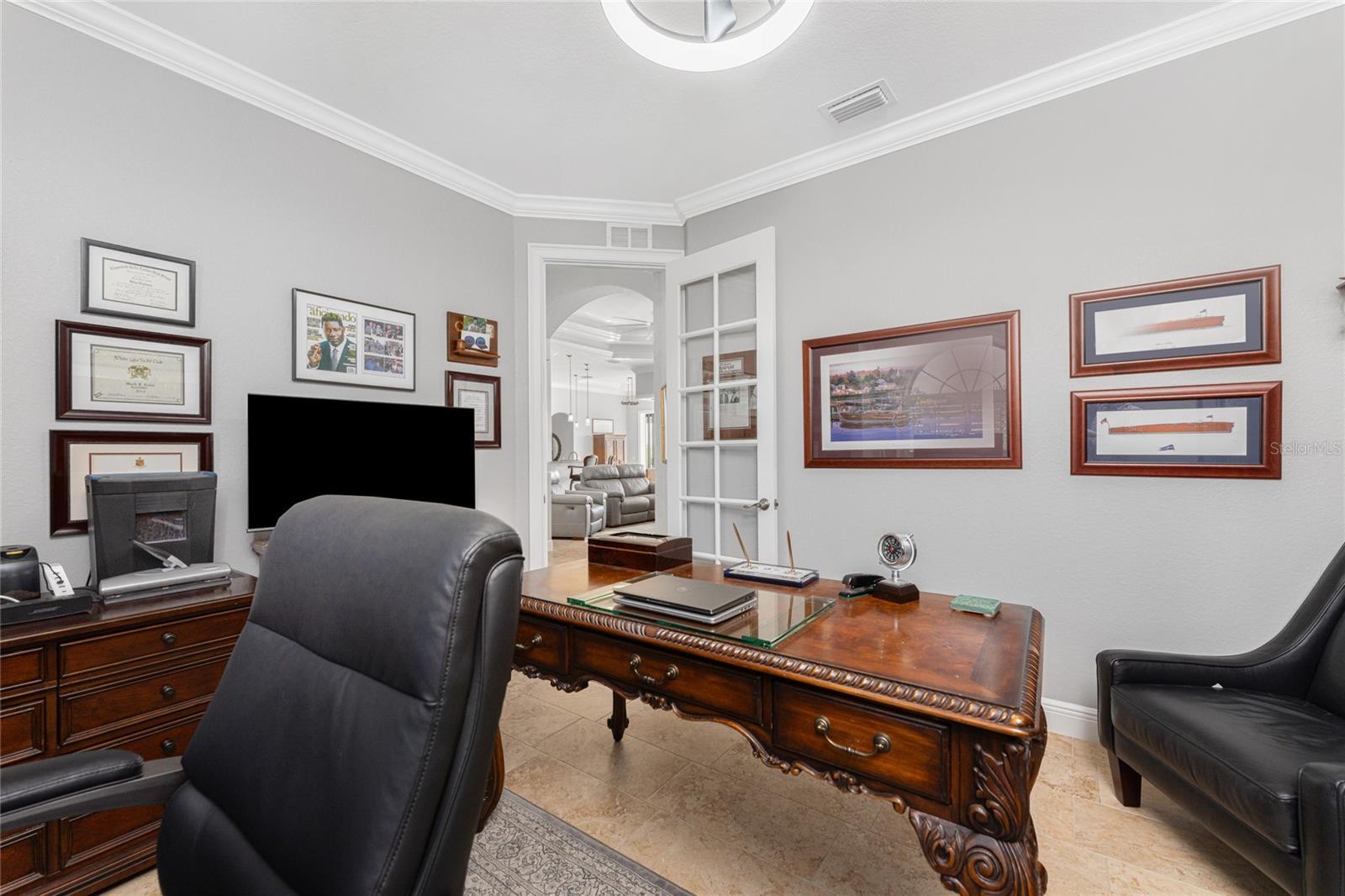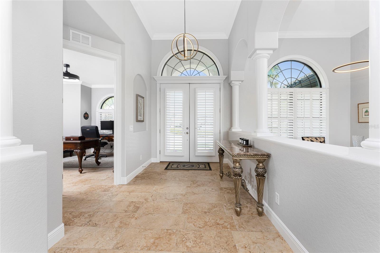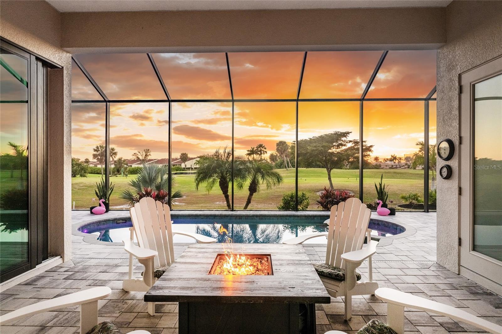 This beautiful custom crafted home offers the perfect blend of style, quality, and effortless indoor-outdoor living, set on an oversized lot overlooking the eighth fairway of the private St. Andrews South Golf Club. Built in 2018, the home welcomes you with soaring thirteen foot ceilings, tile flooring throughout, elegant architectural details, and abundant natural light. The open great room showcases a striking double tray ceiling and flows seamlessly into the gourmet kitchen, featuring rich wood cabinetry, granite countertops, GE stainless steel appliances, and a sunlit sitting or dining area. Expansive disappearing and zero-corner glass doors erase the boundary between indoor and outdoor living, opening the space for relaxed living and entertaining. The spacious primary suite features a double tray ceiling, two walk-in closets, and a luxurious ensuite bath with a soaking tub, walk-in shower, and dual-sink wood vanity topped with granite. Two generously sized guest bedrooms are nicely paired with beautifully appointed bathrooms highlighting wood cabinetry and granite countertops, including a convenient pool bath - perfect for hosting family and guests in comfort and style. A refined and versatile office or den offers an ideal retreat for working from home, enjoying media, or quiet time alone. Step outside to your private oasis, where a sparkling pool and spa is surrounded by new brick pavers, lush tropical landscaping, and an expansive lanai complete with a fully equipped summer kitchen featuring a built-in grill, sink, and refrigerator—perfect for year-round entertaining. Enjoy morning coffee or unwind with an evening cocktail while watching golfers pass along the picturesque fairway. Additional features and enhancements include a new 2025 barrel tile roof with transferable warranty, crown molding throughout, plantation shutters, hurricane-impact windows, a recently enlarged brick-paver driveway, a 3-car garage with epoxy-finished flooring, new lighting fixtures and ceiling fans, new pool mechanicals in 2025, professionally painted in 2025 and no HOA or fees. Bright, open, and impeccably maintained, this exceptional home is designed for both everyday comfortable living and memorable entertaining.