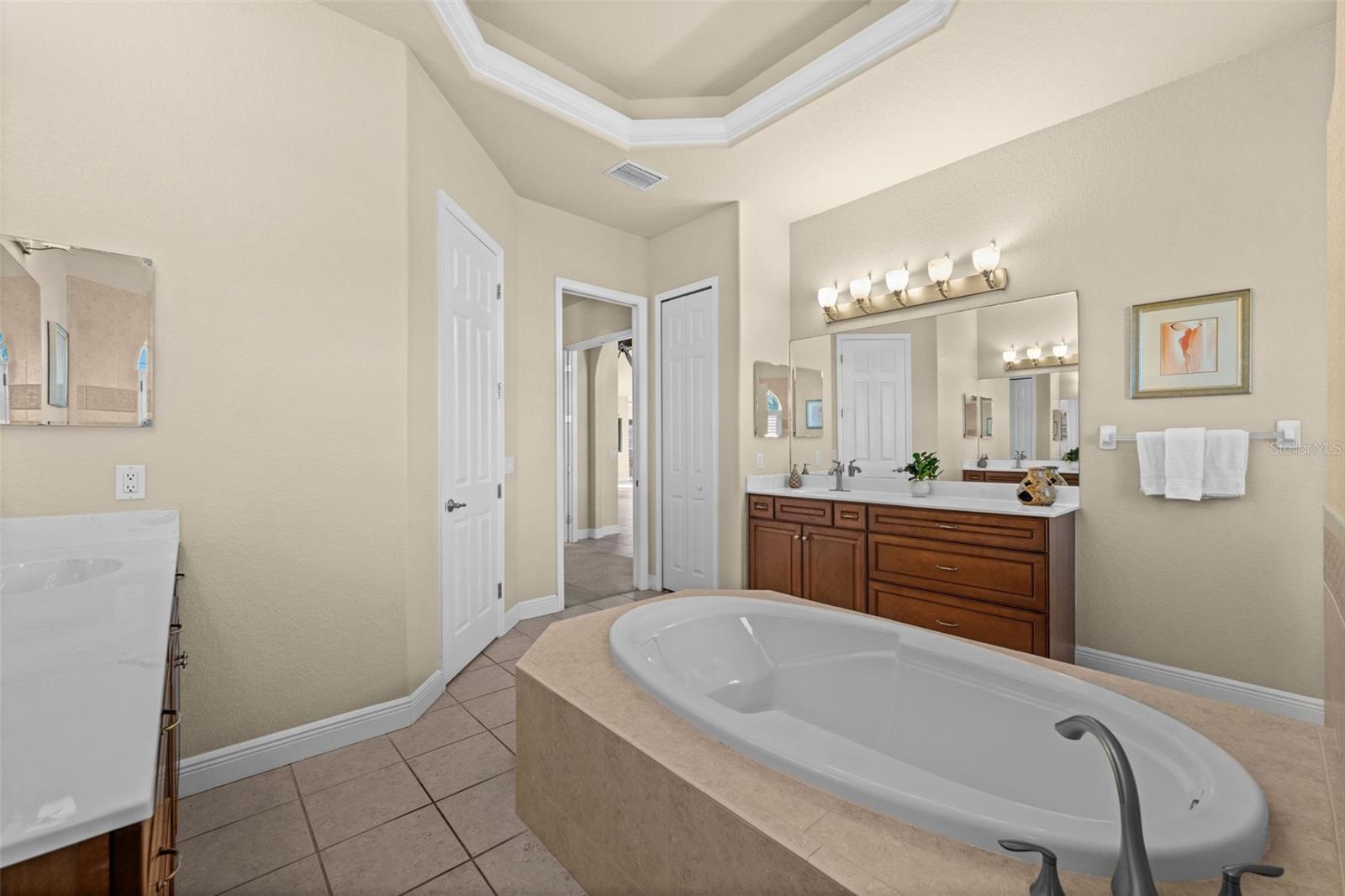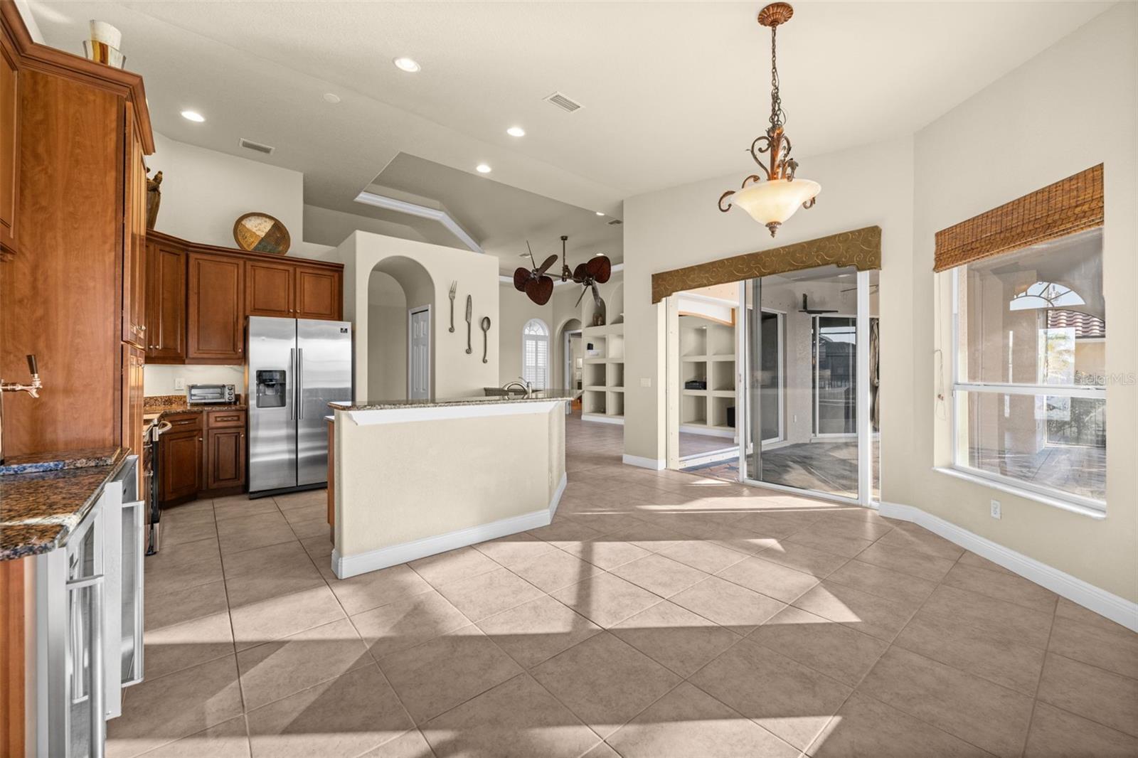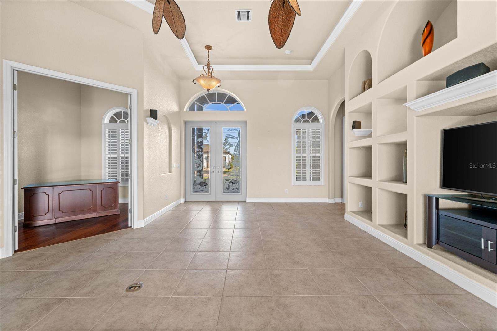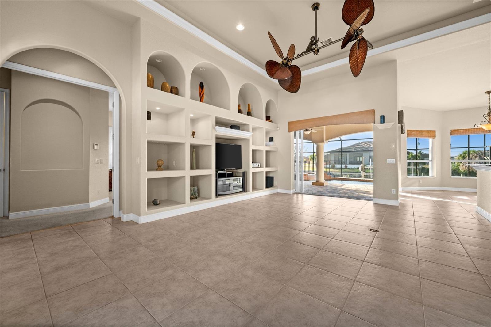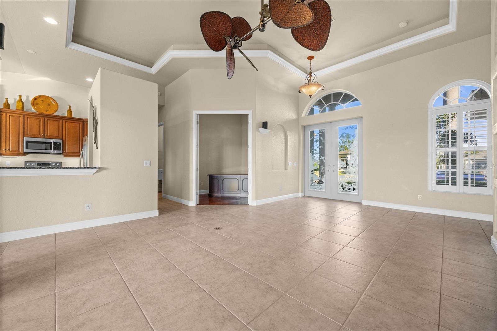 - Built-in Features, Ceiling Fans(s), Eat-in Kitchen, High Ceilings, Living Room/Dining Room Combo, Other, Primary Bedroom Main Floor, Stone Counters, Tray Ceiling(s), Walk-In Closet(s)