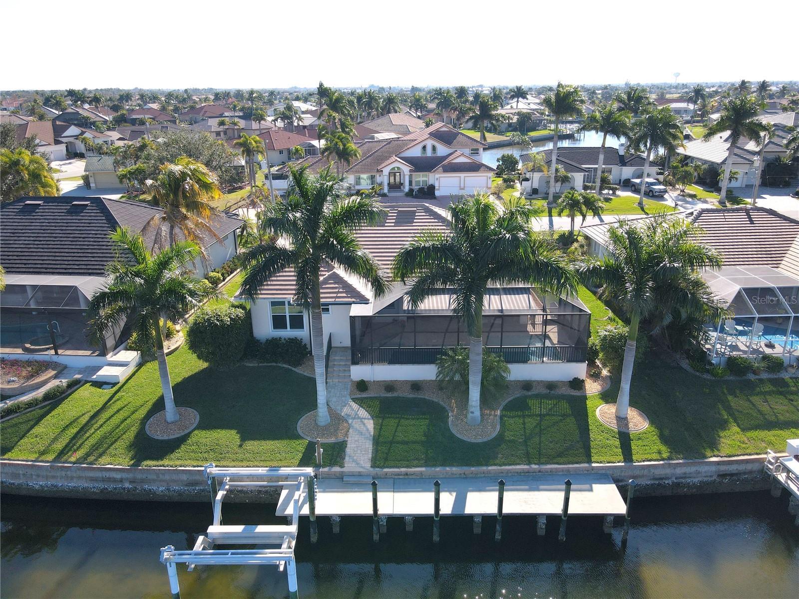 Welcome to Burnt Store Isles subdivision where every home is either a waterfront home or a golf course home. This 3 bedroom, 2 bath, 2 1/2 car garage with a pool has everything that you could possibly want already added to this 2020 ICF (Insulated Concrete Form) home. The curb appeal is obvious as soon as you drive by and you will find the inside is even more immaculate. There are so many upgraded add ons that I hope not to forget any. Starting with hurricane protection around the entire house with 6 manual roll downs for all the windows and 5 electrical roll downs for the lanai area, the front entry porch and both garage doors. A full house 22 KW Generac Automatic Generator with a 500 gallon tank already installed. The entry sidewalk and driveway is wider than normal and then you pull into the massive garage. The garage is 24 ft deep instead of the standard 21 ft deep. It is 29 ft. wide instead of the standard 21 ft. wide so there is a workshop area for all the toys, golf cart or simply additional storage. The garage is also taller than most and there is already 2 large commercial hanging systems for additional storage and plenty of room to add more. A water softener is already installed along with a whole house water filtration system. The pool is 31 ft long which is perfect for swimming laps and is already heated and the saltwater transition has already been done. A large sitting area in the pool is at one end for relaxing or having a glass of wine with friends and family. The dock has been lengthened to a 45 ft concrete dock with a 14,000 lb lift equipped to handle sailboats, pontoons or regular cruising vessels. The pool area has a great view of the canal water ways and has 2 overeaching electrical canopy's that extend up to 10 ft. so you can either sit in the sun or shade all day long based on your personal choice. When you go inside you are welcomed by a great room atmoshpere that combines the living room, kitchen and dinette. The view from the front door allows you to also look straight into the pool lanai area and the water ways out back. It just seems like Florida as soon as you walk in. The kitchen has plenty of cabinet space with all soft close doors and drawers. The kitchen is finished off with matching GE stainless steel appliances with a induction stove and quartz countertops. A whole house trim package of 5 inch baseboard and 3 inch door trim finishes off all 8 ft interior doors. The primary bedroom and both bedroom #2 and #3 have walk in closets. Both bathrooms have spacious walk in showers and bathroom #2 has access directly to the pool as well. The primary bathroom has a his and her sink set up. Large format wood looking porcelain tile is in all living areas, with carpet in the primary bedroom and bedroom #2. Plantation shutter window coverings are throughout the entire house and a 3 sliding pocket door entrance to the lanai and pool area has a retractable screen for ease of use. Location of this home is fantastic as a Publix Shopping Center and Home Depot are right at the entrance of the neighborhood. A Walmart and downtown Punta Gorda is just minutes away with all the historical sites to visit and enjoy while dining and going to our frequent festivals downtown and traditional things such as the Christmas Tree lighting, the Saturday morning farmers market or having fun at the park right on the Charlotte Harbor. Pickleball courts and golf courses all around the area for you pleasure as well.