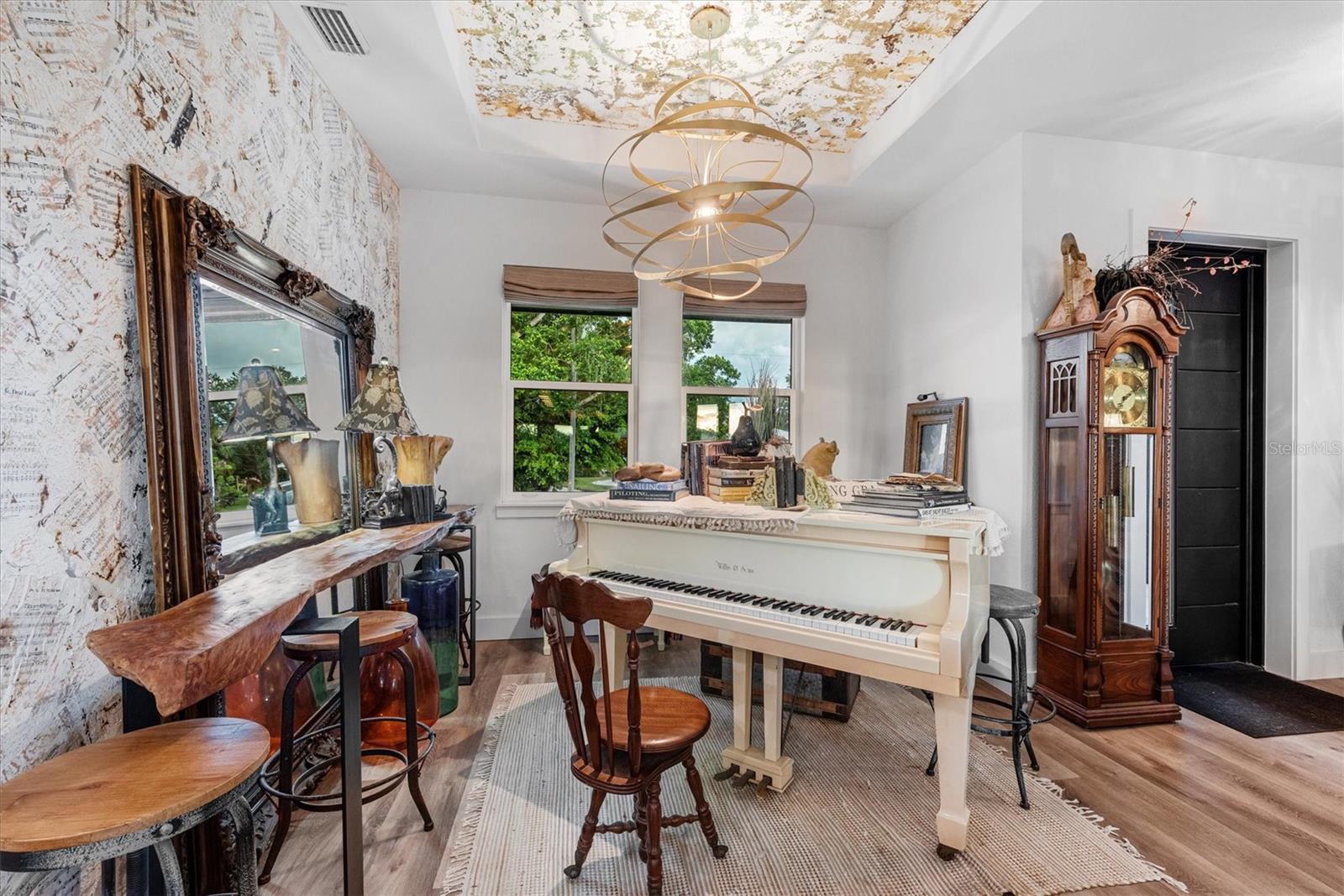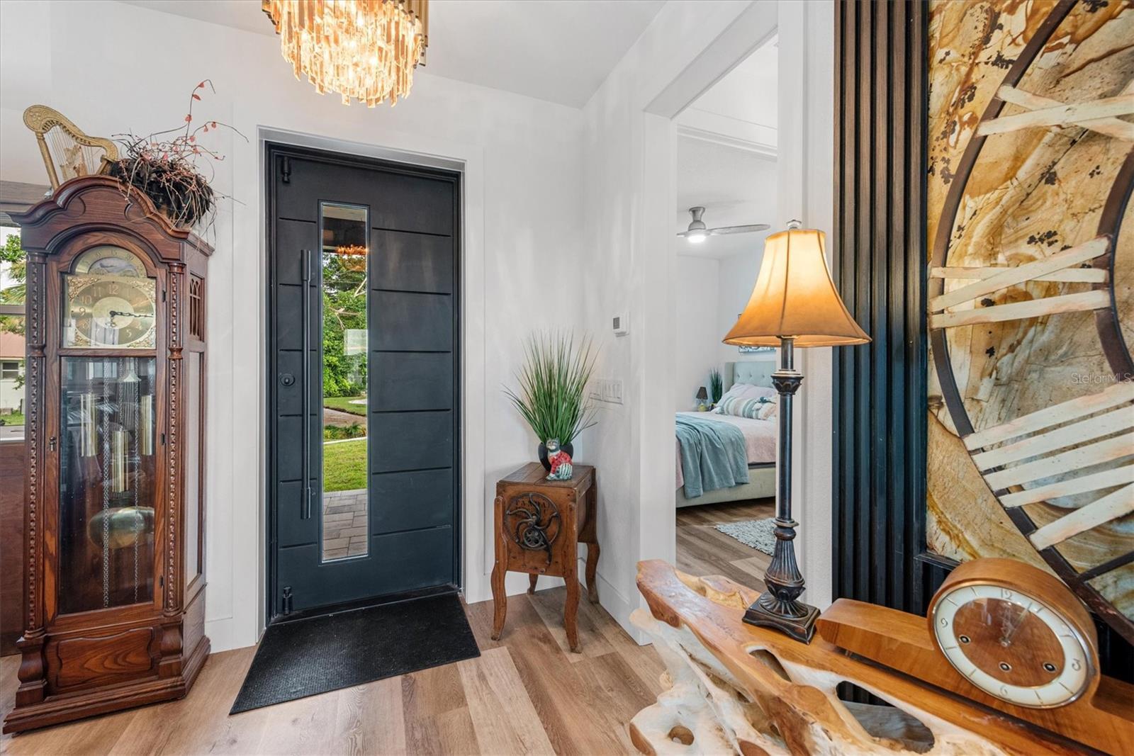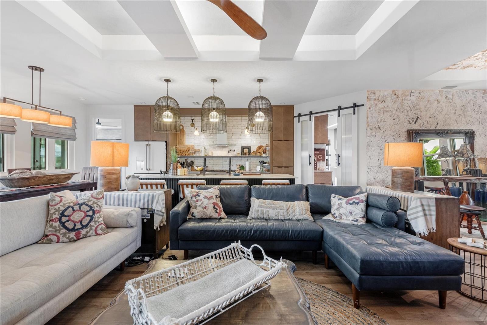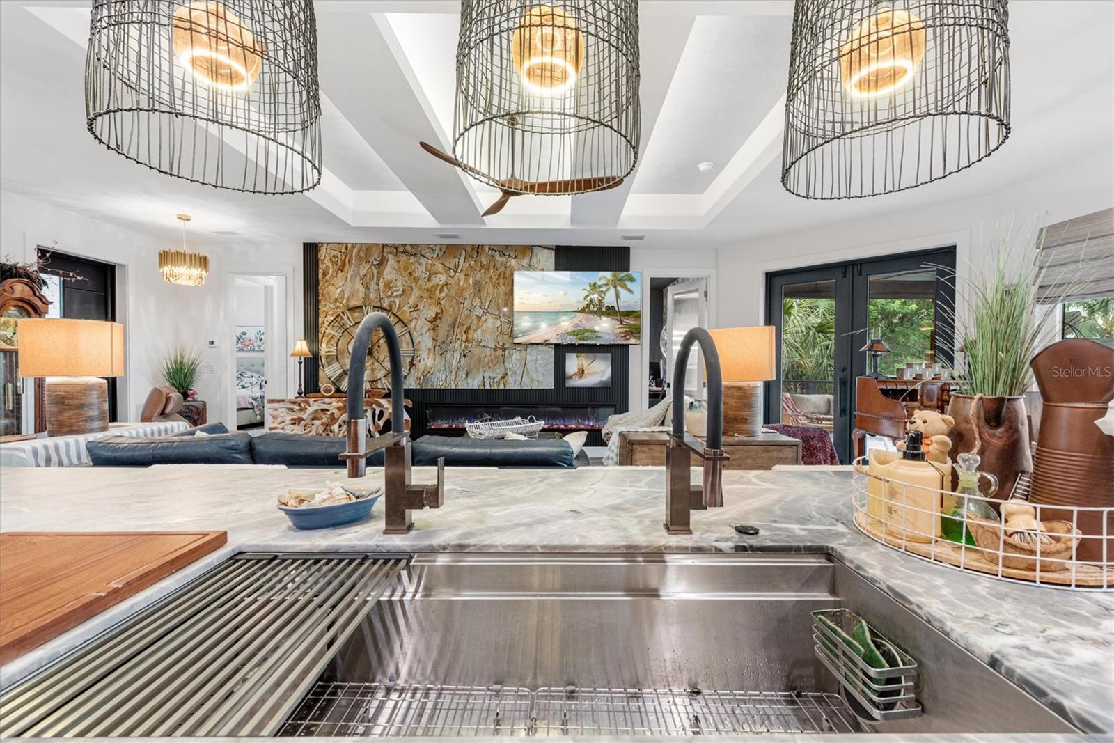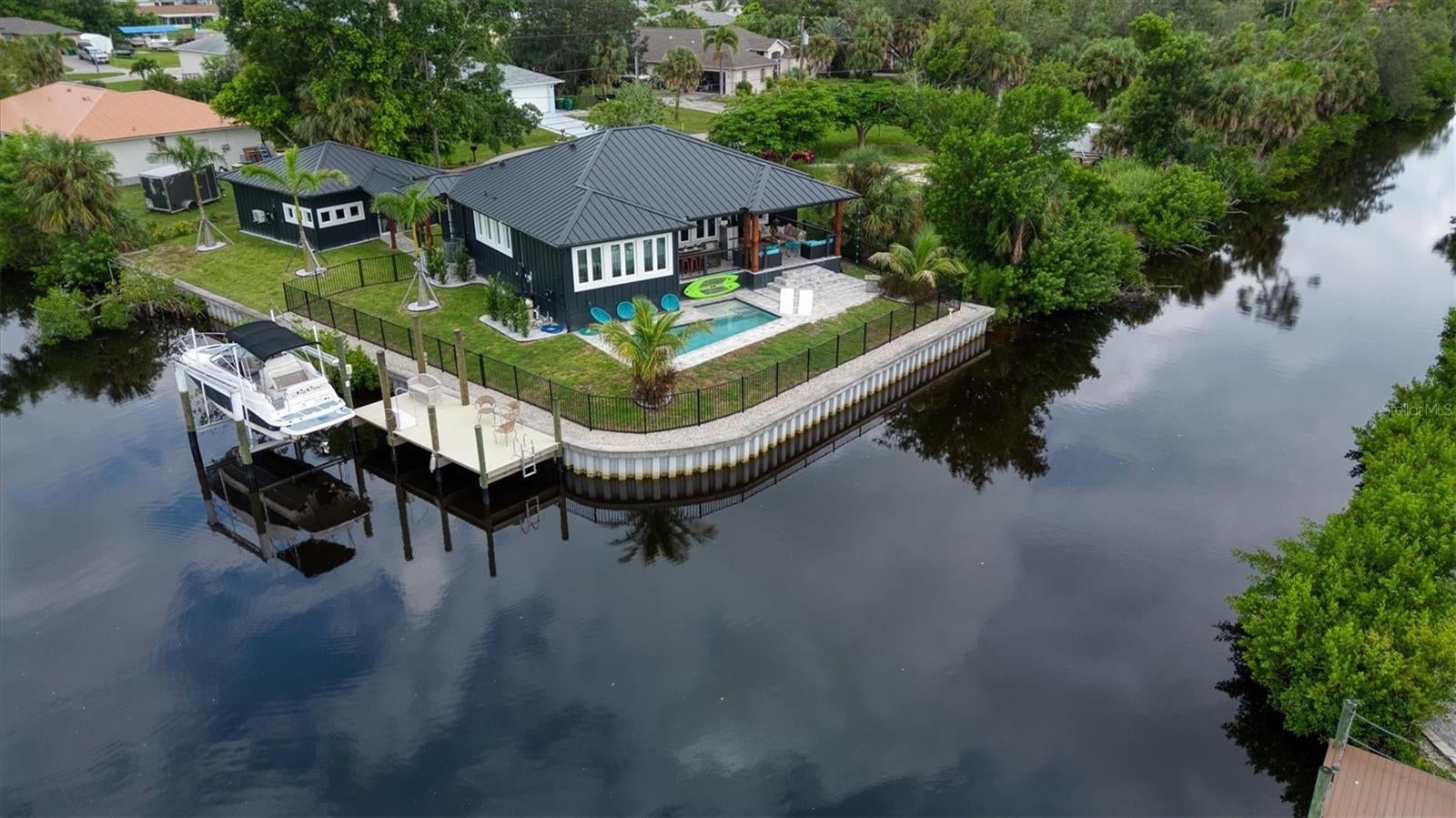 A One-of-a-Kind TREND SETTING Masterpiece on the Water! Welcome to 3001 Banyan Way, Punta Gorda, completed in 2024, where architectural artistry meets uncompromising luxury. Set on a prime waterfront lot with intersecting canal views, 211 feet of seawall, and remarkable sunsets, this residence was crafted with every imaginable upgrade to create a true designer dream home. Simply stunning! From the moment you arrive, the curb appeal is undeniable— ultra modern and powerful exterior colors inspire the senses. A visual delight are the many exterior accents including Hardi Trim Board and Batten cement siding, an expansive lighted retaining wall, offset garage and connecting breezeway with smart wood beam pillars. Professional landscaping with designer lighting, an interlocking three-piece paver driveway and an iron fence with three locking gates frame the back of the property all the way to the seawall. Step onto the Chicago replica brick front porch, beneath a tongue-and-groove ceiling with recessed lighting, and through an impressive iron entry door. Inside, every room tells a story of craftsmanship and indulgence. The living room stuns with Venetian plaster tray ceilings, dramatic beams, a 100-inch linear fireplace, and a full quartzite feature wall. The gourmet kitchen is a showpiece: Dolomite Blue quartzite countertops throughout, GE Café matte white appliances including a six-burner propane range, two under-counter refrigerators, and full-height subway tile with a quartzite shelf. A walk-in pantry and adjoining laundry doubles as a bar and prep space, featuring cobalt blue GE smart appliances, built-in storage, a liquor drawer, and a chandelier-lit window seat. The master suite is a sanctuary with Venetian plaster finishes, custom ceiling design, and a spa-like bath offering a freestanding tub under chandelier light, a walk-through shower with body jets, double marble sinks, and artistic feature walls. Additional rooms showcase true individuality, including a music room adorned with gold-leaf stucco, a bespoke feature wall, and a dramatic chandelier. Outdoor living reaches resort level. A saltwater, heated PebbleTec pool with LED lighting is surrounded by an expansive paved entertainment deck. The covered rear porch features tongue-and-groove ceilings, an outdoor kitchen with grill and sink, recessed lighting, ceiling fans, and dual French iron doors that invite seamless indoor/outdoor living. At the water’s edge, the composite dock is built for the serious boater, with shore power, a 12,000-lb lift, and oversized pilings ready for a roof structure. Enjoy a 15 minute boat ride along the Venice Waterway to Alligator Creek, then to Charlotte Harbor and the Gulf beyond. Every detail is deliberate: spray foam insulation throughout, tankless water heater, hurricane-impact doors and windows, remote custom blinds, lighting integrated into the eaves and landscaping, the highest grade luxury vinyl plank and soap stone tile flooring, and a full-home generator with hook-up. The oversized 24’x24’ insulated garage is a marvel in itself, with epoxy floors, mini-split A/C, EV plug, storage system, and large windows framing canal views. This residence is more than a home—it’s a statement of taste, design, and lifestyle. Perfectly blending Old World materials with cutting-edge systems, 3001 Banyan Way is truly one of a kind Gem. Minutes from all that Punta Gorda has to offer, Fisherman’s Village, Harbor Walk, the Punta Gorda Yacht Club, and much more!