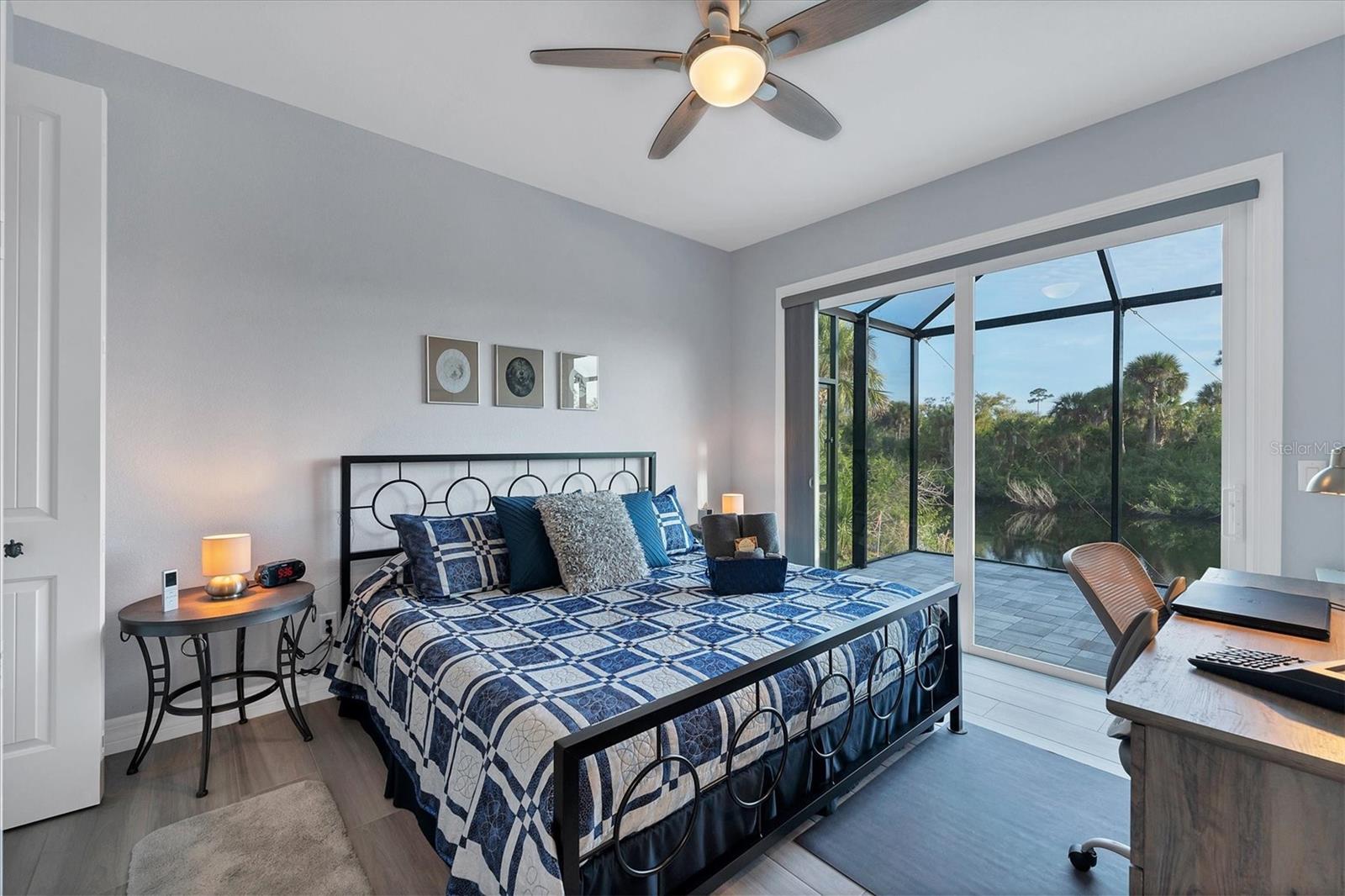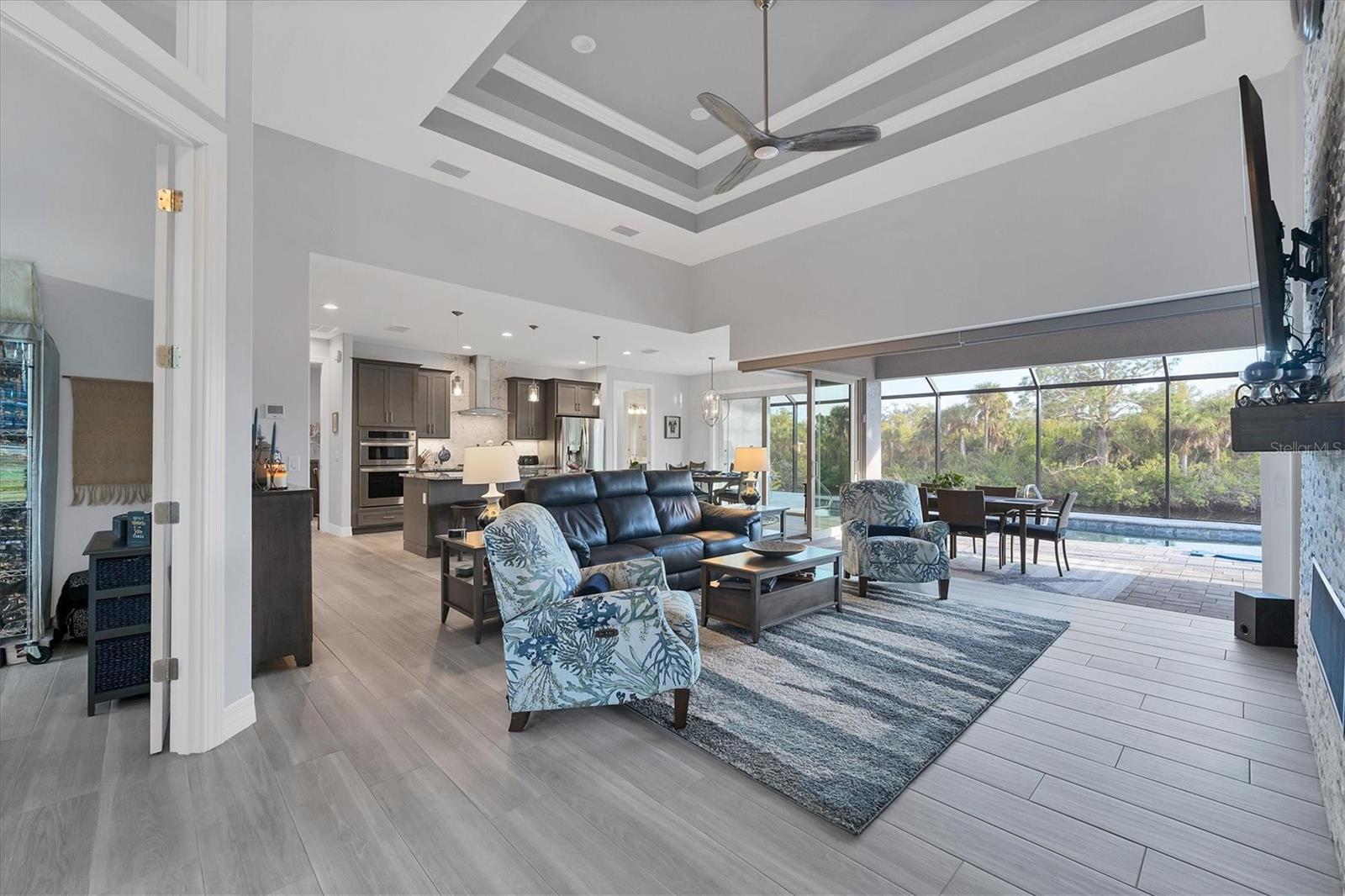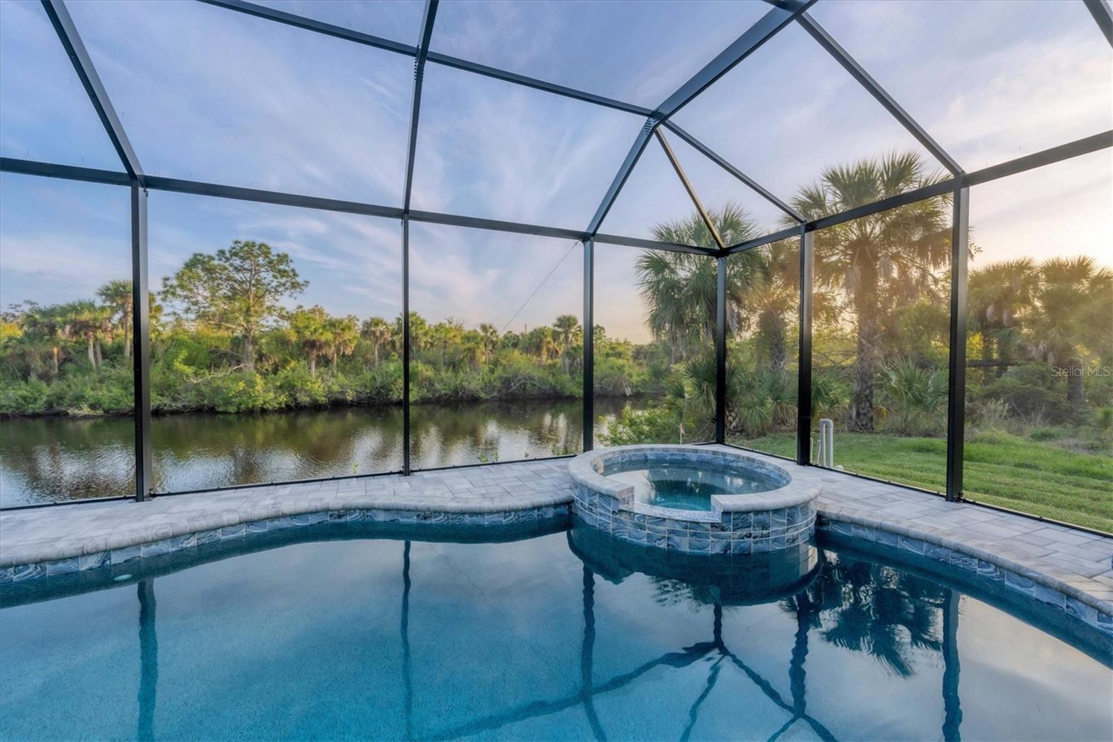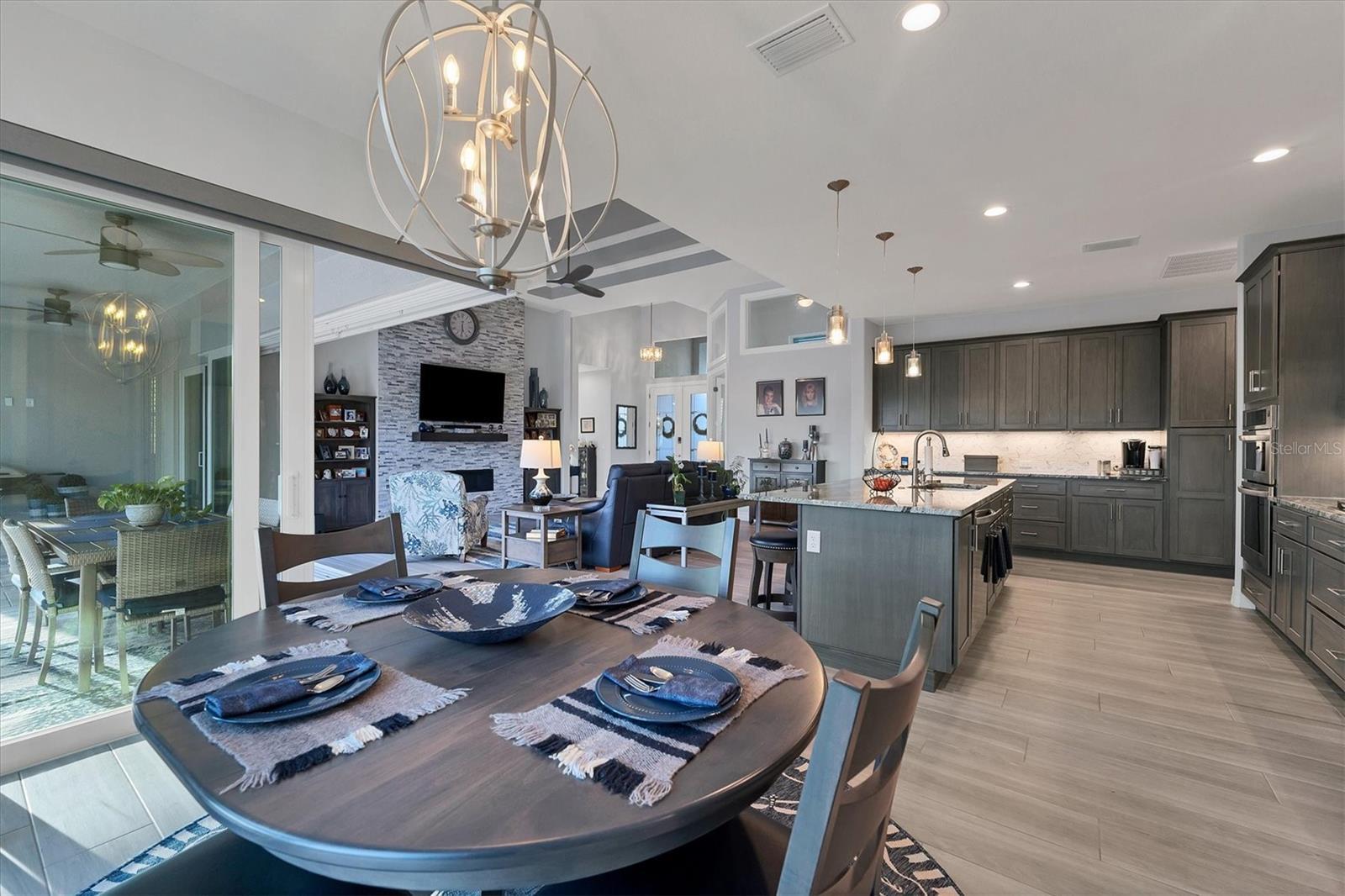 Stepping through the front door your eye is drawn to the beautiful, spacious interior, the pool right outside, and the water view beyond. Your first impression will be “Wow”, and the closer you look the more you will love it.This three-bedroom two-bath house has the open floor plan you want with the large kitchen, living area, and dining area combined as one. Slide the impact doors open and enjoy the large covered lanai for even more room. The owner’s suite is located on one side and the laundry room, garage, second bath and two bedrooms are on the other. The den is just to your left as you enter. This is a perfect place for someone who works from home or you could set up a cozy sitting area away from the main living area.This DM Dean home was completed in 2023 and is better than standard new construction in so many ways. If you purchase this home you will know the exact cost and it will be ready for you to move in the day you close. These are significant improvements over the new construction process. Beyond this, the list of upgrades is long and impressive. All are available in a list for you to review; many are obvious as you look through the house. The building is very energy efficient due to the spray foam insulation and impact windows. The flooring is upgraded plank look porcelain tile throughout. All shower entries are wide and with no barrier so it is easy for everyone. This house is equipped with a 500 gallon propane tank that is used for the whole house generator that will come on automatically when needed. The propane also feeds the fireplace, cook top, oven, and dryer. There custom closets, central vacuum, and upgraded appliances and cabinets speak to the overall quality of the home. This house is on a quiet street already and this property is a triple lot to ensure your privacy in the future. Audio/visual recording equipment may be in operation inside and outside the house.